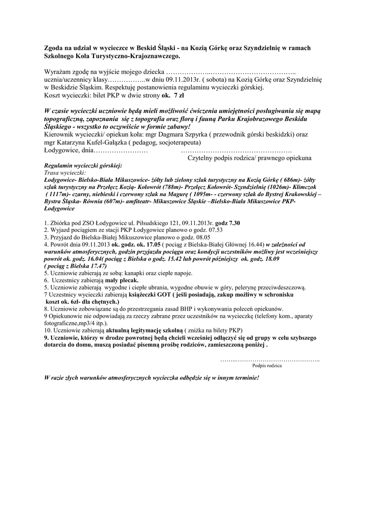 Zgoda na udział w wycieczce w Beskid Śląski - na Kozią Górkę oraz Szyndzielnię w ramach Szkolnego Koła Turystyczno-Krajoznawczego. Wyrażam zgodę na wyjście mojego dziecka ………………..……………………………….. ucznia/uczennicy klasy……………..w dniu 09.11.2013r. ( sobota) na Kozią Górkę oraz Szyndzielnię w Beskidzie Śląskim. Respektuję postanowienia regulaminu wycieczki górskiej. Koszt wycieczki: bilet PKP w dwie strony ok. 7 zł W czasie wycieczki uczniowie będą mieli możliwość ćwiczenia umiejętności posługiwania się mapą topograficzną, zapoznania się z topografia oraz florą i fauną Parku Krajobrazowego Beskidu Śląskiego - wszystko to oczywiście w formie zabawy! Kierownik wycieczki/ opiekun koła: mgr Dagmara Szpyrka ( przewodnik górski beskidzki) oraz mgr Katarzyna Kufel-Gałązka ( pedagog, socjoterapeuta) Łodygowice, dnia…………………… …………………………………………. Czytelny podpis rodzica/ prawnego opiekuna Regulamin wycieczki górskiej: Trasa wycieczki: Łodygowice- Bielsko-Biała Mikuszowice- żółty lub zielony szlak turystyczny na Kozią Górkę ( 686m)- żółty szlak turystyczny na Przełęcz Kozią- Kołowrót (788m)- Przełęcz Kołowrót- Szyndzielnię (1026m)- Klimczok ( 1117m)- czarny, niebieski i czerwony szlak na Magurę ( 1095m- - czerwony szlak do Bystrej Krakowskiej – Bystra Śląska- Równia (607m)- amfiteatr- Mikuszowice Śląskie –Bielsko-Biała Mikuszowice PKPŁodygowice 1. Zbiórka pod ZSO Łodygowice ul. Piłsudskiego 121, 09.11.2013r. godz 7.30 2. Wyjazd pociągiem ze stacji PKP Łodygowice planowo o godz. 07.53 3. Przyjazd do Bielska-Białej Mikuszowice planowo o godz. 08.05 4. Powrót dnia 09.11.2013 ok. godz. ok. 17.05 ( pociąg z Bielska-Białej Głównej 16.44) w zależności od warunków atmosferycznych, godzin przyjazdu pociągu oraz kondycji uczestników możliwy jest wcześniejszy powrót ok. godz. 16.04( pociąg z Bielska o godz. 15.42 lub powrót późniejszy ok. godz. 18.09 ( pociąg z Bielska 17.47) 5. Uczniowie zabierają ze sobą: kanapki oraz ciepłe napoje. 6. Uczestnicy zabierają mały plecak. 5. Uczniowie zabierają wygodne i ciepłe ubrania, wygodne obuwie w góry, pelerynę przeciwdeszczową. 7 Uczestnicy wycieczki zabierają książeczki GOT ( jeśli posiadają, zakup możliwy w schronisku koszt ok. 6zł- dla chętnych.) 8. Uczniowie zobowiązane są do przestrzegania zasad BHP i wykonywania poleceń opiekunów. 9 Opiekunowie nie odpowiadają za rzeczy zabrane przez uczestników na wycieczkę (telefony kom., aparaty fotograficzne,mp3/4 itp.). 10. Uczniowie zabierają aktualną legitymację szkolną ( zniżka na bilety PKP) 9. Uczniowie, którzy w drodze powrotnej będą chcieli wcześniej odłączyć się od grupy w celu szybszego dotarcia do domu, muszą posiadać pisemną prośbę rodziców, zamieszczoną poniżej . ……..………………………………….. Podpis rodzica W razie złych warunków atmosferycznych wycieczka odbędzie się w innym terminie! Informacje dla rodziców/prawnych opiekunów Trasa wycieczki: Łodygowice- Bielsko-Biała Mikuszowice- żółty lub zielony szlak turystyczny na Kozią Górkę ( 686m)- żółty szlak turystyczny na Przełęcz Kozią- Kołowrót (788m)- Przełęcz Kołowrót- Szyndzielnię (1026m)- Klimczok ( 1117m)- czarny, niebieski i czerwony szlak na Magurę ( 1095m- - czerwony szlak do Bystrej Krakowskiej – Bystra Śląska- Równia (607m)- amfiteatr- Mikuszowice Śląskie –Bielsko-Biała Mikuszowice PKPŁodygowice 1. Zbiórka pod ZSO Łodygowice ul. Piłsudskiego 121, 09.11.2013r. godz 7.30 2. Wyjazd pociągiem ze stacji PKP Łodygowice planowo o godz. 07.53 3. Przyjazd do Bielska-Białej Mikuszowice planowo o godz. 08.05 4. Powrót dnia 09.11.2013 ok. godz. ok. 17.05 ( pociąg z Bielska-Białej Głównej 16.44) w zależności od warunków atmosferycznych, godzin przyjazdu pociągu oraz kondycji uczestników możliwy jest wcześniejszy powrót ok. godz. 16.04( pociąg z Bielska o godz. 15.42 lub powrót późniejszy ok. godz. 18.09 ( pociąg z Bielska 17.47) 5. Uczniowie zabierają ze sobą: kanapki oraz ciepłe napoje. 6. Uczestnicy zabierają mały plecak. 5. Uczniowie zabierają wygodne i ciepłe ubrania, wygodne obuwie w góry, pelerynę przeciwdeszczową. 7 Uczestnicy wycieczki zabierają książeczki GOT ( jeśli posiadają, zakup możliwy w schronisku koszt ok. 6zł- dla chętnych.) 8. Uczniowie zobowiązane są do przestrzegania zasad BHP i wykonywania poleceń opiekunów. 9 Opiekunowie nie odpowiadają za rzeczy zabrane przez uczestników na wycieczkę (telefony kom., aparaty fotograficzne,mp3/4 itp.). 10. Uczniowie zabierają aktualną legitymację szkolną ( zniżka na bilety PKP) 9. Uczniowie, którzy w drodze powrotnej będą chcieli wcześniej odłączyć się od grupy w celu szybszego dotarcia do domu, muszą posiadać pisemną prośbę rodziców.
