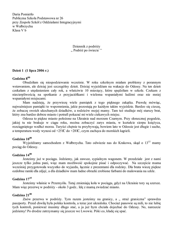 Daria Pomietło Publiczna Szkoła Podstawowa nr 26 przy Zespole Szkół z Oddziałami Integracyjnymi w Wałbrzychu Klasa V b Dziennik z podróŜy „ PodróŜ po świecie ’’ Dzień 1 (1 lipca 2006 r.) Godzina 800 Obudziłam się niespodziewanie wcześnie. W roku szkolnym miałam problemy z porannym wstawaniem, ale dzisiaj jest szczególny dzień. Dzisiaj wyjeŜdŜam na wakacje do Odessy. Na ten dzień czekałam z utęsknieniem cały rok, a właściwie 10 miesięcy, które spędziłam w szkole. Czekam z niecierpliwością na spotkanie z przyjaciółkami i wieloma wspaniałymi ludźmi oraz nie mniej wspaniałymi miejscami. Mam nadzieję, Ŝe przywiozę wiele pamiątek z tego pięknego zakątka. Prawdę mówiąc, najwaŜniejsze pamiątki to wspomnienia, jakie pozostają po kaŜdym takim wyjeździe. Bardzo się cieszę, Ŝe zobaczę swoich ukochanych dziadków, a rodziców mojej mamy. Tam teŜ studiuje mój starszy brat, który zna bardzo dobrze miasto i potrafi pokazać mi wiele ciekawych miejsc. Odessa to piękne miasto połoŜone na Ukrainie nad morzem Czarnym. Przy słonecznej pogodzie, jakiej tu nie brakuje w ciągu roku, moŜna zobaczyć zarys miasta, w kształcie sierpu księŜyca, rozciągniętego wzdłuŜ morza. Turyści chętnie tu przybywają, bowiem lato w Odessie jest długie i suche, a temperatura wody wynosi od +25°C do +28°C, czym zachęca do morskich kąpieli. Godzina 1000 WyjeŜdŜamy samochodem z Wałbrzycha. Tato odwiezie nas do Krakowa, skąd o 1315 mamy pociąg do Odessy. Godzina 1400 Jesteśmy juŜ w pociągu. Jedziemy, jak zawsze, sypialnym wagonem. W przedziale jest z nami jeszcze tylko jedna pani, więc mam moŜliwość spokojnie pisać i odpoczywać. Na szczęście mama wcześniej przygotowała wszystko do wyjazdu, łącznie z prezentami dla rodziny. Dla brata wiozę piękne ozdobne ramki dla zdjęć, a dla dziadków mam ładne obrazki zrobione farbami do malowania na szkle. Godzina 1715 Jesteśmy właśnie w Przemyślu. Tutaj zmieniają koła w pociągu, gdyŜ na Ukrainie tory są szersze. Mam więc przerwę w podróŜy - około 3 godz.. Idę z mamą zwiedzać miasto. Godzina 2100 Znów przerwa w podróŜy. Tym razem jesteśmy na granicy, a „ straŜ graniczna” sprawdza paszporty. Przed chwilą była polska kontrola, a teraz jest ukraińska. ChociaŜ panowie są mili, to nie lubię tych kontroli, poniewaŜ musimy długo stać, a ja juŜ bym chciała dojechać do Odessy. No, nareszcie jedziemy! Po drodze zatrzymamy się jeszcze we Lwowie. Póki co, kładę się spać. Dzień 2 (2 lipca 2006 r.) Godzina 1020 JuŜ jestem po śniadaniu i z niecierpliwością wyglądam przez okno. ZbliŜamy się do celu podróŜy, więc wypatruję pierwszych zabudowań miasta. Na razie nie widzę nic znajomego, a pociąg teraz się juŜ nie zatrzymuje na Ŝadnej stacji. Wszystkie ciekawsze stacje mijaliśmy w nocy, a ja w nocy wolę spać, by być wypoczętą, jak dojadę na miejsce. Właśnie mama przypomina mi, Ŝe muszę przestawić zegarek, o jedną godzinę wstecz. Tu jest inna strefa czasowa. Godzina 2020 Dopiero teraz mam troszkę czasu dla siebie. Wcześniej nie było to moŜliwe, bo jak tylko dojechaliśmy na dworzec w Odessie, to było ogromne zamieszanie. Wyszli po nas prawie wszyscy – babcia Masza, Dziadek Jura, brat Kostia, wujek SierioŜa z ciocią Galą i kuzyneczka Katia. Babcia, jak zawsze, popłakała się z radości, a Katia sprawdzała, czy nie zapomniałam mówić po rosyjsku. Na całe szczęście podróŜ, chociaŜ trwała 36 godzin, nie była uciąŜliwa i wyspałam się w pociągu, więc teraz nie czuję się zmęczona. Cieszę się, Ŝe prezenty podobały się wszystkim, a babcia stwierdziła, Ŝe i tak najlepszym prezentem jestem ja. To miłe. Dzień 3 (3 lipca 2006 r.) Godzina 1930 W Odessie jestem juŜ drugi dzień. Po śniadaniu poszłam z bratem zwiedzać miasto. Znajduje się tu wiele zabytków, ale ja w pierwszej kolejności odwiedziłam Morze Czarne i ul. Dieriebasowską, która jest główną ulicą turystyczną, gdzie spotykają się wszyscy turyści. Artyści malują na poczekaniu portrety, moŜna teŜ kupić wiele pamiątek, posłuchać odesskiej muzyki. Sprawdziłam takŜe, co się zmieniło przez rok mojej nieobecności. Postawili tutaj taką starą śmieszną budkę telefoniczną, która zaczyna grać po wybraniu numeru. Wszystko to tak dziwnie trzeszczy i chrapie. Kupiłam sobie płytę z tymi starymi nagraniami. W przyległym parku wypatrzyłam altankę, gdzie w dawnych czasach dla mieszkańców miasta i turystów, grała orkiestra, umilając zwiedzanie miasta, a teraz moŜna przymierzyć w niej stroje z dawnych czasów i zrobić wspaniałe zdjęcia. Wybrałam dla siebie czerwoną suknię, kapelusz i wachlarz. Wyglądałam i czułam się jak księŜniczka z bajki. Co to za wspaniałe uczucie, w szczególności, gdy obok stoi chłopiec przebrany za pazia. Ciekawa jestem, czy będzie go widać na zdjęciach? Jutro zdjęcia będą gotowe, bo dzisiaj juŜ nie chciało nam się czekać. Dzień 4 (4 lipca 2006 r.) Godzina 1315 Rozczarowanie! Odebraliśmy zdjęcia. Pazia na nich nie ma. Lepiej by było, gdybyśmy je sami zrobili. Ale i tak chyba dobrze na nich wyglądam? Na pocieszenie braciszek zaproponował, Ŝe zabierze mnie do Jacht Klubu. Teraz jednak idziemy na plaŜę. Mama chce „przyzwyczaić skórę do opalania”. Dzień 5 (5 lipca 2006r.) Godzina 1530 Braciszek dotrzymał słowa i zabrał mnie do Jacht Klubu, który znajduje się przy tzw. „Моρском Вокзале” (czyt. Morskam wakzale), czyli przy Dworcu Morskim. Obejrzeliśmy wspaniałe Ŝaglówki, a następnie zjedliśmy smaczne ciasteczka zwane „Лодочқи” (czyt. ładoczki), co w języku polskim znaczy „ łódeczki”. Kostia spotkał tu znajomego, który zaproponował nam rejs Ŝaglówką, ale ja bez mamy nie chciałam próbować. MoŜe innym razem? Teraz czas wybrać się na plaŜę. Dzień 6 (6 lipca 2006 r.) Godzina 2000 Jestem zmęczona. W ciągu