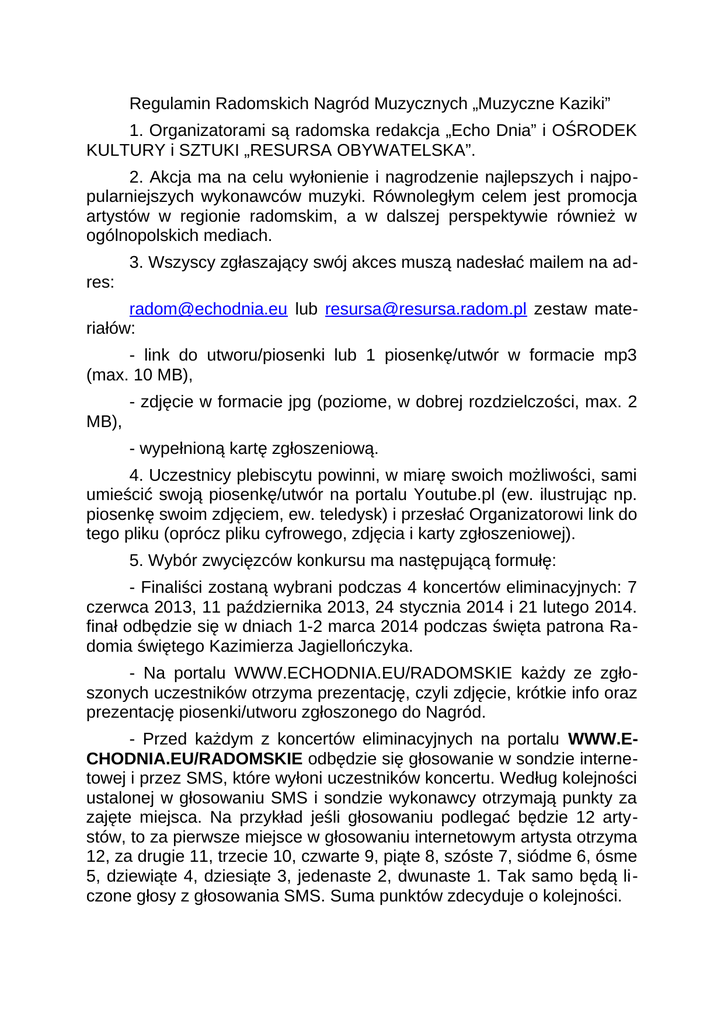 Regulamin Radomskich Nagród Muzycznych „Muzyczne Kaziki” 1. Organizatorami są radomska redakcja „Echo Dnia” i OŚRODEK KULTURY i SZTUKI „RESURSA OBYWATELSKA”. 2. Akcja ma na celu wyłonienie i nagrodzenie najlepszych i najpopularniejszych wykonawców muzyki. Równoległym celem jest promocja artystów w regionie radomskim, a w dalszej perspektywie również w ogólnopolskich mediach. 3. Wszyscy zgłaszający swój akces muszą nadesłać mailem na adres: [email protected] lub [email protected] zestaw materiałów: - link do utworu/piosenki lub 1 piosenkę/utwór w formacie mp3 (max. 10 MB), - zdjęcie w formacie jpg (poziome, w dobrej rozdzielczości, max. 2 MB), - wypełnioną kartę zgłoszeniową. 4. Uczestnicy plebiscytu powinni, w miarę swoich możliwości, sami umieścić swoją piosenkę/utwór na portalu Youtube.pl (ew. ilustrując np. piosenkę swoim zdjęciem, ew. teledysk) i przesłać Organizatorowi link do tego pliku (oprócz pliku cyfrowego, zdjęcia i karty zgłoszeniowej). 5. Wybór zwycięzców konkursu ma następującą formułę: - Finaliści zostaną wybrani podczas 4 koncertów eliminacyjnych: 7 czerwca 2013, 11 października 2013, 24 stycznia 2014 i 21 lutego 2014. finał odbędzie się w dniach 1-2 marca 2014 podczas święta patrona Radomia świętego Kazimierza Jagiellończyka. - Na portalu WWW.ECHODNIA.EU/RADOMSKIE każdy ze zgłoszonych uczestników otrzyma prezentację, czyli zdjęcie, krótkie info oraz prezentację piosenki/utworu zgłoszonego do Nagród. - Przed każdym z koncertów eliminacyjnych na portalu WWW.ECHODNIA.EU/RADOMSKIE odbędzie się głosowanie w sondzie internetowej i przez SMS, które wyłoni uczestników koncertu. Według kolejności ustalonej w głosowaniu SMS i sondzie wykonawcy otrzymają punkty za zajęte miejsca. Na przykład jeśli głosowaniu podlegać będzie 12 artystów, to za pierwsze miejsce w głosowaniu internetowym artysta otrzyma 12, za drugie 11, trzecie 10, czwarte 9, piąte 8, szóste 7, siódme 6, ósme 5, dziewiąte 4, dziesiąte 3, jedenaste 2, dwunaste 1. Tak samo będą liczone głosy z głosowania SMS. Suma punktów zdecyduje o kolejności. - Ośmiu wykonawców z największą łączną liczbą punktów wystąpi w koncercie eliminacyjnym, gdzie swoje głosy przyzna publiczność koncertowa, jurorzy oraz słuchacze, czytelnicy. Wykonawcy zaprezentują program muzyczny w czasie nie dłuższym niż 20 minut. - Wszystkie występy podczas koncertu zostaną zamieszczone na WWW.ECHODNIA.EU/RADOMSKIE i poddane głosowaniu poprzez SMS. Według kolejności ustalonej w głosowaniu SMS wykonawcy otrzymają punkty za zajęte miejsca według zasady przyjętej powyżej, tzn. wykonawca z największą liczbą SMSów otrzyma 8 punktów, kolejny – 7 punktów, i tak aż do 1 punktu dla wykonawcy z najmniejszą liczbą SMSów. Podobnie zostaną punkty za kolejność w głosowaniu jury oraz publiczności podczas koncertu. Każde z głosowań na uczestników koncertowej ósemki będzie miało wartość 1/3 ostatecznego werdyktu. Maksymalnie wykonawca, które wygra we wszystkich głosowaniach uzyskać może 24 punkty (3x8) - Jeśli chodzi o głosowanie w ósemce występującej na koncercie eliminacyjnych o ostatecznej kolejności zdecydują głosy jury (złożonego z muzyków, przedstawicieli mediów i „Resursy”), publiczności na koncercie (głosowanie na biletach wstępu) i czytelników poprzez SMS liczone na tej samej zasadzie. - Dwoje wykonawców z największą liczbą punktów będzie walczyło w finale. Z trzech kolejnych koncertów również wejdą najlepsze dwójki, wybrane na tej samej zasadzie. - Uwaga! Wykonawca, który odpadł w pierwszej eliminacji może zgłosić się do kolejnych. - W koncercie finałowym weźmie udział 8 wykonawców wybranych w eliminacjach (po 2 z każdych eliminacji). - Jury w czasie wszystkich eliminacji ma prawo przyznać dzikie karty upoważniające do udziału w finale. Nie może być ich więcej niż 4. - W finale zostaną rozdane trzy Radomskie Nagrody Muzyczne: Złota, Srebrna i Brązowa. Skład finału zostanie zaprezentowany na portalu WWW.ECHODNIA.EU w poniedziałek, 24 lutego, tego dnia rozpocznie się głosowanie SMS. W finale Artysta walczy o głosy publiczności smsy, oraz o głosy Jury – na podstawie nagrań oraz koncertu na żywo i widzów koncertu finałowego - na podstawie występu na żywo. Głosy liczą się po 1/3. 1) ocena Jury – 1/3. punkty przyznane po ustaleniu kolejności 2) głosowanie smsowe - 1/3. punkty przyznane po ustaleniu kolejności 3) głosowanie publiczności podczas występu na żywo - 1/3. punkty przyznane po ustaleniu kolejności 6. Artysta przesyłając zgłoszenie jednocześnie udziela zgody organizatorom na wykorzystanie nadesłanych materiałów do celów prezentacji Artysty. W szczególności udziela zgody na zamieszczenie utworu/piosenki, zdjęć oraz innych materiałów w serwisie Youtube, na portalu internetowym Echa Dnia oraz innych mediów mazowieckich oraz ogólnopolskich, na łamach Echa Dnia oraz innych wydawnictw, na antenie lokalnych rozgłośni radiowych, na antenie TV Dami oraz innych stacji telewizyjnych, na plakatach oraz innych materiałach promocyjnych. Materiały nadesłane przez Artystę do plebiscytu mogą być wykorzystane przez Organizatorów wyłącznie w celu prezentacji Artysty, jako uczestnika Festiwalu, promocji Artysty oraz promocji wydarzenia. 7. Artysta przesyłając zgłoszenie jednocześnie zobowiązuje się do zaprezentowania swojego utworu/piosenki na żywo przed publicznością w ramach „Muzycznych Kazików”. 8. W przypadku nagrodzenia któregoś z Laureatów nagrodą rzeczową, Laureat ma obowiązek odprowadzenia należnego podatku. Laureat ma prawo zrzeczenia się nagrody rzeczowej. 9. Każdy z Artystów w każdym z etapów ma przyporządkowany numer, który należy wpisać w treść smsa w czasie głosowania. Szczegóły na temat sposobu głosowania smsowego zamieszczone będą na stronie WWW.E