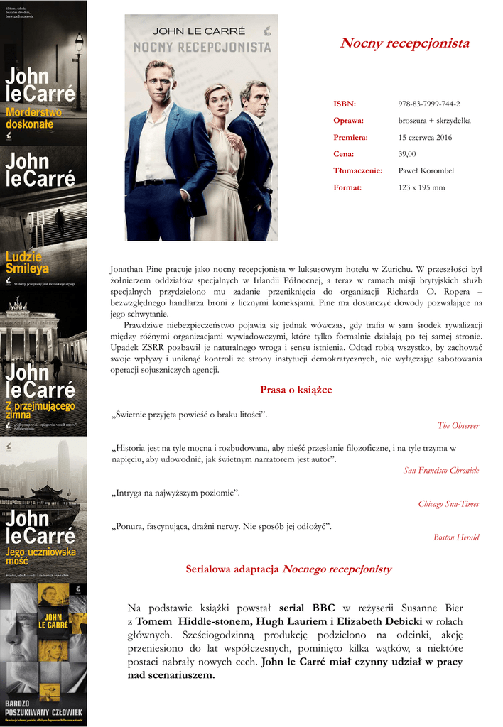 Nocny recepcjonista ISBN: 978-83-7999-744-2 Oprawa: broszura + skrzydełka Premiera: 15 czerwca 2016 Cena: 39,00 Tłumaczenie: Paweł Korombel Format: 123 x 195 mm Jonathan Pine pracuje jako nocny recepcjonista w luksusowym hotelu w Zurichu. W przeszłości był żołnierzem oddziałów specjalnych w Irlandii Północnej, a teraz w ramach misji brytyjskich służb specjalnych przydzielono mu zadanie przeniknięcia do organizacji Richarda O. Ropera – bezwzględnego handlarza broni z licznymi koneksjami. Pine ma dostarczyć dowody pozwalające na jego schwytanie. Prawdziwe niebezpieczeństwo pojawia się jednak wówczas, gdy trafia w sam środek rywalizacji między różnymi organizacjami wywiadowczymi, które tylko formalnie działają po tej samej stronie. Upadek ZSRR pozbawił je naturalnego wroga i sensu istnienia. Odtąd robią wszystko, by zachować swoje wpływy i uniknąć kontroli ze strony instytucji demokratycznych, nie wyłączając sabotowania operacji sojuszniczych agencji. Prasa o książce „Świetnie przyjęta powieść o braku litości”. The Observer „Historia jest na tyle mocna i rozbudowana, aby nieść przesłanie filozoficzne, i na tyle trzyma w napięciu, aby udowodnić, jak świetnym narratorem jest autor”. San Francisco Chronicle „Intryga na najwyższym poziomie”. Chicago Sun-Times „Ponura, fascynująca, drażni nerwy. Nie sposób jej odłożyć”. Boston Herald Serialowa adaptacja Nocnego recepcjonisty Na podstawie książki powstał serial BBC w reżyserii Susanne Bier z Tomem Hiddle-stonem, Hugh Lauriem i Elizabeth Debicki w rolach głównych. Sześciogodzinną produkcję podzielono na odcinki, akcję przeniesiono do lat współczesnych, pominięto kilka wątków, a niektóre postaci nabrały nowych cech. John le Carré miał czynny udział w pracy nad scenariuszem. John le Carré (właściwie David John Moore Cornwell) urodził się 19 października 1931 roku. Z wyróżnieniem ukończył Lincoln College w Oksfordzie, a przez kolejne dwa lata wykładał język francuski i niemiecki w Eton College. W 1959 roku rozpoczął pracę w brytyjskiej ambasadzie w Bonn, stamtąd został wkrótce przeniesiony do Hamburga, a ostatecznie przydzielony do pracy w tajnych służbach wywiadowczych MI6. Jego kilkuletnią karierę szpiegowską zakończył Kim Philby, brytyjski podwójny agent, który w tamtych czasach zdemaskował przed KGB dziesiątki brytyjskich agentów. Pisarstwem le Carré zajął się w 1961 roku, debiutując powieścią Call for the dead (Budzenie zmarłych, Amber 2002). Jego dorobek literacki liczy dziś 21 powieści, dokument The Unbearable Peace oraz liczne opowiadania. Ma na swoim koncie wiele nagród literackich, w tym Crime Writers’ Association Dagger of Daggers Awards oraz British Book Award w kategorii książka filmowa roku. Na podstawie jego powieści nakręcono 7 filmów fabularnych, w tym Wiernego ogrodnika, zdobywcę Oscara i Złotego Globu. Nakładem Wydawnictwa Sonia Draga ukazało się dziesięć książek le Carrégo, m.in. Subtelna prawda, Wierny ogrodnik, Zdrajca w naszym typie, Krawiec z Panamy czy Morderstwo doskonałe. Dziś John le Carré określany jest mianem weterana powieści polityczno-szpiegowskich, który na stałe dołączył do panteonu wielkich mistrzów literatury. Autor o sobie „Dobry pisarz jest ekspertem tylko jeśli chodzi o jego własną osobę. A i w tym temacie, jeśli ma trochę oleju w głowie, trzyma język za zębami. Pewnie niektórzy z was zastanawiają się, skąd moja niechęć do wywiadów telewizyjnych, radiowych i prasowych. Otóż, wynika to z faktu, że to, o czym piszę, nie ma nic wspólnego z prawdą. To owoc moich snów, nie rzeczywistości, a jednak media wciąż traktują moje książki jak poradniki szpiegowskie”. Czego nie wiecie o autorze Miał w swojej karierze epizod aktorski. Wystąpił jako Dowódca w filmie Mała doboszka z 1984 roku. Ma czterech synów i trzynaścioro wnucząt. Nienawidzi telefonów, nie umie pisać na komputerze, a swoje powieści pisze odręcznie. Fascynację tajemnicami zaszczepił w nim przypadkowo Ronnie, jego ojciec, który stracił majątek na licznych oszustwach. Matkę poznał dopiero, gdy miał 21 lat. Mieszka na skalistym wybrzeżu Kornwalii – nie znosi dużych miast. Jak sam twierdzi – „trzy dni i trzy noce w mieście” to jego „maksimum”. Sonia Draga Sp. z o.o., Pl. Grunwaldzki 8-10, 40-127 Katowice, Tel.: 32 7826477, 7826037, Fax: 032 2537728 Dział handlowy: Danuta Czarnowska, 693420384, [email protected] Promocja: Agnieszka Jedlińska, 695672067, [email protected] Redakcja: [email protected]