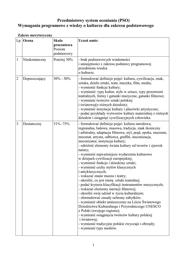 Przedmiotowy system oceniania (PSO) Wymagania programowe z wiedzy o kulturze dla zakresu podstawowego Zakres merytoryczny Lp Ocena Skala procentowa Poziom podstawowy Uczeń umie: 1 Niedostateczny Poniżej 30% - brak podstawowych wiadomości i umiejętności z zakresu podstawy programowej przedmiotu wiedza o kulturze. 2 Dopuszczający 30% - 50% - formułować definicje pojęć: kultura, cywilizacja, znak, sztuka, dzieło sztuki, teatr, muzyka, film, media; - wymienić funkcje kultury; - wymienić: typy kultur, style w sztuce, typy przestrzeni teatralnych, formy i gatunki muzyczne, gatunki filmowe; - wymienić twórców sztuki polskiej i światowej(z różnych dziedzin); - wymienić instytucje kultury i placówki artystyczne; - podać przykłady wytworów kultury materialnej z różnych dziedzin i osiągnięć cywilizacyjnych człowieka. 3 Dostateczny 51% -75% - formułować definicje pojęć: kultura narodowa, regionalna, ludowa, masowa, tradycja, znak ikoniczny i arbitralny, adaptacja filmowa, styl, prąd, epoka, muzeum, mecenat, artysta, odbiorca, graffiti, inscenizacja, inscenizator, instytucja kultury; - odróżnić elementy świata kultury od tworów i zjawisk natury; - wymienić najważniejsze wydarzenia kulturowe w dziejach cywilizacji europejskiej; - wymienić funkcje i dziedziny sztuki; - wymienić cechy stylów klasycznych i antyklasycznych; - wskazać znane muzea i teatry; - określić, co jest istotą sztuki teatralnej; - podać kryteria klasyfikacji instrumentów muzycznych; - wskazać elementy narracji filmowej; - określić swój udział w życiu kulturalnym; - sformułować zasady ochrony zabytków; - wymienić obiekt umieszczony na Liście Światowego Dziedzictwa Kulturalnego i Przyrodniczego UNESCO z Polski (swojego regionu); - wymienić osiągnięcia twórców kultury polskiej i światowej; - wymienić tradycyjne polskie zwyczaje i obrzędy; - wymienić typy mediów. 1 4 Dobry 76% - 90% - scharakteryzować omawiane typy kultur; - podać przykłady dzieł sztuki pełniących określone funkcje; - wskazać różnice w pojmowaniu roli artysty w określonym czasie; - wymienić prądy artystyczne XX wieku; - wymienić najważniejsze zjawiska kultury współczesnej; - wymienić funkcje muzeum; - podać przykłady stylów klasycznych i antyklasycznych; - charakteryzować wybrane gatunki muzyczne; - definiować pojęcia: muzyka popularna, ludowa, dworska, świata, folk; - wymienić przykłady instrumentów muzycznych należących do poszczególnych kategorii; - wymienić nazwy tańców narodowych i towarzyskich; - określić źródła widowisk teatralnych; - charakteryzować różne przestrzenie teatralne; - wymienić wielkich reformatorów teatru; - wymienić elementy języka teatru; - charakteryzować film jako medium komunikacyjne i artystyczne; - charakteryzować poszczególne gatunki filmowe; - wymienić typy planów filmowych; - definiować pojęcie kino autorskie; - wymienić gatunki telewizyjne i typy programów nadawanych przez różne stacje telewizyjne; - określić swój udział w funkcjonowaniu współczesnej kultury; - scharakteryzować tradycyjne polskie zwyczaje i obrzędy. 5 Bardzo dobry 91% - 100% - określać zależność między poznanymi typami kultur; - wskazywać cechy i wytwory różnych kultur; - wskazywać przykłady różnych znaków w kulturze; - scharakteryzować style klasyczne i antyklasyczne, - scharakteryzować znane muzea; - omówić różne koncepcje artysty i sztuki; - wyjaśnić pojęcie kiczu i wskazać przykłady tego zjawiska; - sformułować definicje pojęć: pop-art, performance, hiperrealizm, asamblaż; - omówić genezę oraz wyjaśnić istotę idei zorganizowanej ochrony dóbr kultury; - wskazać przykłady obiektów umieszczonych na Liście Światowego Dziedzictwa Kulturalnego i Przyrodniczego UNESCO; - posługiwać się pojęciami dionizyjskość i apollińskość w sztuce; - charakteryzować poszczególne instrumenty muzyczne; - wyjaśnić zależność między muzyką codzienności a muzyką poważną; 2 - wymienić reformatorów sztuki teatralnej i podać ich założenia; - wymienić twórców kina autorskiego i podać przykłady filmów należących do tego typu; - scharakteryzować typy planów filmowych; - wymienić przedstawicieli polskiej szkoły filmowej; - świadomie wybierać wartościowe teksty kultury; - charakteryzować zjawiska kultury współczesnej; - dostrzec różnice pomiędzy kulturą elitarną i masową; - oceniać organizację życia kulturalnego regionu; - wymienić zalety i wady stacji państwowych i komercyjnych; - porównać Internet z tradycyjnymi środkami przekazu; 6 Celujący Powyżej 100% Wiedza wykraczająca poza zasięg programowy - wyjaśnić i świadomie używać pojęć: homogenizacja kultury, sztuka figuratywna, sztuka abstrakcyjna, - porównać i ocenić wytwory różnych kultur i stylów w sztuce; - wskazać czynniki decydujące o sposobie przeprowadzania konserwacji; - stworzyć wirtualną galerię na wybrany temat; - porównać przedstawienie teatralne z innymi wydarzeniami kulturalnymi z publicznością; - pisać recenzję wybranego wydarzenia kulturalnego; - porównać narrację w filmie fabularnym i w powieści; - wskazać cechy przekazu telewizyjnego; - wymienić główne zasady prawa autorskiego; - aktywnie i świadomie uczestniczyć w życiu kulturalnym; - zaprojektować działania animacyjne służące aktywnemu i twórczemu uczestnictwu w kulturze; - współtworzyć projekty edukacyjne; - posługiwać się różnymi źródłami informacji i gromadzić informacje przydatne w życiu kulturalnym człowieka; - rozwiązywać problemy z zakresu antropologii kultury. Kryteria pracy w grupie Organizacja pracy w grupie 1 – niewykonanie zadania 2 – niepełne wykonanie zadań; 3 – według typowych wzorów; 4 – typowe wzorce w nowym układzie, według typowych rozwiązań; 5 – właściwy plan i wykonanie; 6 – samodzielne i oryginalne wykonanie. Podział zadań- podział ról 1 – b