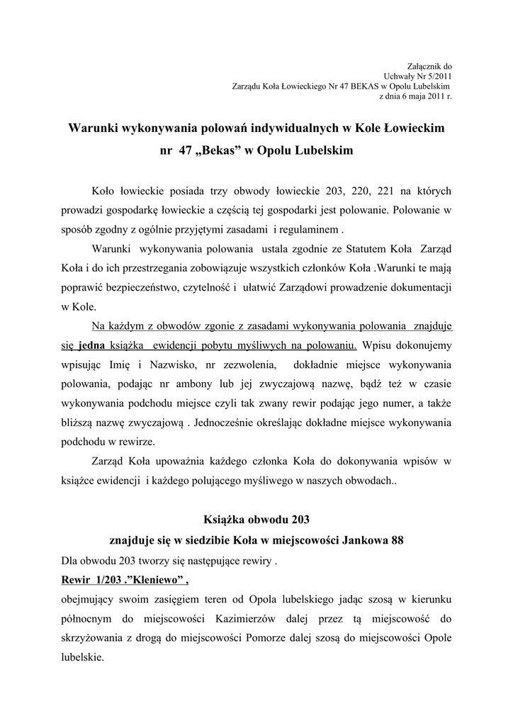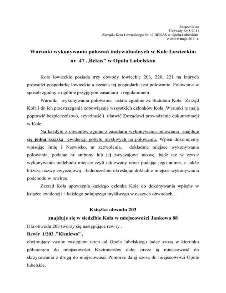 Załącznik do Uchwały Nr 5/2011 Zarządu Koła Łowieckiego Nr 47 BEKAS w Opolu Lubelskim z dnia 6 maja 2011 r. Warunki wykonywania polowań indywidualnych w Kole Łowieckim nr 47 „Bekas” w Opolu Lubelskim Koło łowieckie posiada trzy obwody łowieckie 203, 220, 221 na których prowadzi gospodarkę łowieckie a częścią tej gospodarki jest polowanie. Polowanie w sposób zgodny z ogólnie przyjętymi zasadami i regulaminem . Warunki wykonywania polowania ustala zgodnie ze Statutem Koła Zarząd Koła i do ich przestrzegania zobowiązuje wszystkich członków Koła .Warunki te mają poprawić bezpieczeństwo, czytelność i ułatwić Zarządowi prowadzenie dokumentacji w Kole. Na każdym z obwodów zgonie z zasadami wykonywania polowania znajduje się jedna książka ewidencji pobytu myśliwych na polowaniu. Wpisu dokonujemy wpisując Imię i Nazwisko, nr zezwolenia, dokładnie miejsce wykonywania polowania, podając nr ambony lub jej zwyczajową nazwę, bądź też w czasie wykonywania podchodu miejsce czyli tak zwany rewir podając jego numer, a także bliższą nazwę zwyczajową . Jednocześnie określając dokładne miejsce wykonywania podchodu w rewirze. Zarząd Koła upoważnia każdego członka Koła do dokonywania wpisów w książce ewidencji i każdego polującego myśliwego w naszych obwodach.. Książka obwodu 203 znajduje się w siedzibie Koła w miejscowości Jankowa 88 Dla obwodu 203 tworzy się następujące rewiry . Rewir 1/203 .”Kleniewo” , obejmujący swoim zasięgiem teren od Opola lubelskiego jadąc szosą w kierunku północnym do miejscowości Kazimierzów dalej przez tą miejscowość do skrzyżowania z drogą do miejscowości Pomorze dalej szosą do miejscowości Opole lubelskie. Rewir 2/203 „Las Powiślański” obejmujący swym zasięgiem teren biegnący granicą obwodu od miejscowości Jankowa do miejscowości Trzciniec dalej na północ do miejscowości Kosiorów dalej rzeką Chodelką do miejscowości Pomorze i z Pomorza drogą do miejscowości Opole lub, ul.Szkolna Rewir 3 /203 „Zjawienie” Biegnący od miejscowości Kazimierzów w kierunku północnym do miejscowości Karczmiska ,dalej granicą obwodu do skrzyżowania z drogą od miejscowości Chodlik dalej szosą do miejscowości Chodlik ,następnie rzeką Chodelką do miejscowości Pomorze i szosą do miejscowości Kazimierzów. Rewir 4 /203 „Kołek” Biegnący od miejscowości Chodlik rzeką Chodelką do miejscowo Kosiorów ,dalej granicą obwodu w kierunku północnym do miejscowości Polanówka ,następnie szosą w kierunku Karczmisk do skrzyżowania z drogą na Chodlik i następnie szosą do miejscowości Chodlik . Książka obwodu 220 znajduje się w miejscowości Niezdów siedziba starej leśniczówki Kozieniec, leśnictwo Kleniewo Dla obwodu 220 tworzy się następujące rewiry Rewir 1/220 Jankowa Stawy Obejmujący swym zasięgiem obszar biegnący drogą od Opola lubelskiego ul szkolna granicą obwodu 203 i 220 do miejscowości Trzciniec następnie szosą do miejscowości Niedźwiada Duża, dalej granicą lasu do rzeki Jankówka dalej rzeką, przez stawy „Baraś”, rzeką Leonką do miejscowości Opole lub. ,ul .Pomorska Rewir 2/220 Kozieniec Rozpoczyna się w Opolu lub ul Pomorska ,dalej biegnie przez miejscowość Niezdów do miejscowości Łaziska ,dalej szosą do miejscowości Niedźwiada Duża i granicą lasu do rzeki Jankówki ,dalej przez stawy ,Baraś ,rzeką Leonką do Opola lub ul. Pomorska Rewir nr3/220 Lupnik Biegnie od Opola lub .granicą obwodu do miejscowości Wrzelowiec ,następnie granicą obwodu przez Kierzki do szosy Kluczkowice – Łaziska ,dalej szosą do Łazisk i z Łazisk przez Niezdów do miejscowości Opole lub. Rewir 4/220 Olszyny Biegnie od miejscowości Łaziska do Niedźwiady Dużej dalej granicą obwodu do miejscowości Kamień, dalej szosą, przez Hetmanówkę, kol Kamień, Kamionkę, Kierzki i dalej szosą w kierunku Łazisk Książka w Obwodzie 221 znajduje się w leśnictwie Kluczkowice Dla obwodu 221 tworzy się następujące rewiry Rewir 1/221 Ogrody Obejmuje teren biegnący od miejscowości Wrzelowiec szosą w kierunku Kluczkowic, do Wólki Kolczyńskiej dalej od miejscowości Wólka Kolczyńska drogą szutrową w kierunku Kopaniny Kaliszańskiej i dalej do Zgody następnie szosą w kierunku północnym do końca wsi Zgoda, ścianą lasu do miejscowości Kamionka szosą do miejscowości Kierzki i granicą obwodu do miejscowości Wrzelowiec. Rewir 2/221 Piekarnia Obejmuje obszar od Wólki Kolczyńskiej szosą do miejscowości Józefów n/Wisłą dalej granicą rzeki Wisła w kierunku północnym do miejscowości Kaliszany Kamieniołomy i dalej drogą leśną w kierunku wschodnim przez las do miejscowości Zgoda ,dalej drogą polną do miejscowości Kopanina Kaliszańska i drogą szutrową do miejscowości Wólka Kolczyńska Rewir 3/221 Kamień Od miejscowości Kaliszany Kamieniołomy Wisłą do miejscowości Kępa Solecka , dalej szosą przez Kamień Hetmanówkę, Kol. Kamień, Kamionkę ścianą lasu do miejscowości Zgoda dalej szosą do drogi leśnej i dalej drogą leśną do Kaliszan. Prezes Koła Tadeusz Piłat