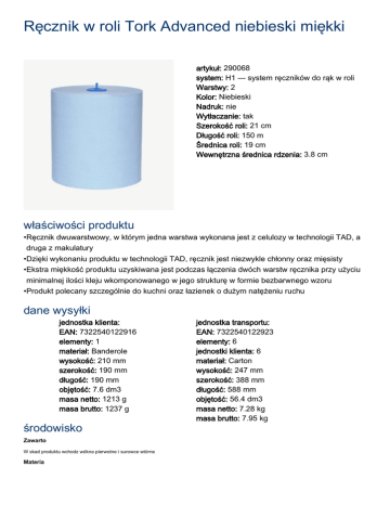Ręcznik w roli Tork Advanced niebieski miękki artykuł: 290068 system: H1 — system ręczników do rąk w roli Warstwy: 2 Kolor: Niebieski Nadruk: nie Wytłaczanie: tak Szerokość roli: 21 cm Długość roli: 150 m Średnica roli: 19 cm Wewnętrzna średnica rdzenia: 3.8 cm właściwości produktu •Ręcznik dwuwarstwowy, w którym jedna warstwa wykonana jest z celulozy w technologii TAD, a druga z makulatury •Dzięki wykonaniu produktu w technologii TAD, ręcznik jest niezwykle chłonny oraz mięsisty •Ekstra miękkość produktu uzyskiwana jest podczas łączenia dwóch warstw ręcznika przy użyciu minimalnej ilości kleju wkomponowanego w jego strukturę w formie bezbarwnego wzoru •Produkt polecany szczególnie do kuchni oraz łazienek o dużym natężeniu ruchu dane wysyłki jednostka klienta: EAN: 7322540122916 elementy: 1 materiał: Banderole wysokość: 210 mm szerokość: 190 mm długość: 190 mm objętość: 7.6 dm3 masa netto: 1213 g masa brutto: 1237 g środowisko Zawarto W skad produktu wchodz wókna pierwotne i surowce wtórne Materia jednostka transportu: EAN: 7322540122923 elementy: 6 jednostki klienta: 6 materiał: Carton wysokość: 247 mm szerokość: 388 mm długość: 588 mm objętość: 56.4 dm3 masa netto: 7.28 kg masa brutto: 7.95 kg Wókna pierwotne i papier makulaturowy W procesie wytwarzania zastosowano zarówno wókna pierwotne, jak i papier makulaturowy. Wane jest, aby technologia zastosowana w procesie produkcji moga skutecznie wykorzystywa wókna pierwotne i papier makulaturowy. Róne rodzaje wókien wymagaj zastosowania innych technologii, które z kolei determinuj póniejsze waciwoci produktu finalnego, co z kolei sprawia, e rodzaj zastosowanych wókien (wtórne lub pierwotne) staje si mniej istotny. Korzyci ekologiczne i ekonomiczne stosowania papieru makulaturowego jako surowca zale od dostpnoci papieru makulaturowego, odlegoci transportu oraz jakoci zebranych surowców wtórnych. Wybielanie wókien Wybielanie stanowi proces oczyszczania wókien, majcy na celu uzyskanie jasnej pulpy, ale równie otrzymanie pulpy o okrelonej czystoci, speniajcej wymagania w zakresie higieny oraz, w pewnych przypadkach, wymagania w zakresie bezpieczestwa ywnoci. Obecnie stosuje si róne metody wybielania: ECF (bez stosowania chloru gazowego), z uyciem dwutlenku chloru oraz TCF (cakowicie bez stosowania chloru i jego zwizków), w której to metodzie wykorzystywany jest ozon, tlen oraz nadtlenek wodoru. Substancje chemiczne Substancje chemiczne stosowane w produkcji, jak równie substancje czynne podlegaj ocenie pod wzgldem bezpieczestwa dla rodowiska, BHP oraz bezpieczestwa samego produktu. Zastosowane substancje czynne obejmuj: Czynnik podnoszcy odporno na wilgo Czynnik suszcy Barwnik Czynniki utrwalajce Fluorescencyjny czynnik wybielajcy Klej rodki zmikczajce Zastosowane substancje wspomagajce proces produkcji obejmuj: Czynnik stabilizujco-zabezpieczajcy Substancja powlekajca Reduktor piany Czynniki dyspergujce i kontrolujce napicie powierzchniowe Czynniki kontrolujce pH i adunek Substancje wspomagajce retencj Substancje degradujce Substancje wspomagajce odpyw Opakowanie Opakowanie spenia wymogi Dyrektywy ws. opakowa oraz ich odpadów (94/62/WE):Tak Produkcja Produkt jest wytwarzany w zakadzie w miejscowoci Kostheim w Niemczech. Zakad ten posiada certyfikat zgodnoci z norm ISO 14001 i EMAS. Odpady Produkt z przeznaczeniem gównie do higieny osobistej. Zuyty stanowi zwyke odpady komunalne. Opakowanie klasyfikuje si jako materia do wtórnego odzysku lub jako ródo energii odnawialnej.
