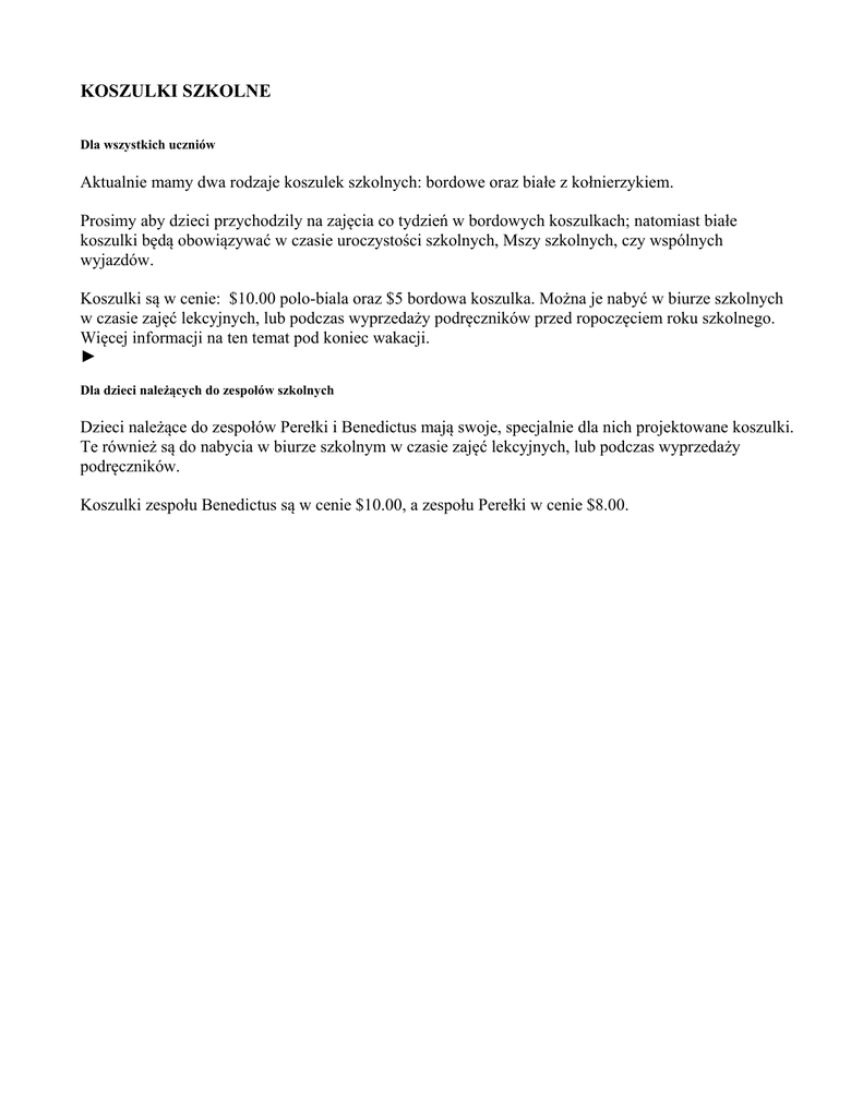 KOSZULKI SZKOLNE Dla wszystkich uczniów Aktualnie mamy dwa rodzaje koszulek szkolnych: bordowe oraz białe z kołnierzykiem. Prosimy aby dzieci przychodzily na zajęcia co tydzień w bordowych koszulkach; natomiast białe koszulki będą obowiązywać w czasie uroczystości szkolnych, Mszy szkolnych, czy wspólnych wyjazdów. Koszulki są w cenie: $10.00 polo-biala oraz $5 bordowa koszulka. Można je nabyć w biurze szkolnych w czasie zajęć lekcyjnych, lub podczas wyprzedaży podręczników przed ropoczęciem roku szkolnego. Więcej informacji na ten temat pod koniec wakacji. ► Dla dzieci należących do zespołów szkolnych Dzieci należące do zespołów Perełki i Benedictus mają swoje, specjalnie dla nich projektowane koszulki. Te również są do nabycia w biurze szkolnym w czasie zajęć lekcyjnych, lub podczas wyprzedaży podręczników. Koszulki zespołu Benedictus są w cenie $10.00, a zespołu Perełki w cenie $8.00.