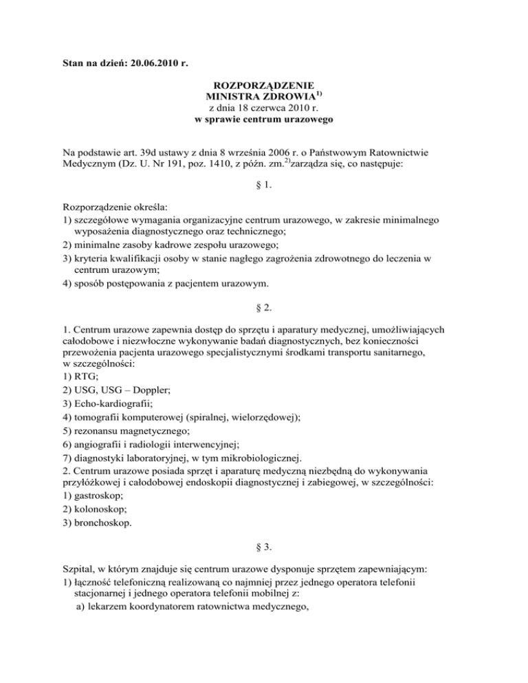 Stan na dzień: 20.06.2010 r. ROZPORZĄDZENIE MINISTRA ZDROWIA1) z dnia 18 czerwca 2010 r. w sprawie centrum urazowego Na podstawie art. 39d ustawy z dnia 8 września 2006 r. o Państwowym Ratownictwie Medycznym (Dz. U. Nr 191, poz. 1410, z późn. zm.2)zarządza się, co następuje: § 1. Rozporządzenie określa: 1) szczegółowe wymagania organizacyjne centrum urazowego, w zakresie minimalnego wyposaŜenia diagnostycznego oraz technicznego; 2) minimalne zasoby kadrowe zespołu urazowego; 3) kryteria kwalifikacji osoby w stanie nagłego zagroŜenia zdrowotnego do leczenia w centrum urazowym; 4) sposób postępowania z pacjentem urazowym. § 2. 1. Centrum urazowe zapewnia dostęp do sprzętu i aparatury medycznej, umoŜliwiających całodobowe i niezwłoczne wykonywanie badań diagnostycznych, bez konieczności przewoŜenia pacjenta urazowego specjalistycznymi środkami transportu sanitarnego, w szczególności: 1) RTG; 2) USG, USG – Doppler; 3) Echo-kardiografii; 4) tomografii komputerowej (spiralnej, wielorzędowej); 5) rezonansu magnetycznego; 6) angiografii i radiologii interwencyjnej; 7) diagnostyki laboratoryjnej, w tym mikrobiologicznej. 2. Centrum urazowe posiada sprzęt i aparaturę medyczną niezbędną do wykonywania przyłóŜkowej i całodobowej endoskopii diagnostycznej i zabiegowej, w szczególności: 1) gastroskop; 2) kolonoskop; 3) bronchoskop. § 3. Szpital, w którym znajduje się centrum urazowe dysponuje sprzętem zapewniającym: 1) łączność telefoniczną realizowaną co najmniej przez jednego operatora telefonii stacjonarnej i jednego operatora telefonii mobilnej z: a) lekarzem koordynatorem ratownictwa medycznego, b) dyspozytorami medycznymi, c) innymi zakładami opieki zdrowotnej, d) regionalnymi centrami krwiodawstwa i krwiolecznictwa; 2) łączność radiową z: a) lekarzem koordynatorem ratownictwa medycznego, b) dyspozytorami medycznymi, c) zespołami ratownictwa medycznego, w tym lotniczymi zespołami ratownictwa medycznego; 3) bezprzewodowe przywoływanie osób, w szczególności członków zespołu urazowego; 4) dokonywanie bieŜących konsultacji telemedycznych między oddziałami szpitala, w którym znajduje się centrum urazowe oraz z innymi zakładami opieki zdrowotnej w sposób gwarantujący zachowanie poufności danych osoby, której konsultacja dotyczy, w szczególności poprzez system kodowania danych umoŜliwiających identyfikację danych osobowych. § 4. 1. W skład zespołu urazowego wchodzą, co najmniej: 1) lekarz szpitalnego oddziału ratunkowego posiadający tytuł specjalisty w dziedzinie medycyny ratunkowej; 2) lekarz lub lekarze posiadający tytuł specjalisty lub specjalizację II stopnia w dziedzinie medycyny mającej zastosowanie w leczeniu pacjenta urazowego w szczególności chirurgii ogólnej, ortopedii i traumatologii narządu ruchu, neurochirurgii lub chirurgii naczyniowej; 3) lekarz posiadający tytuł specjalisty w dziedzinie anestezjologii i intensywnej terapii lub lekarz posiadający specjalizację II stopnia w dziedzinie anestezjologii lub anestezjologii i reanimacji lub anestezjologii i intensywnej terapii. 2. Pracami zespołu urazowego kieruje kierownik zespołu urazowego. 3. Kierownik zakładu opieki zdrowotnej, w którym znajduje się centrum urazowe: 1) określa skład zespołu urazowego spośród lekarzy, o których mowa w ust. 1, z zastrzeŜeniem ust. 4; 2) wyznacza kierownika zespołu urazowego spośród lekarzy, o których mowa w ust. 1 pkt 1 lub 2. 4. W razie potrzeby, w zaleŜności od rodzaju obraŜeń występujących u pacjenta urazowego, w skład zespołu urazowego wchodzi lekarz lub lekarze posiadający tytuł specjalisty lub specjalizację II stopnia w innych dziedzinach medycyny, niŜ wymienione w ust. 1; decyzję w tym zakresie podejmuje kierownik zespołu urazowego. § 5. Osobę w stanie nagłego zagroŜenia zdrowotnego kwalifikuje się do leczenia w centrum urazowym w przypadku, gdy jest pacjentem urazowym w rozumieniu art. 3 pkt 12 ustawy z dnia 8 września 2006 r. o Państwowym Ratownictwie Medycznym, spełniającym następujące kryteria: 1) występujące co najmniej dwa spośród następujących obraŜeń anatomicznych: a) penetrujące rany głowy lub tułowia lub urazy tępe z objawami uszkodzenia narządów wewnętrznych głowy, klatki piersiowej i brzucha, b) amputacja kończyny powyŜej kolana lub łokcia, c) rozległe zmiaŜdŜenia kończyn, d) uszkodzenie rdzenia kręgowego, e) złamanie kończyny z uszkodzeniem naczyń i nerwów, f) złamanie co najmniej dwóch proksymalnych kości długich kończyn lub miednicy; 2) towarzyszące co najmniej dwa spośród następujących zaburzeń parametrów fizjologicznych: a) ciśnienie skurczowe krwi równe lub poniŜej 80 mm Hg, b) tętno co najmniej 120 na minutę, c) częstość oddechu poniŜej 10 lub powyŜej 29 na minutę, d) stan świadomości w skali Glasgow (GCS) równy lub poniŜej 8, e) saturacja krwi tętniczej równa lub poniŜej 90%. § 6. 1. Osoba wchodząca w skład zespołu ratownictwa medycznego zgłasza dyspozytorowi medycznemu stwierdzenie kryteriów, o których mowa w § 5 i pozostaje w kontakcie z lekarzem szpitalnego oddziału ratunkowego szpitala wskazanego przez dyspozytora medycznego, w którym znajduje się centrum urazowe, do czasu przyjęcia pacjenta urazowego do tego oddziału. 2. Przepisu ust. 1, w zakresie obowiązku pozostawania w kontakcie z lekarzem szpitalnego oddziału ratunkowego szpitala wskazanego przez dyspozytora medycznego, nie stosuje się do lotniczego zespołu ratownictwa medycznego. 3. Kierownik zakładu opieki zdrowotnej, w którym nie znajduje się centrum urazowe lub lekarz przez niego wyznaczony, w przypadku stwierdzenia kryteriów, o których mowa w § 5, pozostaje w kontakcie z lekarzem szpitalnego oddziału ratunkowego szpitala, w którym znajduje się centrum urazowe, najbliŜszego pod względem czasu dotarcia. § 7. 1. W szpitalnym oddziale ratunkowym zlokalizowanym w szpitalu, w którym funkcjon