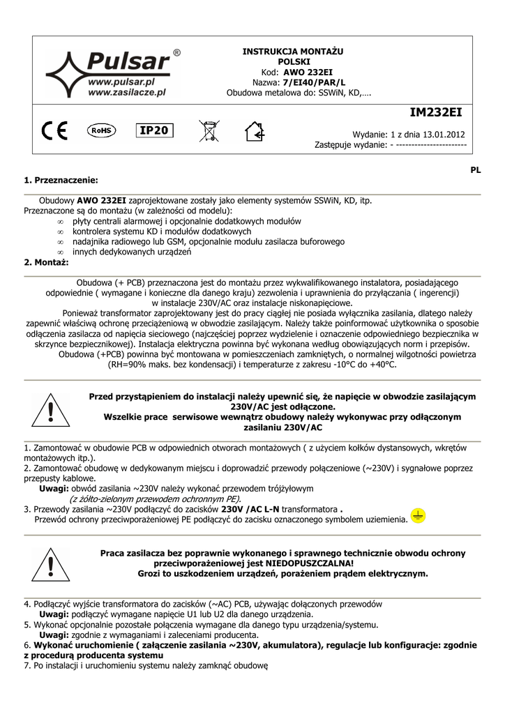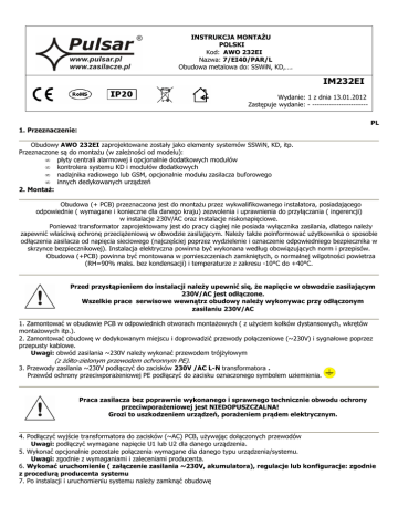 INSTRUKCJA MONTAŻU POLSKI Kod: AWO 232EI Nazwa: 7/EI40/PAR/L Obudowa metalowa do: SSWiN, KD,…. IM232EI Wydanie: 1 z dnia 13.01.2012 Zastępuje wydanie: - ----------------------PL 1. Przeznaczenie: Obudowy AWO 232EI zaprojektowane zostały jako elementy systemów SSWiN, KD, itp. Przeznaczone są do montażu (w zależności od modelu): • płyty centrali alarmowej i opcjonalnie dodatkowych modułów • kontrolera systemu KD i modułów dodatkowych • nadajnika radiowego lub GSM, opcjonalnie modułu zasilacza buforowego • innych dedykowanych urządzeń 2. Montaż: Obudowa (+ PCB) przeznaczona jest do montażu przez wykwalifikowanego instalatora, posiadającego odpowiednie ( wymagane i konieczne dla danego kraju) zezwolenia i uprawnienia do przyłączania ( ingerencji) w instalacje 230V/AC oraz instalacje niskonapięciowe. Ponieważ transformator zaprojektowany jest do pracy ciągłej nie posiada wyłącznika zasilania, dlatego należy zapewnić właściwą ochronę przeciążeniową w obwodzie zasilającym. Należy także poinformować użytkownika o sposobie odłączenia zasilacza od napięcia sieciowego (najczęściej poprzez wydzielenie i oznaczenie odpowiedniego bezpiecznika w skrzynce bezpiecznikowej). Instalacja elektryczna powinna być wykonana według obowiązujących norm i przepisów. Obudowa (+PCB) powinna być montowana w pomieszczeniach zamkniętych, o normalnej wilgotności powietrza (RH=90% maks. bez kondensacji) i temperaturze z zakresu -10°C do +40°C. Przed przystąpieniem do instalacji należy upewnić się, że napięcie w obwodzie zasilającym 230V/AC jest odłączone. Wszelkie prace serwisowe wewnątrz obudowy należy wykonywac przy odłączonym zasilaniu 230V/AC 1. Zamontować w obudowie PCB w odpowiednich otworach montażowych ( z użyciem kołków dystansowych, wkrętów montażowych itp.). 2. Zamontować obudowę w dedykowanym miejscu i doprowadzić przewody połączeniowe (~230V) i sygnałowe poprzez przepusty kablowe. Uwagi: obwód zasilania ~230V należy wykonać przewodem trójżyłowym (z żółto-zielonym przewodem ochronnym PE). 3. Przewody zasilania ~230V podłączyć do zacisków 230V /AC L-N transformatora . Przewód ochrony przeciwporażeniowej PE podłączyć do zacisku oznaczonego symbolem uziemienia. Praca zasilacza bez poprawnie wykonanego i sprawnego technicznie obwodu ochrony przeciwporażeniowej jest NIEDOPUSZCZALNA! Grozi to uszkodzeniem urządzeń, porażeniem prądem elektrycznym. 4. Podłączyć wyjście transformatora do zacisków (~AC) PCB, używając dołączonych przewodów Uwagi: podłączyć wymagane napięcie U1 lub U2 dla danego urządzenia. 5. Wykonać opcjonalnie pozostałe połączenia wymagane dla danego typu urządzenia/systemu. Uwagi: zgodnie z wymaganiami i zaleceniami producenta. 6. Wykonać uruchomienie ( załączenie zasilania ~230V, akumulatora), regulacje lub konfiguracje: zgodnie z procedurą producenta systemu 7. Po instalacji i uruchomieniu systemu należy zamknąć obudowę 3. Parametry techniczne Napięcie zasilania 230V/AC, 50Hz (-/+15%) EI 40/16/18 EN 61558-2-6 17Ah/12V 1x – otwarcie obudowy 500mA@50Vdc IP 20 -10ºC÷40ºC 90 [%] 320 x 300 x 90 [-/+2] [mm] Transformator Norma transformatora Miejsce dla akumulatora Zabezpieczenie antysabotażowe Obciążalność wyjścia TAMPER- max Obudowa: IP Temperatura pracy Wilgotność względna RH – max. Wymiary wewnętrzne (szer x wys x głeb) Wykonanie Blacha DC01, grubość: 0,7mm Zabezpieczenie antykorozyjne Kolor: RAL 9003 Zastosowanie Waga netto Waga brutto Do wewnątrz ~3.00 [kg] ~3.20 [kg] Parametry techniczne transformatora: EI 40/16/18 NAZWA C S U I U1 lub U2 I1 lub I2 F t EI 40/16/18 - 40VA 230V/AC 0,20A 16V lub 18V 2,2A lub 2,0A T 315mA/250V 130oC C- Obudowa transformatora S - Moc U - Napięcie zasilania I - Prąd pobierany przy nominalnym obciążeniu z sieci ~230V U1 lub U2 - Napięcia wtórne I1 lub I2 - Nominalny prąd wyjściowy F – Bezpiecznik F w obwodzie pierwotnym transformatora t- Bezpiecznik termiczny 130oC niepowracalny 4. Centrale które można zamontować w tej obudowie . • 7Ah: 1) (728 ULT, E55, E65, SP4000, 5500, 6000, 7000, EV048, 192, MG5000, 5050, PS17, ACM12) + 2x ZX8 ( 4xZX4, APR3- ADM2,APR3-HUB2, PGM4) • 17Ah: 1) (728 ULT, E55, E65, SP4000, 5500, 6000, 7000, EV048, 192, MG5000, 5050, PS17, ACM12) + ZX4 2 OZNAKOWANIE WEEE Zużytego sprzętu elektrycznego i elektronicznego nie wolno wyrzucać razem ze zwykłymi domowymi odpadami. Według dyrektywy WEEE obowiązującej w UE dla zużytego sprzętu elektrycznego i elektronicznego należy stosować oddzielne sposoby utylizacji. W Polsce zgodnie z przepisami o zużytym sprzęcie elektrycznym i elektronicznym zabronione jest umieszczanie łącznie z innymi odpadami zużytego sprzętu oznakowanego symbolem przekreślonego kosza. Użytkownik, który zamierza się pozbyć tego produktu, jest obowiązany do oddania ww. do punktu zbierania zużytego sprzętu. Punkty zbierania prowadzone są m. in. przez sprzedawców hurtowych i detalicznych tego sprzętu oraz gminne jednostki organizacyjne prowadzące działalność w zakresie odbierania odpadów. Prawidłowa realizacja tych obowiązków ma znaczenie zwłaszcza w przypadku, gdy w zużytym sprzęcie znajdują się składniki niebezpieczne, które mają negatywny wpływ na środowisko i zdrowie ludzi. GWARANCJA : 24 miesiące od daty sprzedaży , 36 miesięcy od daty produkcji. GWARANCJA WAŻNA tylko po okazaniu faktury sprzedaży, której dotyczy reklamacja PRODUCENT Pulsar K.Bogusz Sp.j. Siedlec 150, 32-744 Łapczyca, Poland Tel. (00 48) 14-610-19-40, Fax. (00 48) 14-610-19-50 e-mail: [email protected], [email protected] http:// www.pulsar.pl, www.zasilacze.pl 3
