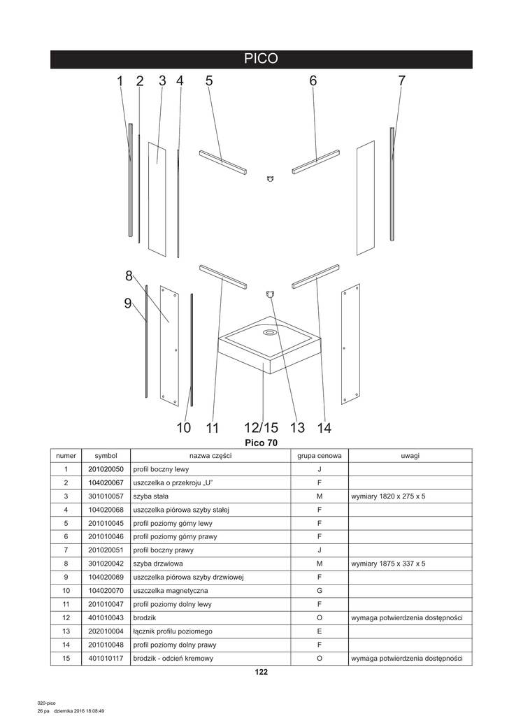 PICO 1 2 5 3 4 6 7 8 9 10 11 12/15 13 14 Pico 70 numer symbol nazwa części grupa cenowa 1 201020050 profil boczny lewy J 2 104020067 uszczelka o przekroju „U” F 3 301010057 szyba stała M 4 104020068 uszczelka piórowa szyby stałej F 5 201010045 profil poziomy górny lewy F 6 201010046 profil poziomy górny prawy F 7 201020051 profil boczny prawy J 8 301020042 szyba drzwiowa M 9 104020069 uszczelka piórowa szyby drzwiowej F 10 104020070 uszczelka magnetyczna G 11 201010047 profil poziomy dolny lewy F 12 401010043 brodzik O 13 202010004 łącznik profilu poziomego E 14 201010048 profil poziomy dolny prawy F 15 401010117 brodzik - odcień kremowy O 122 020-pico 26 pa dziernika 2016 18:08:49 uwagi wymiary 1820 x 275 x 5 wymiary 1875 x 337 x 5 wymaga potwierdzenia dostępności wymaga potwierdzenia dostępności Pico 80 numer symbol nazwa części grupa cenowa 1 201020050 profil boczny lewy J 2 104020067 uszczelka o przekroju „U” F 3 301010058 szyba stała M 4 104020068 uszczelka piórowa szyby stałej F 5 201010049 profil poziomy górny lewy F 6 201010050 profil poziomy górny prawy F 7 201020051 profil boczny prawy J 8 301020043 szyba drzwiowa M 9 104020069 uszczelka piórowa szyby drzwiowej F 10 104020070 uszczelka magnetyczna G 11 201010051 profil poziomy dolny lewy F 12 401010044 brodzik O 13 202010004 łącznik profilu poziomego E 14 201010052 profil poziomy dolny prawy F 15 401010118 O brodzik - odcień kremowy uwagi wymiary 1820 x 335 x 5 wymiary 1875 x 395 x 5 wymaga potwierdzenia dostępności wymaga potwierdzenia dostępności Pico 90 numer symbol nazwa części grupa cenowa 1 201020050 profil boczny lewy J 2 104020067 uszczelka o przekroju „U” F 3 301010059 szyba stała M 4 104020068 uszczelka piórowa szyby stałej F 5 201010053 profil poziomy górny lewy F 6 201010054 profil poziomy górny prawy F 7 201020051 profil boczny prawy J 8 301020044 szyba drzwiowa M 9 104020069 uszczelka piórowa szyby drzwiowej F 10 104020070 uszczelka magnetyczna G 11 201010055 profil poziomy dolny lewy F 12 401010045 brodzik P 13 202010004 łącznik profilu poziomego E 14 201010056 profil poziomy dolny prawy F 15 401010119 P brodzik - odcień kremowy 123 020-pico 26 pa dziernika 2016 18:08:49 uwagi wymiary 1820 x 385 x 5 wymiary 1875 x 440 x 5 wymaga potwierdzenia dostępności wymaga potwierdzenia dostępności Pico - akcesoria 1 2 3 4 5 6 7 8 9 10 11 12 13 14 15 16 17 18 19 20 numer symbol nazwa części grupa cenowa 1 701010021 zestaw wkrętów do montażu kabiny F 2 702020053 uchwyt szyby stałej A 3 105050007 drenaż H 4 702010024 rolka górna E średnica kółka 25 5 702010025 rolka dolna E średnica kółka 25 6 702020018 uchwyt drzwi C 7 702010017 odbojnik B 8 902010019 zestaw montażowy N 9 10 11 12 13 14 15 16 17 18 19 20 124 020-pico 26 pa uwagi dziernika 2016 18:08:49 rysunek poglądowy Pico 70 - paczki - wymaga potwierdzenia dostępności symbol nazwa części grupa cenowa uwagi 8006059075481007020102 paczka 1/2 Pico 70 R brodzik, profile poziome, zestaw montażowy 8006059075481007020202 paczka 2/2 Pico 70 S szyby przednie, szyby drzwiowe, profile pionowe, uszczelki Pico 80 - paczki - wymaga potwierdzenia dostępności symbol nazwa części grupa cenowa uwagi 8006059075481007190102 paczka 1/2 Pico 80 R brodzik, profile poziome, zestaw montażowy 8006059075481007190202 paczka 2/2 Pico 80 S szyby przednie, szyby drzwiowe, profile pionowe, uszczelki Pico 90 - paczki - wymaga potwierdzenia dostępności symbol nazwa części grupa cenowa 8006059075481007260102 paczka 1/2 Pico 90 S brodzik, profile poziome, zestaw montażowy 8006059075481007260202 paczka 2/2 Pico 90 S szyby przednie, szyby drzwiowe, profile pionowe, uszczelki 125 020-pico 26 pa uwagi dziernika 2016 18:08:49