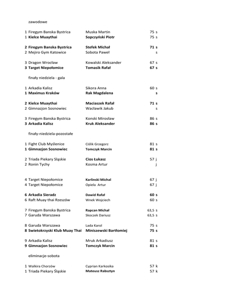 zawodowe 1 Firegym Banska Bystrica 1 Kielce Muaythai Muska Martin Sopczyoski Piotr 75 s 75 s 2 Firegym Banska Bystrica 2 Mejiro Gym Katowice Stefek Michał Sobota Paweł 71 s s 3 Dragon Wrocław 3 Target Niepołomice Kowalski Aleksander Tomasik Rafał 67 s 67 s 1 Arkadia Kalisz 1 Maximus Kraków Sikora Anna Rak Magdalena 60 s s 2 Kielce Muaythai 2 Gimnazjon Sosnowiec Maciaszek Rafał Wacławik Jakub 71 s s 3 Firegym Banska Bystrica 3 Arkadia Kalisz Konski Mirosław Kruk Aleksander 86 s 86 s 1 Fight Club Myślenice 1 Gimnazjon Sosnowiec Ciślik Grzegorz Tomczyk Marcin 81 s 81 s 2 Triada Piekary Sląskie 2 Ronin Tychy Cios Łukasz Kosma Artur 57 j j 4 Target Niepołomice 4 Target Niepołomice Karlinski Michal Opiela Artur 67 j 67 j 6 Arkadia Sieradz 6 Raft Muay thai Rzeszów Dawid Rafał Wnek Wojciech 60 s 60 s 7 Firegym Banska Bystrica 7 Garuda Warszawa Rapcan Michał Skoczek Dariusz 63,5 s 63,5 s finały niedziela - gala finały-niedziela-pozostałe 8 Garuda Warszawa Lada Karol 8 Swietokrzyski Klub Muay Thai Miniszewski Bartłomiej 75 s 75 s 9 Arkadia Kalisz 9 Gimnazjon Sosnowiec Mruk Arkadiusz Tomczyk Marcin 81 s 81 s Cyprian Karkosika Mateusz Rabsztyn 57 k 57 k eliminacje-sobota 1 Walkira Chorzów 1 Triada Piekary Śląskie 2 Perfekcja Tarnów 2 Arkadia Kalisz Kocan Agnieszka Sikora Anna 57 s 57 s 3 Arkadia Kalisz 3 Maximus Kraków Bąk Patryk Borgiasz Krzysztof 60 j 60 j 4 Triada Piekary Śląskie 4 Fight Club Myślenice Szendzielorz Marcin Hyży Mateusz 75 s 75 s 5 Garuda Warszawa 5 Fight Club Niepołomice Łada Karol Smoter Michal 75 s 75 s 6 Raft Muay thai Rzeszów 6 Pro Fighter Lublin Lipka Tomasz Cichorz Artur 75 s 75 s 7 Muay Thai Kielce 7 Pro Fighter Lublin Mniszewski Bartlomiej Majchrowski Marcin 75 75 8 Target Niepołomice 8 Perfekcja Tarnów Kasprzyk Magdalena Bezlowska Ewa 54 54 9 Arkadia Kalisz 9 Krak-sport Kraków Kopacki Piotr Kacparek Kamil 71 j 71 j 10 Firegym Banska Bystrica 10 Triada Piekary Slaskie Kooski Mirosław Rąba Grzegorz 86 s 86 s 11 Maximus Kraków 11 Fight Club Myślenice Jnglot Michał Wincenciak Patryk 86 s s 12 Arkadia Kalisz 12 Brutals Łódz Aleksander Kruk Sidowski Maciej 86 s 86 s 13 Fight Club Myślenice 13 Raft Muaythai Rzeszów Fijał Sebastian Bednarczyk Paweł 86 s s 14 Arkadia Kalisz 14 Ronin Tychy Góra Adrian Długajczyk Daniel 63,5 j 63,5 j 15 Ronin Tychy 15 Brutals Łódz Wójcik Jakub Kucioski Dawid 75 j 75 j 16 Raft Muay thai Rzeszów 16 Gimnazjon Sosnowiec Ząbek Dawid Tomczyk Marcin 81 s 81 s 17 Brutals Łódź 17 Fight Club Myślenice Michałecki Maciej Szczepaniak Łukasz 81 s 81 s 18 Krak-Sport Kraków 18 Arkadia Kalisz Szczurek Dawid Duczmal Mateusz 81 s 81 s 19 Arkadia Kalisz 19 Fight Club Myślenice Mruk Arkadiusz Malina Mateusz 81 s 81 s 20 Fight Club Myślenice 20 Garuda Ciślik Grzegorz Wojas Karol 81 s 81 s 21 Gimnazjon Sosnowiec 21 Fight Club Myślenice Wacławik Jakub Justyniak Witold 71 s 71 s 22 Fight Club Myślenice 22 Garuda Warszawa Smoter Michał Przybyszewski Marek 71 s 71 s 23 Kielce Muaythai 23 Triada Piekary Śląskie Maciaszek Rafał Kowalski Mariusz 71 s 71 s 24 Arkadia Kalisz 24 Brutals Łódź Bąk Patryk Tomala Maciej 60 s 60 s 25 Triada Piekary Śląskie 25 Ronin Tychy Figura Sławomir Kosma Artur 57 j 57 j 26 Triada Piekary Sląskie 26 Cios Łukasz Sęk Łukasz 57 j 57 j 27 Fight Club Myślenice 27 Muaythai Kielce Wojtyca Dawid Zawada Daniel 60 s 60 s 28 Arkadia Sieradz 28 Raft Muay thai Rzeszów Dawid Rafał Gorlowski Sebastian 60 s 60 s 29 Arkadia Kalisz 29 Triada Piekary Sląskie Wytwer Adrian Sadowski Jakub 67 s 67 s 30 Firegym Banska Bystrica 30 Raft Muay thai Rzeszów Rapcan Michał Pacuła Mariusz 63,5 s 63,5 s 31 Pro-Fighter Lublin 31 Ronin Tychy Kuszewski Piotr Wojtynek Sławomir 81 j 81 j 32 Target Niepołomice 32 Karlioski Michał Siwonia Karol 67 33 Target Niepołomice 33 Target Niepołomice Opiela Artur Mirochna Łukasz 67 67 34 Ronin Tychy 34 Triada Piekary Śląskie Nowicki Adam Rąba Grzegorz 91 91 35 Krak-sport Kraków 35 Raft Muay thai Rzeszów Miekina Przemysław Kucharski Mateusz 91 91 36 Garuda Warszawa 36 Brutals Łódź Szczepklowski Tomasz Stryjewski Kamil 91 s 91 s 37 Garuda Warszawa 37 Łukasz Koziatek Bala Tomasz Koziatek Tomasz 38 Triada Piekary Śląskie 38 Garuda Warszawa Szendzielorz Marcin Łada Karol 75 s 75 s 39 Raft Muay thai Rzeszów 39 Muaythai Kielce Lipka Tomasz Mniszewski Bartłomiej 75 s 75 s 40 Arkadia Kalisz 40 Raft Muaythai Rzeszów Kruk Aleksander Bednarczyk Paweł 86 s 86 s 41 Gymnazjon Sosnowiec 41 Brutals Łódź Tomczyk Marcin Michałecki Maciej 81 s 81 s 42 Arkadia Kalisz 42 Arkadia Kalisz Duczmal Mateusz Mruk Arkadiusz 81 s 81 s 43 Gymnazjon Sosnowiec 43 Garuda Warszawa Wacławik Jakub Przybyszewski Marek 71 s 71 s 45 Arkadia Kalisz 45 Kraksport- Kraków Wytwer Adrian Paszcza Grzegorz 67 s 67 s open open