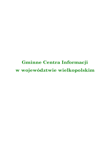Gminne Centra Informacji w województwie wielkopolskim W jakim celu powstały? Gminne Centra Informacji mają za zadanie ułatwienie lokalnym społecznościom dostępu do szerokiej gamy usług teleinformatycznych. Są wyspecjalizowanymi placówkami wyposażonymi w stanowiska komputerowe. Najczęściej zlokalizowane są w gminnych domach kultury, szkołach, czy innych miejscach skupiających społeczności lokalne. Zgodnie z założeniami Centra dysponują informacjami o ofertach pracy, możliwościach podjęcia działań o charakterze wolontariackim, zawodach, szkołach i instytucjach szkolących, warunkach i procedurach uruchamiania własnej działalności gospodarczej, a także informacjami z zakresu prawa pracy, praw i obowiązków bezrobotnego, funduszy europejskich, adresami urzędów pracy i innych organizacji świadczących pomoc uczestnikom rynku pracy. Informacje dostępne są w GCI zarówno w formie papierowej jak i elektronicznej. Oferowane usługi świadczone są bezpłatnie. Kiedy zostały utworzone? Gminne Centra Informacji w Wielkopolsce zostały utworzone w ramach czterech edycji konkursu o grant Ministerstwa Gospodarki i Pracy w latach 2002-2005. Konkurs w ramach I edycji grantu przeprowadzony był przez Ministerstwo, pozostałe trzy przez Samorząd Województwa Wielkopolskiego Wojewódzki Urząd Pracy w Poznaniu. Kwota rozdysponowana na granty przyznane Wnioskodawcom z Wielkopolski w ramach czterech edycji to 4 959 855,63 zł. Ogółem w regionie powstały 92 Gminne Centra Informacji. W ramach poszczególnych edycji grantów powstało: I edycja – 7 Centrów, II edycja – 45 Centrów, III edycja – 32 Centra, IV edycja – 8 Centrów. Ponadto w ramach IV edycji grantu, 16 centrów otrzymało dofinansowanie na rozwój swojej działalności. W ramach udzielonych dotacji GCI były zobligowane do funkcjonowania w okresie od roku (I i II edycja konkursu) do dwóch lat (III i IV edycja). 2 Jak jest obecnie? Na terenie województwa wielkopolskiego działa 31 Gminnych Centrów Informacji. 3 Adresy Gminnych Centrów Informacji Gminne Centrum Informacji Adres Telefon/email 1 Urząd Gminy Baranów ul. Rynek 21 63-604 Baranów (62) 781 04 54 [email protected] 2 Gminne Centrum Informacji ul. Łokietka 31 64 - 840 Budzyń (67) 284 35 75 [email protected] 3 Urząd Miasta i Gminy Buk ul. Ratuszowa 1 64 - 320 Buk (61) 814 06 71 [email protected] 4 Centrum Edukacyjno-Oświatowe ul. Żeromskiego2 63 - 313 Chocz (62) 741 55 94 [email protected] 5 Gminne Centrum Informacji ul. Czermin 47 63 - 304 Czermin (62) 741 68 91 [email protected] 6 Gminne Centrum Informacji Plac Kazimierza Wielkiego 2 62 - 590 Golina (63) 241 83 48 [email protected] 7 Gminne Centrum Informacji ul. Kowalika 2 62 - 130 Gołańcz (67) 261 51 00 [email protected] 8 Gminne Centrum Informacji Jutrosin ul. Mickiewicza 2 63 - 930 Jutrosin (65) 547 24 88 [email protected] 9 Gminne Centrum Informacji pl. Kościuszki 5 62 - 540 Kleczew (63) 270 09 11 [email protected] 10 Stowarzyszenie Młodych Wielkopolan ul. Gnieźnieńska 8 62 - 270 Kłecko (61) 427 00 64, fax (61) 427 00 66 [email protected] 11 Biuro Rozwoju Lokalnego pl. Kościuszki 3 63 - 840 Krobia (65) 571 26 45 [email protected] 12 Gminne Centrum Informacji w Krotoszynie ul. Benicka 9 63 - 700 Krotoszyn (62) 725 27 83 [email protected] 13 Gminne Centrum Informacji z Klubem Pracy ul. Kościuszki 11 62 - 290 Mieścisko (61) 427 82 11 [email protected] 14 Gminne Centrum Informacje w Mosinie ul. Dworcowa 4 62 - 050 Mosina (61) 819 27 46 [email protected] 15 Urząd Miasta i Gminy Nowe Skalmierzyce ul. Ostrowska 8 63 - 460 Nowe Skalmierzyce (62) 762 97 95 [email protected] 16 Urząd Gminy i Miasta Odolanów Gminne Centrum Informacji ul. Rynek 1 63 - 430 Odolanów (62) 733 15 81 wew. 35 [email protected] 17 Gminne Centrum Informacji w Ostrorogu ul. Wroniecka 14 64 - 560 Ostroróg (61) 291 65 89 [email protected] 18 Gminne Centrum Informacji przy Stowarzyszeniu "Ostrzeszowskie Centrum Przedsiębiorczości" ul. Przemysłowa 27 63 - 500 Ostrzeszów (62) 730 17 35 [email protected] 4 Gminne Centrum Informacji i Dialogu Społecznego ul. Rynek 1 63 - 900 Rawicz (65) 545 38 25 [email protected] 20 Urząd Gminy Rzgów ul. Konińska 8 62 - 586 Rzgów (63) 241 90 18 wew. 37, (63) 241 90 21, fax 63 241 90 67 [email protected] 21 Urząd Gminy Stare Miasto ul. Główna 16b 62 - 571 Stare Miasto (63) 241 62 16 [email protected] 22 Gminne Centrum Informacji ul. Działkowa 61 a 62 - 020 Swarzędz (61) 818 17 30 [email protected] Gminne Centrum Informacji przy Centrum Kultury w Śmiglu Unia Gospodarcza Regionu Śremskiego – Śremski Ośrodek Wspierania Małej Przedsiębiorczości ul. Kościuszki 20 64 - 030 Śmigiel (65) 518 02 73, (65) 518 03 17 [email protected], [email protected] ul. Okulickiego 3 63 - 100 Śrem (61) 283 27 04 [email protected] 25 Ośrodek Wspierania Przedsiębiorczości ul. Sikorskiego 7 64 - 980 Trzcianka (67) 352 73 50 [email protected] 26 Urząd Gminy Wapno ul. Świerczewskiego 12 62 - 120 Wapno (67) 268 72 59 [email protected] 27 Gminne Centrum Informacji Wągrowiec ul. Średnia 18 62 - 100 Wągrowiec (67) 268 91 82 [email protected], [email protected] 28 Gminne Centrum Informacji Wilczyn ul. Rynek 14 62 - 550 Wilczyn (63) 268 31 68 [email protected] 29 Gminne Centrum Informacji Wolsztyn ul. Dr Kocha 12a 64 - 200 Wolsztyn (68) 347 31 04 [email protected] 30 Miejska Biblioteka Publiczna w Złotowie ul. Grochowskiego 17 77 - 400 Złotów (67) 263 20 00 [email protected] 31 Gminne Centrum Informacji w Żelazkowie ul. Żelazków 138 62 - 817 Żelazków (62) 769 21 78 [email protected] 19 23 24 Działania WUP na rzecz GCI Wojewódzki Urząd Pracy w Poznaniu mając na względzie konieczność pomocy Gminnym Centrom Informacji z terenu Wielkopolski i stałego przekazywania bieżących informacji o wielkopolskim rynku pracy podejmuje szereg działań na rzecz GCI, w tym: - przesyła przygotowywane analizy, raporty, dokumenty dotyczące rynku pracy, - bierze udział w tra