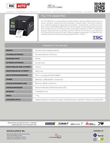 Białołęcka 158E • 03-253 Warszawa • tel.: +48+48 22 510 14 40 • fax: +48+48 22 741 69 33 • hotline 24h:24h: +48+48 22 510 14 79 • e-mail: [email protected] • www.rscautoid.pl Białołęcka 158E • 03-253 Warszawa • tel.: 22 510 14 40 • fax: 22 741 69 33 • hotline 22 510 14 79 • e-mail: [email protected] • www.rscautoid.pl TSC TTP 346M PRO INTERMEC INTERMECPC23D PC23D TSC TTP-346M Pro to wysokowydajna drukarka etykiet z głowicą 300dpi przeznaczona do dużych obciążeń. Solidna konstrukcja: podstawa i szkielet odlane z aluminium zamknięDrukarka Intermec PC23d jestjest małym gabarytowo urządzeniem, które nadaje sięsię dodo Drukarka Intermec PC23d małym gabarytowo urządzeniem, które nadaje te w metalowej obudowie zapewniają wytrzymałość i niezawodność. 32-bitowy procesor wielu zastosowań, gdzie najczęściej potrzebna jest mniejsza ilość etykiet czy też opawielu zastosowań, gdzie8MB najczęściej jest mniejsza czy też opaRISC, pamięć 32MB SDRAM, Flash orazpotrzebna slot kart pamięci SD (maxilość 4GB)etykiet gwarantują szybsek. Drukarka PC23d prosta wmożna obsłudze. Posiada wyświetlacz LCD. sek. Drukarka PC23d prosta w obsłudze. Posiada wbudowany wyświetlacz LCD. kość i wydajność pracy.jest Wjest drukarce używać kalki owbudowany długości aż 600m. Standardowo drukarka wyposażona jest w interfejsy: Ethernet, USB 2.0, RS, Centronics i port klawiatury PS2. Przemysłowy interfejs GPIO i port USB host dostępne są jako opcje. TTP-346M Pro standardowo posiada wbudowaną emulację języków Eltron® i Zebra®. INTERMEC PC23D Metoda Druku Metoda Druku Max. szer. druku Max. szer. druku RODZAJ Max długość druku Max długość druku TECHNIKA WYDRUKU Standardowe Standardowe wyposażenie wyposażenie ROZDZIELCZOŚĆ Prędkość druku Prędkość druku Termiczna Termiczna 5656 mm mm SPECYFIKACJA TECHNICZNA SPECYFIKACJA TECHNICZNA PARAMETRY TECHNICZNE Drukarka etykiet półprzemysłowa 1727 mm 1727 mm Termotransferowa / termiczna Zegar Czasu Rzeczywistego (RTC) Zegar Czasu Rzeczywistego (RTC) 300 dpi 8 dots/mm 8 dots/mm 5454 mm mm 900 mm 900 mm 1212 dots/mm dots/mm SZYBKOŚĆ WYDRUKU Rozdzielczość Rozdzielczość 203 dpi 203 dpi Do 203 mm/s 300dpi 300dpi 6060 mm mm Max. szer. etykiety Max. szer. etykiety MAKSYMALNA SZER. ETYKIETY 104 mm. Komunikacja Komunikacja Standardowo: USB 2.0, USB Host Opcjonalnie: Serial, parallel, WiFi, Bluetooth Standardowo: USB 2.0, USB Host Opcjonalnie: Serial, parallel, WiFi, Bluetooth MAKSYMALNA DŁ. ETYKIETY 1854,2 mm. PL,PL, Fingerprint, ZSim (ZPLII Simulation), ESim (EPL2 Simulation), DSim (DPL Fingerprint, ZSim (ZPLII Simulation), ESim (EPL2 Simulation), DSim (DPL Firmware Firmware Simulation), XML enabled for SAP® AII and Oracle® WMS Simulation), XML enabled for SAP® AII and Oracle® WMS JĘZYK OPROGRAMOWANIA TSPL2 + Emulacja ELTRON®/ZEBRA® Wewn. średnica Wewn. średnica 12,7mm(1/2”); 26mm (1”) 12,7mm(1/2”); 26mm (1”) 8MB Flash, 32MB SDRAM + slot kart SD Max. długość taśmy Max. długość taśmy 91,1m lub 274,32m 91,1m lub 274,32m ZŁĄCZE KOMUNIKACYJNE Ethernet, USB, RS i Centronics 2,36” – 4,33” Szerokość taśmy 2,36” – 4,33” Szerokość taśmy taśmy rolki taśmy PAMIĘĆ rolki Pamięć wbudowana Pamięć wbudowana OPROGRAMOWANIE Fonty wbudowane Fonty wbudowane WYMIARY Drukowane kody Drukowane kody WAGA DOSTĘPNE OPCJE Temperatura Temperatura Wilgotność Wilgotność Waga Waga Parametry fizyczne Parametry fizyczne Opcje dodatkowe Opcje dodatkowe Zastosowanie Zastosowanie 128MB Flash memory, 128MB SDRAM (opcjonalnie dodo 32GB) 128MB Flash memory, 128MB SDRAM (opcjonalnie 32GB) Sterowniki Windows, BarTender (wersja TSC) 1212 Monotype True Type fonts i 4i bitmap fonts (tylko IPL) Monotype True Type fonts 4 bitmap fonts (tylko IPL) 270x308x505 mm 1D1D - wszystkie główne kody jednowymiarowe - wszystkie główne kody jednowymiarowe 2D2D - Aztec, Code 16K, Code 49, Data Matrix, Dot Code, EAN-8, EAN-13, EAN.UCC 128, Grid Matrix, - Aztec,11Code Data Matrix, Dot Code, EAN-8, EAN-13, EAN.UCC 128, Grid Matrix, kg 16K, Code 49, HIBC 39, HIBC 128, MaxiCode, MSI, PDF417, Micro PDF417, Planet, Plessey, Postnet, QR-Code, RSS-14 HIBC 39, HIBC 128, MaxiCode, MSI, PDF417, Micro PDF417, Planet, Plessey, Postnet, QR-Code, RSS-14 odklejak, gilotyna, wewnętrzny nawijak, moduł Bluetooth, moduł Wi-Fi, USB host, interfejs GPIO 5 –5 40˚C – 40˚C 10-80 %% bez kondensacji 10-80 bez kondensacji 1.45 kgkg 1.45 177 x 125 x 215 mm (wysokość x szerokość x długość) 177 x 125 x 215 mm (wysokość x szerokość x długość) Dyspenser Dyspenser Opieka zdrowotna, transport, handel i biuro. Opieka zdrowotna, transport, handel i biuro. Zapewniamy oprogramowanie i materiały Zapewniamy oprogramowanie i materiały eksploatacyjne renomowanych firm eksploatacyjne renomowanych firm EXCELLENCE EXCELLENCEIN: IN: digital & flexo label printing andand converting digital & flexo label printing converting automated labelling systems automated labelling systems supply chain management solutions supply chain management solutions professional multi-platform services professional multi-platform services MEMBER OFOF MEMBER