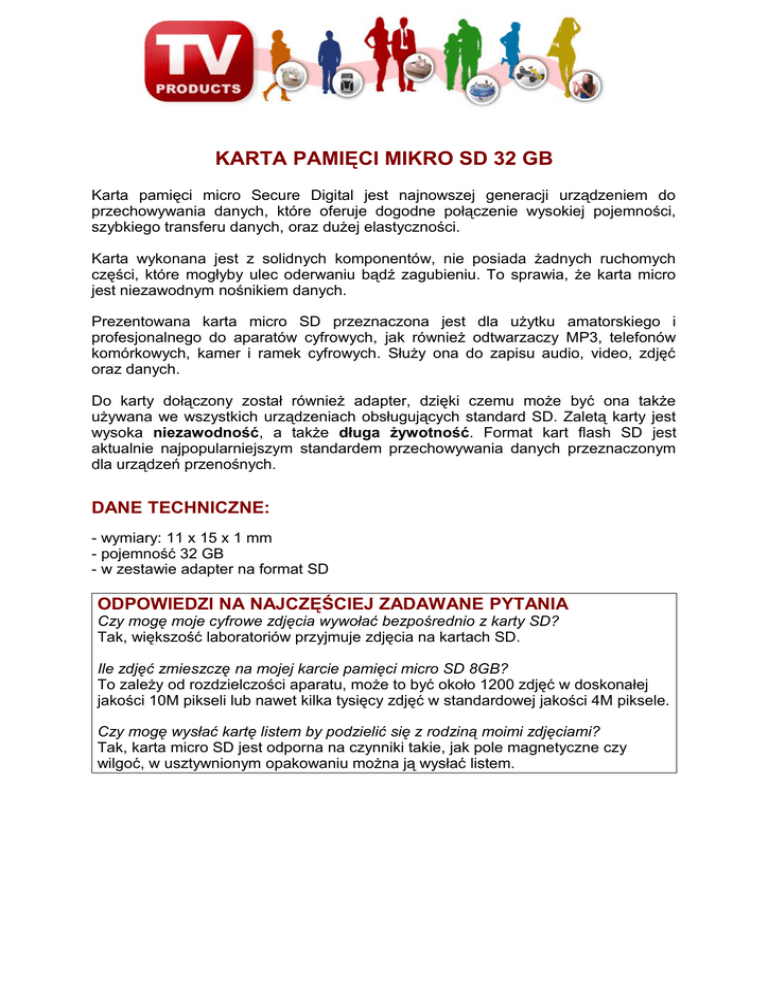 KARTA PAMIĘCI MIKRO SD 32 GB Karta pamięci micro Secure Digital jest najnowszej generacji urządzeniem do przechowywania danych, które oferuje dogodne połączenie wysokiej pojemności, szybkiego transferu danych, oraz dużej elastyczności. Karta wykonana jest z solidnych komponentów, nie posiada żadnych ruchomych części, które mogłyby ulec oderwaniu bądź zagubieniu. To sprawia, że karta micro jest niezawodnym nośnikiem danych. Prezentowana karta micro SD przeznaczona jest dla użytku amatorskiego i profesjonalnego do aparatów cyfrowych, jak również odtwarzaczy MP3, telefonów komórkowych, kamer i ramek cyfrowych. Służy ona do zapisu audio, video, zdjęć oraz danych. Do karty dołączony został również adapter, dzięki czemu może być ona także używana we wszystkich urządzeniach obsługujących standard SD. Zaletą karty jest wysoka niezawodność, a także długa żywotność. Format kart flash SD jest aktualnie najpopularniejszym standardem przechowywania danych przeznaczonym dla urządzeń przenośnych. DANE TECHNICZNE: - wymiary: 11 x 15 x 1 mm - pojemność 32 GB - w zestawie adapter na format SD ODPOWIEDZI NA NAJCZĘŚCIEJ ZADAWANE PYTANIA Czy mogę moje cyfrowe zdjęcia wywołać bezpośrednio z karty SD? Tak, większość laboratoriów przyjmuje zdjęcia na kartach SD. Ile zdjęć zmieszczę na mojej karcie pamięci micro SD 8GB? To zależy od rozdzielczości aparatu, może to być około 1200 zdjęć w doskonałej jakości 10M pikseli lub nawet kilka tysięcy zdjęć w standardowej jakości 4M piksele. Czy mogę wysłać kartę listem by podzielić się z rodziną moimi zdjęciami? Tak, karta micro SD jest odporna na czynniki takie, jak pole magnetyczne czy wilgoć, w usztywnionym opakowaniu można ją wysłać listem.