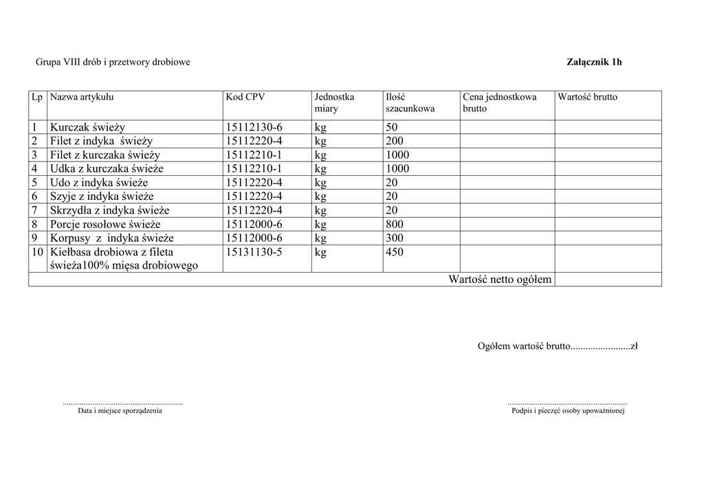 Grupa VIII drób i przetwory drobiowe Lp Nazwa artykułu 1 2 3 4 5 6 7 8 9 10 Kurczak świeży Filet z indyka świeży Filet z kurczaka świeży Udka z kurczaka świeże Udo z indyka świeże Szyje z indyka świeże Skrzydła z indyka świeże Porcje rosołowe świeże Korpusy z indyka świeże Kiełbasa drobiowa z fileta świeża100% mięsa drobiowego Załącznik 1h Kod CPV Jednostka miary Ilość szacunkowa 15112130-6 15112220-4 15112210-1 15112210-1 15112220-4 15112220-4 15112220-4 15112000-6 15112000-6 15131130-5 kg kg kg kg kg kg kg kg kg kg 50 200 1000 1000 20 20 20 800 300 450 Cena jednostkowa brutto Wartość brutto Wartość netto ogółem Ogółem wartość brutto........................zł ................................................................ Data i miejsce sporządzenia ................................................................ Podpis i pieczęć osoby upoważnionej
