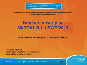 Spotkanie informacyjne współfinansowane ze środków Unii Europejskiej w ramach Europejskiego Funduszu Społecznego Konkurs otwarty nr 38/POKL/8.1.1/PWP/2013 Spotkanie informacyjne, 01 sierpień 2013 r. Grzegorz Wyciślak Wojewódzki Urząd Pracy w Rzeszowie Wydział Rozwoju Kadr Regionu Typy projektów przewidziane do realizacji • ogólne i specjalistyczne szkolenia oraz doradztwo związane ze szkoleniami dla kadr zarządzających i pracowników MMŚP, w zakresie zgodnym ze zdiagnozowanymi potrzebami przedsiębiorstw i w formie odpowiadającej możliwościom organizacyjnotechnicznym przedsiębiorstw. Typy projektów przewidziane do realizacji • doradztwo dla mikro-, małych i średnich przedsiębiorstw, w tym osób fizycznych prowadzących działalność gospodarczą Grupy docelowe Mikro, mali i średni przedsiębiorcy i ich pracownicy BRAK MOŻLIWOŚCI WSPARCIA DLA DUŻYCH FIRM!!! Ocena formalna wniosku Karta oceny formalnej – Załącznik nr 8.2 do Dokumentacji konkursowej 1). Biuro na terenie woj. podkarpackiego; 2). Termin realizacji do 30.06.2015r.; 3). Grupa docelowa z terenu woj. podkarpackiego; 4). Wsparcie zgodne ze zdiagnozowanymi potrzebami uczestników; 5). Adaptowanie rozwiązań wypracowanych w innym kraju – wymagana realizacja projektu w partnerstwie ponadnarodowym!!! Ocena merytoryczna wniosku Karta oceny merytorycznej – Załącznik nr 8.4 do Dokumentacji konkursowej Uwaga! Zasada równości szans kobiet i mężczyzn (standard minimum) Standard minimum jest spełniony w przypadku uzyskania 2 pozytywnych odpowiedzi na pytania zawarte w punkcie 5 Części A Karty oceny merytorycznej Komponent ponadnarodowy Projekt z komponentem ponadnarodowym to projekt, który na poziomie analizy problemów/potrzeb grup docelowych wykazuje uzasadnioną potrzebę realizacji komponentu ponadnarodowego, oraz którego cel/cele szczegółowe wskazują na możliwość ich osiągnięcia wyłącznie w wyniku współpracy ponadnarodowej. Realizacji komponentu ponadnarodowego wnosi rzeczywistą wartość dodaną wynikającą z wymiany wiedzy, doświadczenia i wzajemnego uczenia się partnerów ponadnarodowych możliwą do osiągnięcia jedynie przy ich udziale. Rzeczywistą wartość dodaną należy rozumieć, jako realizację celów projektu poprzez wzrost wskaźników – produktów projektu wynikający z jego realizacji we współpracy z partnerami zagranicznymi a niemożliwy do uzyskania bez tej współpracy lub wprowadzenie nowych produktów, które byłyby zupełnie niemożliwe do uzyskania bez udziału partnerów ponadnarodowych. Komponent ponadnarodowy Formy współpracy ponadnarodowej możliwe w ramach ogłoszonego konkursu to: 1. organizowanie konferencji, seminariów, warsztatów i spotkań – zalecane wyłącznie jako jedno z kilku działań planowanych w ramach współpracy ponadnarodowej, 2. przygotowanie, tłumaczenia i wydawanie publikacji, opracowań, raportów – zalecane wyłącznie jako jedno z kilku działań planowanych w ramach współpracy ponadnarodowej, 3. adaptowanie rozwiązań wypracowanych w innym kraju – może stanowić samodzielny element projektu z komponentem ponadnarodowym, 4. doradztwo, wymiana pracowników, staże, wizyty studyjne – może być samodzielnym elementem projektu z komponentem ponadnarodowym, 5. wypracowywanie nowych rozwiązań – może stanowić samodzielny element projektu z komponentem ponadnarodowym. Komponent ponadnarodowy Możliwe jest zastosowanie jednego z poniższych modeli współpracy: Model 1: wymiana informacji i doświadczeń – brak zastosowania jako samodzielnego modelu 1 współpracy; jest możliwości Model 2: równoległe wypracowywanie nowatorskich rozwiązań; Model 3: import, eksport i adaptacja nowych rozwiązań do swojej instytucji; Model 4: wspólne tworzenie produktu lub systemu; Model 5: wymiana kluczowych osób realizujących projekt lub uczestniczących w projekcie - brak jest możliwości zastosowania jako samodzielnego modelu 5 współpracy. Rodzaje pomocy publicznej w ramach Poddziałania 8.1.1 PO KL Pomoc publiczna na szkolenia Pomoc publiczna na usługi doradcze dla MSP Pomoc de minimis Szkolenia ogólne Szkolenie teoretyczne lub praktyczne, prowadzące do zdobycia przez pracownika kwalifikacji, które będzie mógł wykorzystać zarówno na obecnym stanowisku pracy u danego beneficjenta pomocy, jak również na przyszłych stanowiskach pracy oraz innych polach działalności zawodowej. Szkolenia specjalistyczne Szkolenie teoretyczne lub praktyczne, prowadzące do zdobycia przez pracownika kwalifikacji zasadniczo i bezpośrednio przydatnych na obecnym lub przyszłym stanowisku pracy u danego beneficjenta pomocy oraz bezpośrednio powiązanych ze specyfiką prowadzonej przez niego działalności, których nie będzie mógł on wykorzystać lub też będzie mógł wykorzystać w ograniczonym stopniu w innych przedsiębiorstwach lub na innych polach działalności zawodowej Wydatki kwalifikowane 1) wynagrodzenia oraz obowiązkowe składki na ubezpieczenie społeczne, osób prowadzących szkolenie, 2) podróże służbowe oraz zakwaterowanie osób prowadzących szkolenie, beneficjentów pomocy oraz pracowników beneficjentów pomocy oddelegowanych na szkolenie; 3) pokrycie innych kosztów bieżących szkolenia, w tym kosztów materiałów szkoleniowych oraz ich dostawy 4) najem, dzierżawa, leasing operacyjny pomieszczeń lub sprzętu związany bezpośrednio z realizacją szkolenia Wydatki kwalifikowane cd 5) amortyzacja narzędzi i wyposażenia w zakresie w jakim są one wykorzystywane do realizacji szkoleń 6) koszty poradnictwa w jakim dotyczą szkolenia i doradztwa w zakresie, 7) koszty ogólne związane z realizacją szkolenia (koszty obsługi administracyjno-księgowej i finansowej projektu) 8) wynagrodzenie beneficjentów pomocy lub pracowników beneficjentów pomocy oddelegowanych na szkolenie, obliczone za czas ich faktycznego uczestnictwa w szkoleniu. Uwaga!!! Wydatki o których mowa w pkt 