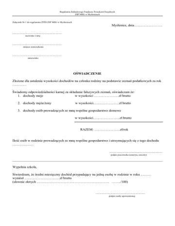Oświadczenie do Zakładowego Funduszu Świadczeń Socjalnych