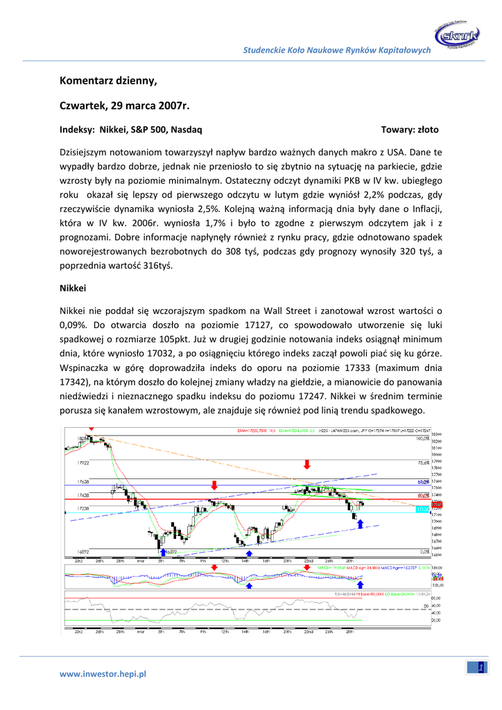 Studenckie Koło Naukowe Rynków Kapitałowych Komentarz dzienny, Czwartek, 29 marca 2007r. Indeksy: Nikkei, S&P 500, Nasdaq Towary: złoto Dzisiejszym notowaniom towarzyszył napływ bardzo ważnych danych makro z USA. Dane te wypadły bardzo dobrze, jednak nie przeniosło to się zbytnio na sytuację na parkiecie, gdzie wzrosty były na poziomie minimalnym. Ostateczny odczyt dynamiki PKB w IV kw. ubiegłego roku okazał się lepszy od pierwszego odczytu w lutym gdzie wyniósł 2,2% podczas, gdy rzeczywiście dynamika wyniosła 2,5%. Kolejną ważną informacją dnia były dane o Inflacji, która w IV kw. 2006r. wyniosła 1,7% i było to zgodne z pierwszym odczytem jak i z prognozami. Dobre informacje napłynęły również z rynku pracy, gdzie odnotowano spadek noworejestrowanych bezrobotnych do 308 tyś, podczas gdy prognozy wynosiły 320 tyś, a poprzednia wartość 316tyś. Nikkei Nikkei nie poddał się wczorajszym spadkom na Wall Street i zanotował wzrost wartości o 0,09%. Do otwarcia doszło na poziomie 17127, co spowodowało utworzenie się luki spadkowej o rozmiarze 105pkt. Już w drugiej godzinie notowania indeks osiągnął minimum dnia, które wyniosło 17032, a po osiągnięciu którego indeks zaczął powoli piać się ku górze. Wspinaczka w górę doprowadziła indeks do oporu na poziomie 17333 (maximum dnia 17342), na którym doszło do kolejnej zmiany władzy na giełdzie, a mianowicie do panowania niedźwiedzi i nieznacznego spadku indeksu do poziomu 17247. Nikkei w średnim terminie porusza się kanałem wzrostowym, ale znajduje się również pod linią trendu spadkowego. www.inwestor.hepi.pl 1 Studenckie Koło Naukowe Rynków Kapitałowych Jutrzejsze notowanie może przynieść odpowiedz na pytanie jak dalej będzie poruszał się Nikkei. Jeśli zdoła podnieść się w górę i przebić trend spadkowy, będzie to świadczyło o większej sile byków i wzrostach w dłuższym terminie, natomiast spadek w dół utrzyma nas jeszcze w niepewności. Prawdopodobnie jednak Nikkei potrzyma nas jeszcze w niepewności i jutro straci na wartości. Takie przypuszczenia pozwalają snuć odczyty z RSI wykresu dziennego (poniżej), który przebił nieznacznie poziom równowagi od góry, a także minimalnie naruszył trend wzrostowy. Również MACD systematycznie traci swoją moc i jest bliski wskazania sygnału sprzedaży. Ważne poziomy jutrzejszego notowania to opór 17333 oraz wsparcie 17135. S&P 500 Indeks z Wall Street zakończył dzień na plusie, osiągając dzienną stopę zwrotu na poziomie 0,20%. Wartość „open” dzisiejszego notowania znalazła się minimalnie niżej wczorajszego zamknięcia na poziomie 1418,9 (wczoraj: 1419,0). Po początkowym wzroście wartości i osiągnięciu maximum dziennego 1427,0 indeks powędrował w dół, opuszczając na chwilę krótkoterminowy kanał spadkowy, którym się porusza, gdzie zanotował minimum dnia 1412,3. Jednak pod koniec dnia byki pokazały na co je stać i wyciągnęły indeks w górę do poziomu 1421,8, gdzie nastąpiło zakończenie sesji. www.inwestor.hepi.pl 2 Studenckie Koło Naukowe Rynków Kapitałowych Jutro SP500 prawdopodobnie nie utrzyma dzisiejszego wzrostu i polegnie pod naporem niedźwiedzi. Świadczy o tym przebicie RSI linii trendu oraz bardzo słaba kondycja MACD, które wciąż nie wskazało co prawda sygnału sprzedaży, ale jest temu bardzo blisko. Podczas jutrzejszej sesji ważnymi poziomami dla SP500 powinny okazać się wsparcie 1411,6 oraz opór 1423,3. Uwagę należy zwrócić również na zachowanie się RSI na wykresie dziennym, gdyż znajduje się ono tuż nad linią równowagi, która lubi stawiać opory przy jej przekraczaniu, w przypadku gdyby tym razem ta sztuka się jej udała i nie doszłoby do jej przekroczenia, oraz odbicia się w górę, losy SP500 mogą potoczyć się w drugą (od prognozowanej) stronę. www.inwestor.hepi.pl 3 Studenckie Koło Naukowe Rynków Kapitałowych Nasdaq Nasdaq po dzisiejszym notowanie nieznacznie zyskał na wartości. Otwarcie z poziomu 1771,1 było minimalnym minusem do wczorajszego zamknięcia. W takcie dnia doszło do testowania bardzo ważnego wsparcia na poziomie 1763,3 wynikającego z linii szyi formacji podwójnego dna. Indeks wciąż jednak porusza się krótkoterminowym trendem spadkowym. Maximum i minimum osiągnięte zostały na poziomach odpowiednio 1781,9 i 1751,5. Do zamknięcia doszło bardzo blisko otwarcia, a mianowicie na poziomie 1771,5 co w rezultacie dało dzienną stopę zwrotu na poziomie 0,01%. Spadki podczas jutrzejszej sesji prawdopodobnie będą miały miejsce również na Nasdaq’u. Aczkolwiek nie jest to takie jasne jak w przypadku SP500. Na wykresie dziennym (poniżej), doszło do utworzenia się świecy-młota, oznaczającej wzrost. Naprzeciw temu staje MACD oraz RSI, ten pierwszy wskaźnik podczas dzisiejszego notowania wysłał sygnał zajęcia pozycji krótkiej, natomiast drugi, przekroczył od góry linię równowagi (uznawanych przez część analityków za sygnał sprzedaży). Do poziomów, które podczas jutrzejszego notowania mogą odegrać sporą rolę należy: wsparcie testowane podczas dzisiejszego notowania na poziomie 1763,3 oraz opór wynikający ze zniesienia 50% (1774,5). Jeśli wsparcie 1763,3 zostanie złamane miejscem gdzie mogą znajdować się kolejne pokłady popytu to zniesienie 38,2% na poziomie 1757,0. www.inwestor.hepi.pl 4 Studenckie Koło Naukowe Rynków Kapitałowych Złoto Wartość kontraktów na złoto po dzisiejszym notowaniu została mocno nadszarpnięta. Tuż po otwarciu na poziomie 671,2 zostało osiągnięte maximum dnia 671,8, po którym kontrakty zaczęły mocno tracić na wartości. Bez większych przeszkód przełamane zostało wsparcie na poziomie 667,9, po którym spadek był kontynuowany do poziomu 660,8, gdzie znalazło się minimum dnia, a dalsze spadki powstrzymane zostały przez wsparcie znajdujące się na poziomie 662,3, po przekroczeniu którego byki przejęły władzę i