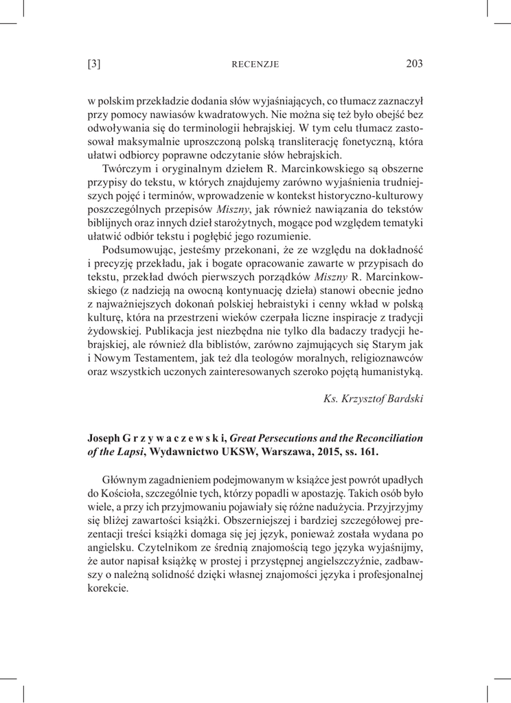 [3] RECENZJE 203 w polskim przekładzie dodania słów wyjaśniających, co tłumacz zaznaczył przy pomocy nawiasów kwadratowych. Nie można się też było obejść bez odwoływania się do terminologii hebrajskiej. W tym celu tłumacz zastosował maksymalnie uproszczoną polską transliterację fonetyczną, która ułatwi odbiorcy poprawne odczytanie słów hebrajskich. Twórczym i oryginalnym dziełem R. Marcinkowskiego są obszerne przypisy do tekstu, w których znajdujemy zarówno wyjaśnienia trudniejszych pojęć i terminów, wprowadzenie w kontekst historyczno-kulturowy poszczególnych przepisów Miszny, jak również nawiązania do tekstów biblijnych oraz innych dzieł starożytnych, mogące pod względem tematyki ułatwić odbiór tekstu i pogłębić jego rozumienie. Podsumowując, jesteśmy przekonani, że ze względu na dokładność i precyzję przekładu, jak i bogate opracowanie zawarte w przypisach do tekstu, przekład dwóch pierwszych porządków Miszny R. Marcinkowskiego (z nadzieją na owocną kontynuację dzieła) stanowi obecnie jedno z najważniejszych dokonań polskiej hebraistyki i cenny wkład w polską kulturę, która na przestrzeni wieków czerpała liczne inspiracje z tradycji żydowskiej. Publikacja jest niezbędna nie tylko dla badaczy tradycji hebrajskiej, ale również dla biblistów, zarówno zajmujących się Starym jak i Nowym Testamentem, jak też dla teologów moralnych, religioznawców oraz wszystkich uczonych zainteresowanych szeroko pojętą humanistyką. Ks. Krzysztof Bardski Joseph G r z y w a c z e w s k i, Great Persecutions and the Reconciliation of the Lapsi, Wydawnictwo UKSW, Warszawa, 2015, ss. 161. Głównym zagadnieniem podejmowanym w książce jest powrót upadłych do Kościoła, szczególnie tych, którzy popadli w apostazję. Takich osób było wiele, a przy ich przyjmowaniu pojawiały się różne nadużycia. Przyjrzyjmy się bliżej zawartości książki. Obszerniejszej i bardziej szczegółowej prezentacji treści książki domaga się jej język, ponieważ została wydana po angielsku. Czytelnikom ze średnią znajomością tego języka wyjaśnijmy, że autor napisał książkę w prostej i przystępnej angielszczyźnie, zadbawszy o należną solidność dzięki własnej znajomości języka i profesjonalnej korekcie. 204 Ks. Leon Nieścior [4] Żeby zrozumieć wspomniane zjawisko apostazji, należy je zbadać w szerokim kontekście masowych prześladowań w starożytności. Żeby mówić z kolei o prześladowaniach, należy postawić pytanie o ich genezę. Autor książki najpierw sygnalizuje przyczyny niechęci wobec chrześcijan w pierwszych wiekach (rozdział pierwszy). Wskazuje na jej dwa zasadnicze źródła. Pierwsze, to negatywne nastawienie Żydów. Mieli oni powód, by zwalczać chrześcijan, gdyż chrześcijanie głosili to, co było zupełnie nie do przyjęcia na gruncie religii Starego Przymierza. Jakim sposobem ten, kto jest synem cieśli z Nazaretu, może być uważany za Syna Jahwe?! Jak wolno nazywać Go Bogiem, skoro wiadomo, że „jest tylko jeden Bóg i nie ma innego”? W imię bóstwa Chrystusa chrześcijanie – w pojęciu Żydów – rozbijali społeczność żydowską, w kraju i w diasporze, i zakładali paralelne do synagog wspólnoty religijne. Żydzi nie mieli władzy politycznej, nawet w Izraelu, po zburzeniu świątyni, ale tworzyli negatywy obraz chrześcijan i niekiedy wprost inspirowali władze lokalne do działań przeciw wyznawcom nowej religii, w ich pojęciu – sekty. Widzimy to na przykład w męczeństwie św. Polikarpa. Znacznie ważniejsze i gorsze w skutkach pozostawało złe nastawienie pogan. Wprawdzie małe grupy chrześcijan w niczym nie były groźne, ale chrześcijanie drażnili pogan swym postępowaniem i głoszonymi naukami. Nie uznawali bóstw pogańskich, zachęcali innych do porzucania czci dla nich, czyli uderzali w to, co ludziom było bliskie i co należało do dawnych tradycji. Co więcej, chrześcijanie uważali bogów pogańskich za demony. Nabożeństwa chrześcijan odprawiane w ukrytych miejscach stanowiły podstawę do oskarżeń o „jakieś tajemne obrzędy i knowania”, a fragmenty nauk chrześcijańskich, na przykład o spożywaniu ciała i krwi, rozbudzały wyobraźnię. Stąd posądzenia o różne niegodziwości. Może władze publiczne nie ingerowałyby w tego rodzaju plotki, gdyby nie to, iż chrześcijanie nie chcieli brać udziału w uroczystościach ku czci cesarza, a to już było traktowane jako przestępstwo natury publicznej czy politycznej. Do plotek ludowych oraz do akcji władz trzeba dodać działalność polemistów anty-chrześcijańskich, jak Celsus, Hierokles czy Porfiriusz, którzy w sposób niby to naukowy starali ośmieszyć religię chrześcijan, a ich samych przedstawić jako ludzi niemądrych i szkodliwych dla społeczności. W atmosferze wrogości, nieufności i podejrzeń wybuchały prześladowania organizowane przez władze; spotykały się one z aprobatą społeczną. Autor sygnalizuje niektóre z nich: w Rzymie za Nerona, Lyonie, Afryce, Palestynie, Aleksandrii (rozdział drugi). Następnie próbuje spojrzeć na [5] RECENZJE 205 chrześcijaństwo od strony państwowej. Nie chodzi o usprawiedliwienie akcji przeciw chrześcijanom, lecz o wysiłek zrozumienia przeciwnej strony. Ponieważ zwalczano młody Kościół czynem i słowem, należało się bronić. Autor pokazuje główne linie obrony chrześcijan przez apologetów w obliczu prześladowań (rozdział trzeci). Tak pojawiają się apologeci, jak Atenagoras, Justyn, Tertulian. Próbują odeprzeć krążące zarzuty o ateizm, ukryte zbrodnie, wrogość wobec państwa i cesarza. Apologeci – czasem trochę sztucznie – ukazują podobieństwo w religii pogan i chrześcijan, związki nauki chrześcijańskiej z filozofią klasyczną. Wiadomo, że ich apologie miały niewielki wpływ na społeczeństwo, bo ataki wciąż trwały, a czytelnikami tych dzieł byli raczej sami chrześ