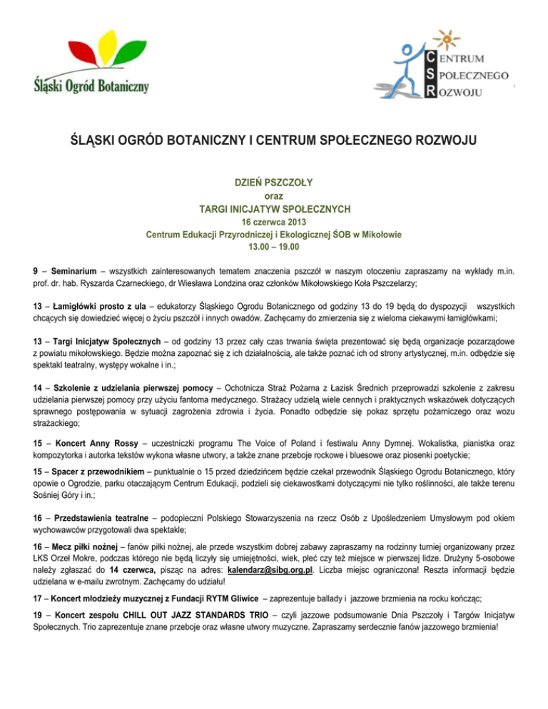 ŚLĄSKI OGRÓD BOTANICZNY I CENTRUM SPOŁECZNEGO ROZWOJU DZIEŃ PSZCZOŁY oraz TARGI INICJATYW SPOŁECZNYCH 16 czerwca 2013 Centrum Edukacji Przyrodniczej i Ekologicznej ŚOB w Mikołowie 13.00 – 19.00 9 – Seminarium – wszystkich zainteresowanych tematem znaczenia pszczół w naszym otoczeniu zapraszamy na wykłady m.in. prof. dr. hab. Ryszarda Czarneckiego, dr Wiesława Londzina oraz członków Mikołowskiego Koła Pszczelarzy; 13 – Łamigłówki prosto z ula – edukatorzy Śląskiego Ogrodu Botanicznego od godziny 13 do 19 będą do dyspozycji wszystkich chcących się dowiedzieć więcej o życiu pszczół i innych owadów. Zachęcamy do zmierzenia się z wieloma ciekawymi łamigłówkami; 13 – Targi Inicjatyw Społecznych – od godziny 13 przez cały czas trwania święta prezentować się będą organizacje pozarządowe z powiatu mikołowskiego. Będzie można zapoznać się z ich działalnością, ale także poznać ich od strony artystycznej, m.in. odbędzie się spektakl teatralny, występy wokalne i in.; 14 – Szkolenie z udzielania pierwszej pomocy – Ochotnicza Straż Pożarna z Łazisk Średnich przeprowadzi szkolenie z zakresu udzielania pierwszej pomocy przy użyciu fantoma medycznego. Strażacy udzielą wiele cennych i praktycznych wskazówek dotyczących sprawnego postępowania w sytuacji zagrożenia zdrowia i życia. Ponadto odbędzie się pokaz sprzętu pożarniczego oraz wozu strażackiego; 15 – Koncert Anny Rossy – uczestniczki programu The Voice of Poland i festiwalu Anny Dymnej. Wokalistka, pianistka oraz kompozytorka i autorka tekstów wykona własne utwory, a także znane przeboje rockowe i bluesowe oraz piosenki poetyckie; 15 – Spacer z przewodnikiem – punktualnie o 15 przed dziedzińcem będzie czekał przewodnik Śląskiego Ogrodu Botanicznego, który opowie o Ogrodzie, parku otaczającym Centrum Edukacji, podzieli się ciekawostkami dotyczącymi nie tylko roślinności, ale także terenu Sośniej Góry i in.; 16 – Przedstawienia teatralne – podopieczni Polskiego Stowarzyszenia na rzecz Osób z Upośledzeniem Umysłowym pod okiem wychowawców przygotowali dwa spektakle; 16 – Mecz piłki nożnej – fanów piłki nożnej, ale przede wszystkim dobrej zabawy zapraszamy na rodzinny turniej organizowany przez LKS Orzeł Mokre, podczas którego nie będą liczyły się umiejętności, wiek, płeć czy też miejsce w pierwszej lidze. Drużyny 5-osobowe należy zgłaszać do 14 czerwca, pisząc na adres: [email protected]. Liczba miejsc ograniczona! Reszta informacji będzie udzielana w e-mailu zwrotnym. Zachęcamy do udziału! 17 – Koncert młodzieży muzycznej z Fundacji RYTM Gliwice – zaprezentuje ballady i jazzowe brzmienia na rocku kończąc; 19 – Koncert zespołu CHILL OUT JAZZ STANDARDS TRIO – czyli jazzowe podsumowanie Dnia Pszczoły i Targów Inicjatyw Społecznych. Trio zaprezentuje znane przeboje oraz własne utwory muzyczne. Zapraszamy serdecznie fanów jazzowego brzmienia! Ponadto m.in.: Kiermasz ekologiczny – podczas całego święta producenci ekologicznych produktów spożywczych oraz rękodzielnictwa będą oferować swoje produkty; Kawiarenka – będzie można zjeść niedzielny obiad oraz spróbować potraw wegetariańskich, posilić się tradycyjnym śląskim kołoczem i napić wybornej kawy; RoboKids – pokaz robotyki dla dzieci. Najmłodsi będą mogli zobaczyć jak budować, projektować oraz programować roboty zbudowane ze specjalnych zestawów klocków LEGO® Mindstorm – świetna zabawa i edukacja w jednym; Pszczelarstwo od kuchni – pokaz miodobrania, sprzętu pszczelarskiego, a także możliwość obserwacji rodzin pszczelich w pokazowym ulu; Trening pamięci – warsztaty interaktywne pt. „Trenuj pamięć i spostrzegawczość, żyj w zgodzie z przyrodą!”. Wszyscy zainteresowani od 6 do 106 lat będą mogli zapoznać się ze sztuką szybkiego liczenia, sprawdzić swoją spostrzegawczość czy też uwolnić motyla z pułapki. To tylko niektóre atrakcje, które przygotowała Szkoła Treningu Pamięci Szatkowscy; Kącik zabaw edukacyjnych – najmłodsi pod opieką rodziców oraz animatorów będą mogli korzystać z kącika zabaw z ekologicznymi zabawkami, kolorowankami, rebusami, itp.; Malowanie twarzy – pszczółka, motyl, biedronka, to tylko niektóre z owadów, w które będzie można się przeistoczyć w czasie święta. Zabawa nie tylko dla dzieci! Owadzie sprawy – zapraszamy na edukacyjno-kreatywny warsztat tworzenia kolorowych owadów; Punkt Informacyjny o EFS – możliwość uzyskania informacji o pożyczkach na rozpoczęcie działalności gospodarczej, bezpłatnych szkoleniach, dobrych praktykach sfinansowanych ze środków Europejskiego Funduszu Społecznego, a także unijne konkursy z nagrodami dla dzieci i młodzieży; Gry i zabawy ruchowe – chusta Klanza, przeciąganie liny, skoki w workach, slalomy i wiele innych. CZEKAMY NA GOŚCI RÓWNIEŻ W RAZIE NIEPOGODY! Kontakt: Marzena Osmalak e-mail: [email protected] tel. 534 994 578