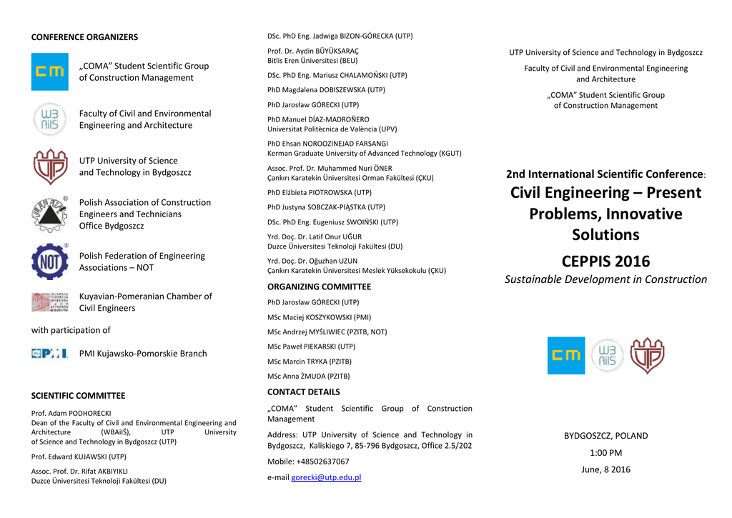 CONFERENCE ORGANIZERS „COMA” Student Scientific Group of Construction Management DSc. PhD Eng. Jadwiga BIZON-GÓRECKA (UTP) Prof. Dr. Aydin BÜYÜKSARAÇ Bitlis Eren Üniversitesi (BEU) DSc. PhD Eng. Mariusz CHALAMOŃSKI (UTP) PhD Magdalena DOBISZEWSKA (UTP) PhD Jarosław GÓRECKI (UTP) Faculty of Civil and Environmental Engineering and Architecture UTP University of Science and Technology in Bydgoszcz Assoc. Prof. Dr. Muhammed Nuri ÖNER Çankırı Karatekin Üniversitesi Orman Fakültesi (ÇKU) PhD Justyna SOBCZAK-PIĄSTKA (UTP) DSc. PhD Eng. Eugeniusz SWOIŃSKI (UTP) Yrd. Doç. Dr. Oğuzhan UZUN Çankırı Karatekin Üniversitesi Meslek Yüksekokulu (ÇKU) ORGANIZING COMMITTEE Kuyavian-Pomeranian Chamber of Civil Engineers „COMA” Student Scientific Group of Construction Management PhD Ehsan NOROOZINEJAD FARSANGI Kerman Graduate University of Advanced Technology (KGUT) Yrd. Doç. Dr. Latif Onur UĞUR Duzce Üniversitesi Teknoloji Fakültesi (DU) Polish Federation of Engineering Associations – NOT Faculty of Civil and Environmental Engineering and Architecture PhD Manuel DÍAZ-MADROÑERO Universitat Politècnica de València (UPV) PhD Elżbieta PIOTROWSKA (UTP) Polish Association of Construction Engineers and Technicians Office Bydgoszcz UTP University of Science and Technology in Bydgoszcz 2nd International Scientific Conference: Civil Engineering – Present Problems, Innovative Solutions CEPPIS 2016 Sustainable Development in Construction PhD Jarosław GÓRECKI (UTP) MSc Maciej KOSZYKOWSKI (PMI) with participation of PMI Kujawsko-Pomorskie Branch MSc Andrzej MYŚLIWIEC (PZITB, NOT) MSc Paweł PIEKARSKI (UTP) MSc Marcin TRYKA (PZITB) MSc Anna ŻMUDA (PZITB) SCIENTIFIC COMMITTEE Prof. Adam PODHORECKI Dean of the Faculty of Civil and Environmental Engineering and Architecture (WBAiIŚ), UTP University of Science and Technology in Bydgoszcz (UTP) Prof. Edward KUJAWSKI (UTP) Assoc. Prof. Dr. Rifat AKBIYIKLI Duzce Üniversitesi Teknoloji Fakültesi (DU) CONTACT DETAILS „COMA” Student Scientific Group of Construction Management Address: UTP University of Science and Technology in Bydgoszcz, Kaliskiego 7, 85-796 Bydgoszcz, Office 2.5/202 Mobile: +48502637067 e-mail [email protected] BYDGOSZCZ, POLAND 1:00 PM June, 8 2016 Civil engineering Computer application in civil engineering Computer aided project management Construction management Ecology Mathematical programming Logistics Production engineering Project management Risk management Sustainable development Transport planning Others IMPORTANT DATES / DEADLINES Conference announcement No. 1 – November, 15 2015 Registration and abstract submission deadline (https://goo.gl/9UZv0Z) – January, 31 2016 Sending full text of the article ([email protected]) – February, 29 2016 – May, 20 2016 Conference – June, 8 2016 CALL FOR PAPERS Please submit a short abstract of the paper in the registration form before January, 1 2016 (ext. 31.01.2016). Please submit full text of the article (*.doc *.docx files only) to [email protected] before February, 1 2016 (ext. 29.02.2016). Abstract and presentation (*.pdf or *.ppt) will be available on the website www.ceppis.pl Full text of the article will be published in a reviewed monograph. More information: www.ceppis.pl Registration required: https://goo.gl/9UZv0Z VENUE UTP University of Science and Technology in Bydgoszcz Regionalne Centrum Innowacyjności (RCI) Auditorium C-8 https://goo.gl/maps/z1uqa DATE June, 8 2016, 1:00 PM MORE INFORMATION: www.ceppis.pl Sustainable Development in Construction CONFERENCE TOPICS Conference announcement No. 2 CEPPIS 2016 International scientific conference CEPPIS 2016 is set out to pay attention to recent trends especially sustainable development in construction industry. We encourage you to take part in a discussion in the course of the conference debates or present your theoretical or practical considerations, experiences and results of conducted investigations. Official language: english – May, 15 2016 2nd International Scientific Conference: 2nd International Scientific Conference: Civil Engineering – Present Problems, Innovative Solutions CEPPIS Civil Engineering – Present Problems, Innovative Solutions Sending a presentation ([email protected]) GENERAL INFORMATION