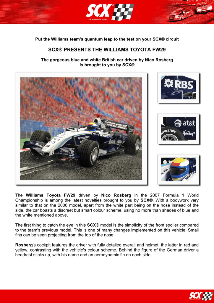 Put the Williams team's quantum leap to the test on your SCX® circuit SCX® PRESENTS THE WILLIAMS TOYOTA FW29 The gorgeous blue and white British car driven by Nico Rosberg is brought to you by SCX® The Williams Toyota FW29 driven by Nico Rosberg in the 2007 Formula 1 World Championship is among the latest novelties brought to you by SCX®. With a bodywork very similar to that on the 2006 model, apart from the white part being on the nose instead of the side, the car boasts a discreet but smart colour scheme, using no more than shades of blue and the white mentioned above. The first thing to catch the eye in this SCX® model is the simplicity of the front spoiler compared to the team's previous model. This is one of many changes implemented on this vehicle. Small fins can be seen projecting from the top of the nose. Rosberg's cockpit features the driver with fully detailed overall and helmet, the latter in red and yellow, contrasting with the vehicle's colour scheme. Behind the figure of the German driver a headrest sticks up, with his name and an aerodynamic fin on each side. As usual on Formula 1 cars, the nose area is where the main sponsors' logos appear. In this case the names of Philips, Airasia and Randstad accompany the driver's number 16. The only feature other than the advertising is the telecommunications aerial. The Williams Toyota FW29 from SCX® also includes the logos on the wheels and tyres. In fact, both sides are decorated with a wealth of logos, each of them in proportion to the importance of the sponsor in question. Nevertheless, the most striking feature on the side of the car is without a doubt the air intake, with a small fin projecting from it. More small fins are fitted further back, where the dominant feature is the large rear spoiler. The sides of the spoiler are decorated with the AT&T and Hamleys logos. The Lenovo logo appears on the top of the spoiler. Like the other SCX® Formula 1 cars, this model includes the centre brake light (though it does not work) and two exhaust pipes. Track Trials The similarity in mechanical and above all size terms between the Formula 1 models in the current SCX® range, with almost identical chassis, makes for terrific competitiveness on the track. The same technology is used here, and the budgets of the different teams hardly differ, which means that at the outset there are no advantages beyond what happens on the track. While it is a car with a very narrow rear wheel track, its impressive guide distance compensates for its tendency to slide, making it a fast car on the bends. Driving therefore needs to be smooth, without sharp trigger movements. Let the car get ahead as if the trigger were a traction control, and watch it take one bend after another at a good intermediate pace. The car's light weight stops the dreaded inertias appearing. Its other performance features are on a par with its colleagues in the F-1 paddock. All of them are long, low cars which move in a way that further enhances the spectacular look of some fine scale models. * Tests carried out without extra magnet and following a small tune-up. Sport Table of Measurements Wheelbase 97mm Distance 104mm Rear wheel track Rear wheel diameter Front wheel track Front wheel diameter Car weight Bodyshell weight 62mm 20mm 55mm 20mm 66g 10g Transmission type Transmission ratio Guide type Screws 4x2 direct rear 9/27 = 3 Pivoting ARS w/steering 4 (1+1+2) Motor Drive Front Rear RX-F1 Rear Ø 18.4 x 10.9mm Ø 19.5 x 11.7mm Product reference no.: 62880 The Real Williams F1 2007 The Williams team's latest car has a Toyota engine. The Williams Toyota FW29 was launched at the team's base in Oxford in late 2006. The car is in line with the philosophy of its predecessor, with a design which leaves no place for wasted energy. Another notable feature of the new version is the improved cooling without using larger air intakes, improved mechanics and a structural redesign of the chassis to minimise the problems it suffered in the previous season. Aerodynamic features were also overhauled to achieve a lower, more compact surface. A final difference worth highlighting is the rear spoiler, altered to meet the new FIA regulations. The team, also known as Williams Grand Prix Engineering, was set up by Frank Williams in 1977, following two previous attempts to run teams. This one scored some major successes in the 80's and 90's, and continues to be one of the big Formula 1 teams, alongside Ferrari and McLaren. In 2007, Williams decided to sign a contract with Toyota for the supply of engines, so breaking its contract with Cosworth. The team's main drivers for the 2007 season were Nico Rosberg and Alexander Wurz, the latter replacing Mark Webber who signed a contract with Red Bull Racing. The test drivers were Narain Karthikeyan and Kazuki Nakajima. The 2007 season kicked off with a respectable seventh place for Nico Rosberg in Australia. In Malaysia, Nico Rosberg had to withdraw when he was in seventh place – sixth before refuelling – while Alex Wurz finished the race outside the points. In the Bahrain Grand Prix, neither driver managed to score any points. In Monaco, Wurz scored his first points for the team, coming in seventh. In the Canadian Grand Prix, Alex Wurz got the first podium position of the season with a third place, after starting off nineteenth. Subsequently, at the European Grand Prix held at the Nürburgring, Alex Wurz earned fourth place in a race which was completely transformed by rain. After this Wurz failed to score any more points in races. In China neither driver gained any, and Alex Wurz announced his immediate withdrawal from the competition after the Grand Prix, so he had to be replaced by Nakajima in Brazil. However, Rosberg managed to finish the world championship in ninth place, a considerable improvement on the 17th place in which he had finished the year before.