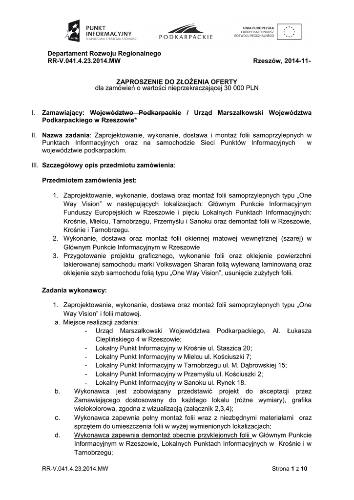 Departament Rozwoju Regionalnego RR-V.041.4.23.2014.MW Rzeszów, 2014-11- ZAPROSZENIE DO ZŁOŻENIA OFERTY dla zamówień o wartości nieprzekraczającej 30 000 PLN I. Zamawiający: Województwo Podkarpackie / Urząd Marszałkowski Województwa Podkarpackiego w Rzeszowie* II. Nazwa zadania: Zaprojektowanie, wykonanie, dostawa i montaż folii samoprzylepnych w Punktach Informacyjnych oraz na samochodzie Sieci Punktów Informacyjnych w województwie podkarpackim. III. Szczegółowy opis przedmiotu zamówienia: Przedmiotem zamówienia jest: 1. Zaprojektowanie, wykonanie, dostawa oraz montaż folii samoprzylepnych typu „One Way Vision” w następujących lokalizacjach: Głównym Punkcie Informacyjnym Funduszy Europejskich w Rzeszowie i pięciu Lokalnych Punktach Informacyjnych: Krośnie, Mielcu, Tarnobrzegu, Przemyślu i Sanoku oraz demontaż folii w Rzeszowie, Krośnie i Tarnobrzegu. 2. Wykonanie, dostawa oraz montaż folii okiennej matowej wewnętrznej (szarej) w Głównym Punkcie Informacyjnym w Rzeszowie 3. Przygotowanie projektu graficznego, wykonanie folii oraz oklejenie powierzchni lakierowanej samochodu marki Volkswagen Sharan folią wylewaną laminowaną oraz oklejenie szyb samochodu folią typu „One Way Vision”, usunięcie zużytych folii. Zadania wykonawcy: 1. Zaprojektowanie, wykonanie, dostawa oraz montaż folii samoprzylepnych typu „One Way Vision” i folii matowej. a. Miejsce realizacji zadania: - Urząd Marszałkowski Województwa Podkarpackiego, Al. Łukasza Cieplińskiego 4 w Rzeszowie; - Lokalny Punkt Informacyjny w Krośnie ul. Staszica 20; - Lokalny Punkt Informacyjny w Mielcu ul. Kościuszki 7; - Lokalny Punkt Informacyjny w Tarnobrzegu ul. M. Dąbrowskiej 15; - Lokalny Punkt Informacyjny w Przemyślu ul. Kościuszki 2; - Lokalny Punkt Informacyjny w Sanoku ul. Rynek 18. b. Wykonawca jest zobowiązany przedstawić projekt do akceptacji przez Zamawiającego dostosowany do każdego lokalu (różne wymiary), grafika wielokolorowa, zgodna z wizualizacją (załącznik 2,3,4); c. Wykonawca zapewnia pełny montaż folii wraz z niezbędnymi materiałami oraz sprzętem do umieszczenia folii w wyżej wymienionych lokalizacjach; d. Wykonawca zapewnia demontaż obecnie przyklejonych folii w Głównym Punkcie Informacyjnym w Rzeszowie, Lokalnych Punktach Informacyjnych w Krośnie i w Tarnobrzegu; RR-V.041.4.23.2014.MW Strona 1 z 10 e. f. g. h. Wykonawca przed przedstawieniem wizualizacji i wykonaniem projektu dokona dokładnych pomiarów powierzchni do wyklejenia oraz doboru odcieni kolorów grafiki korespondujących do wyglądu zewnętrznego budynku i framug; W cenę oferty Wykonawca zobowiązany jest wliczyć wszystkie koszty związane z realizacją niniejszego zamówienia; Wykonawca zapewnia montaż i demontaż w godzinach pracy Punktów w Rzeszowie, Krośnie, Mielcu, Tarnobrzegu, Przemyślu, Sanoku (pon.- pt., 7.30 15.30); Termin realizacji zamówienia: 19 grudnia 2014 r. Orientacyjne wymiary szyb: Główny Punkt Informacyjny w Rzeszowie 1065 970 1400 890 1400 890 296 890 296 296 245 245 245245 245245 Oklejenie szyb folią One Way Vision: 3 szyby:1065/1400 mm 9 szyb: 296/ 1400 mm 1 szyba: 970/890 mm 2 szyby: 296/890 mm 1 szyba: 245/890 mm 2 szyby: 1065/1773 mm 4 szyby:297/1773 mm 2 szyby: 272/1773 mm Oklejenie szyb folią okienna matową: 1 szyba:1065/1400 mm 3 szyby: 296/1400 mm 2 szyby: 1065/1773 mm 4 szyby: 297/1773 mm 2 szyby: 272/1773 mm RR-V.041.4.23.2014.MW Strona 2 z 10 Lokalny Punkt Informacyjny w Krośnie (okna plus drzwi) 495 385 108 38 970 1670 1670 3 szyb: 495/1080 mm 3 szyb: 1670/1080 mm 12345678- 2 szyby: 385/970 mm 2 szyby: 1670/970 mm 1100 mm 1 szyba: 500/1100 mm 700 mm 1 szyba: 1530/700 mm 90 mm 1 szyba: 1530/90 mm 500 mm 2 szyby: 1670/340 mm 500 mm 2 szyby: 500/340 mm 1530 mm 1 szyba: 500/1100 mm 1670 mm 340 mm RR-V.041.4.23.2014.MW Strona 3 z 10 Lokalny Punkt Informacyjny w Mielcu 560 1600 600 1600 1 1 szyba: 600/1600 mm 2 szyby: 1600/650 mm Lokalny Punkt Informacyjny w Tarnobrzegu 610 1170 3 szyby: 1170/610 mm Lokalny Punkt Informacyjny w Przemyślu Ddvvv 390 380 390 810 500 920 2 szyby: 380/390 mm 1 szyba: 920/810 mm 1 szyba: 810/390 mm RR-V.041.4.23.2014.MW Strona 4 z 10 Lokalny Punkt Informacyjny w Sanoku 795 990 1 szyba: 795/990 mm a. Usunięcie folii laminowanej z powierzchni lakierowanej (maska, boki i tylna klapa) oraz folii typu „One Way Vision” z szyb w samochodzie marki Volkswagen Sharan. b. Przygotowanie projektu graficznego i wykonanie folii. a. Maska (klapa silnika) - duże logo Punktu Informacyjnego; 0boki i tylna klapa - grafika wielokolorowa zaprojektowana przez wykonawcę, zgodnie z wzorem powierzchni podlegającej oklejeniu oraz zgodnie z zaleceniami Zamawiającego; b. W projekcie graficznym powinny znaleźć się m. in.: adres strony www.fundusze.podkarpackie.pl, logotypy i dane kontaktowe Głównego Punktu; (załącznik 2,3,4); c. Folia powinna być dodatkowo laminowana, wysokiej jakości, odporna na czynniki zewnętrzne tj. światło, temperaturę, chemikalia, promieniowanie UV, uszkodzenia mechaniczne, brud; d. Folia po użytkowaniu co najmniej (12 miesięcy) nie może być inwazyjna i po ściągnięciu z powierzchni samochodu nie powinna zniszczyć, uszkodzić czy odbarwić powierzchni samochodu; e. Okres gwarancji folii wynosi co najmniej 12 miesięcy; f. Wykonawca jest zobowiązany przedstawić projekt do akceptacji przez zamawiającego. c. Oklejenie powierzchni lakierowanej samochodu folią wylewaną laminowaną oraz oklejenie szyb samochodu folią typu „One Way Vision” zgodnie z wzorem powierzchni podlegającej oklejeniu oraz zgodnie z zaleceniami Zamawiającego. a. Wykonawca zapewnia dojazd do siedziby Zamawiającego i pomiar; powierzchni podlegającej oklejeniu w cenie zamówienia; b. Wykonawca zapewnia dowóz materiałów na miejsce montażu w cenie zamówienia; c. Wykonawca zapewnia pełny montaż folii wraz z niezbędnymi materiałami potrzebnymi do montażu, oraz sprzętem niezbędnym do umieszczenia folii; 