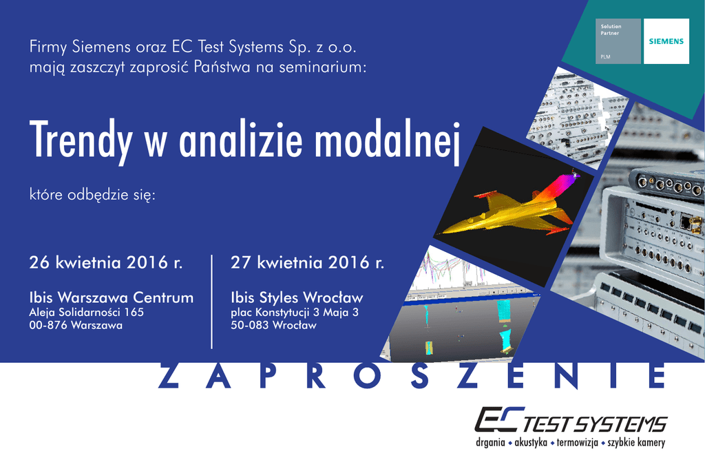 Firmy Siemens oraz EC Test Systems Sp. z o.o. mają zaszczyt zaprosić Państwa na seminarium: Trendy w analizie modalnej które odbędzie się: 26 kwietnia 2016 r. 27 kwietnia 2016 r. Ibis Warszawa Centrum Ibis Styles Wrocław Aleja Solidarności 165 00-876 Warszawa plac Konstytucji 3 Maja 3 50-083 Wrocław Z A P R O S Z E N I E Plan seminarium: Na seminarium zostaną omówione aktualne trendy oraz nowe rozwiązania w zakresie analizy modalnej. Uczestnicy będą mieli możliwość zapoznania się z bieżącymi zagadnieniami z dziedziny analizy modalnej (od pomiarów, aż do analizy danych). Przedstawione zostaną techniki wzbudzenia obiektu, analizy danych oraz aplikacje w których znajduje zastosowanie analiza modalna. Poranna sesja: •Rejestracja i powitanie uczestników •Analiza modalna – przegląd zagadnień •Techniki wzbudzania obiektów •Praktyczna analiza modalna: podstawy dobrego testu wstępnego •Lunch Popołudniowa sesja: • Praktyczna analiza modalna: podstawy analizy danych • Praktyczna analiza modalna: zaawansowana analiza danych • Przerwa • Analiza modalna w cyklu rozwoju produktu • Dyskusja oraz zamknięcie seminarium Rozpoczęcie - godzina 9:30 W czasie spotkania przerwa kawowa wraz z poczęstunkiem. Planowane zakończenie - godzina 15:30 Seminarium jest bezpłatne. Seminarium będzie prowadzone w języku angielskim z podsumowaniem w języku polskim. Ilość miejsc ograniczona. Decyduje kolejność zgłoszeń. Zapisy na szkolenie przyjmujemy za pomocą formularza zgłoszeniowego umieszczonego na stronie, po kliknięciu ZAREJESTRUJ SIĘ Warszawa (26.04.2016 r.) ZAREJESTRUJ SIĘ Wrocław (27.04.2016 r.) Będziemy czekać na Państwa zgłoszenia do 20.04.2016 r. Osoba kontaktowa: Agnieszka Czubińska EC Test Systems Sp. z o.o. ul. Lublańska 34, 31-476 Kraków tel.: +48 12 627 77 91 [email protected]