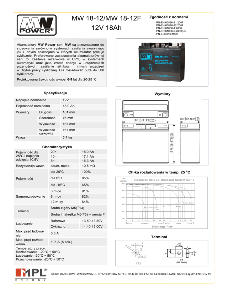 MW 18-12/MW 18-12F 12V 18Ah Zgodność z normami PN-EN 60896-21:2007 PN-EN 60896-22:2007 PN-EN 61056-1:2008 PN-EN 61056-2:2003(U) PN-E-83016:1999 Akumulatory MW Power serii MW są przeznaczone do stosowania zarówno w systemach zasilania awaryjnego jak i innych aplikacjach w których akumulator pracuje cyklicznie. Preferowane zastosowania akumulatorów tej serii to: zasilanie rezerwowe w UPS, w systemach automatyki oraz jako źródło energii w urządzeniach przenośnych, zasilanie silników i innych urządzeń w trybie pracy cyklicznej. Dla rozładowań 50% do 500 cykli pracy. Projektowana żywotność wynosi 6-9 lat dla 20-25 oC Specyfikacja Napięcie nominalne 12V Pojemność nominalna 18,0 Ah Wymiary Długość 181 mm Szerokość 76 mm Wysokość 167 mm Wysokość całkowita 167 mm Waga Wymiary 5,7 kg Charakterystyka Pojemność dla 25oC i napięcia odcięcia 10,5V 20h 18,0 Ah 10h 5h 17,1 Ah 15,3 Ah Rezystancja wewn. akum. naład. o Pojemność Samorozładowanie Terminal Ładowanie 10,5 mΩ dla 20 C 100% dla 0oC 85% dla -15oC 65% 3 m-ce 91% 6 m-cy 82% 12 m-cy 64% Ch-ka rozładowania w temp. 25 oC Śruba z góry M5(T13) Śruba i nakrętka M5(F3) – wersja F Buforowe 13,50-13,80V Cykliczne 14,40-15,00V Max. prąd ładowa5,5 A nia Max. prąd rozłado195 A (5 sek.) wania Temperatury pracy: Rozładowanie: -20°C ÷ 50°C Ładowanie: -20°C ÷ 50°C Przechowywanie: -20°C ÷ 50°C Terminal BIURO HANDLOWE: WARSZAWA UL. STANIEWICKA 14 TEL. 32 44 00 960 FAX 32 44 00 873 E-MAIL: [email protected]