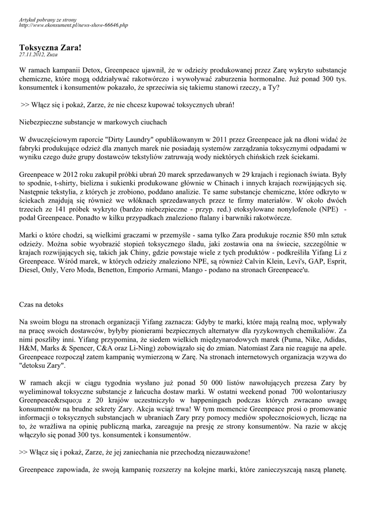 Artykuł pobrany ze strony http://www.ekonsument.pl/news-show-66646.php Toksyczna Zara! 27.11.2012, Zuza W ramach kampanii Detox, Greenpeace ujawnił, że w odzieży produkowanej przez Zarę wykryto substancje chemiczne, które mogą oddziaływać rakotwórczo i wywoływać zaburzenia hormonalne. Już ponad 300 tys. konsumentek i konsumentów pokazało, że sprzeciwia się takiemu stanowi rzeczy, a Ty? >> Włącz się i pokaż, Zarze, że nie chcesz kupować toksycznych ubrań! Niebezpieczne substancje w markowych ciuchach W dwuczęściowym raporcie "Dirty Laundry" opublikowanym w 2011 przez Greenpeace jak na dłoni widać że fabryki produkujące odzież dla znanych marek nie posiadają systemów zarządzania toksycznymi odpadami w wyniku czego duże grupy dostawców tekstyliów zatruwają wody niektórych chińskich rzek ściekami. Greenpeace w 2012 roku zakupił próbki ubrań 20 marek sprzedawanych w 29 krajach i regionach świata. Były to spodnie, t-shirty, bielizna i sukienki produkowane głównie w Chinach i innych krajach rozwijających się. Następnie tekstylia, z których je zrobiono, poddano analizie. Te same substancje chemiczne, które odkryto w ściekach znajdują się również we włóknach sprzedawanych przez te firmy materiałów. W około dwóch trzecich ze 141 próbek wykryto (bardzo niebezpieczne - przyp. red.) etoksylowane nonylofenole (NPE) podał Greenpeace. Ponadto w kilku przypadkach znaleziono ftalany i barwniki rakotwórcze. Marki o które chodzi, są wielkimi graczami w przemyśle - sama tylko Zara produkuje rocznie 850 mln sztuk odzieży. Można sobie wyobrazić stopień toksycznego śladu, jaki zostawia ona na świecie, szczególnie w krajach rozwijających się, takich jak Chiny, gdzie powstaje wiele z tych produktów - podkreśliła Yifang Li z Greenpeace. Wśród marek, w których odzieży znaleziono NPE, są również Calvin Klein, Levi's, GAP, Esprit, Diesel, Only, Vero Moda, Benetton, Emporio Armani, Mango - podano na stronach Greenpeace'u. Czas na detoks Na swoim blogu na stronach organizacji Yifang zaznacza: Gdyby te marki, które mają realną moc, wpływały na pracę swoich dostawców, byłyby pionierami bezpiecznych alternatyw dla ryzykownych chemikaliów. Za nimi poszliby inni. Yifang przypomina, że siedem wielkich międzynarodowych marek (Puma, Nike, Adidas, H&M, Marks & Spencer, C&A oraz Li-Ning) zobowiązało się do zmian. Natomiast Zara nie reaguje na apele. Greenpeace rozpoczął zatem kampanię wymierzoną w Zarę. Na stronach internetowych organizacja wzywa do "detoksu Zary". W ramach akcji w ciągu tygodnia wysłano już ponad 50 000 listów nawołujących prezesa Zary by wyeliminował toksyczne substancje z łańcucha dostaw marki. W ostatni weekend ponad 700 wolontariuszy Greenpeace’u z 20 krajów uczestniczyło w happeningach podczas których zwracano uwagę konsumentów na brudne sekrety Zary. Akcja wciąż trwa! W tym momencie Greenpeace prosi o promowanie informacji o toksycznych substancjach w ubraniach Zary przy pomocy mediów społecznościowych, licząc na to, że wrażliwa na opinię publiczną marka, zareaguje na presję ze strony konsumentów. Na razie w akcję włączyło się ponad 300 tys. konsumentek i konsumentów. >> Włącz się i pokaż, Zarze, że jej zaniechania nie przechodzą niezauważone! Greenpeace zapowiada, że swoją kampanię rozszerzy na kolejne marki, które zanieczyszcają naszą planetę. Organizacja obiecuje, że nie ustąpi do momentu aż wszystkie zidentyfikowane przez nią firmy nie zobowiążą się do wyeliminowania toksycznych substancji z łańcucha dostaw do 2020 roku. Na podstawie: Greenpeace International (http://www.greenpeace.org/international/en/news/Blogs/makingwaves/fashion-without-pollution-so-hot-rig ht-now/blog/43128/)