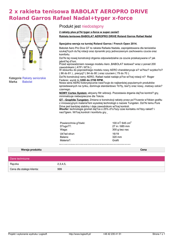 2 x rakieta tenisowa BABOLAT AEROPRO DRIVE Roland Garros Rafael Nadal+tyger x-force Produkt jest niedostępny 2 rakiety plus pi?ki tyger x-force w super cenie!! Rakieta tenisowa BABOLAT AEROPRO DRIVE Roland Garros Rafael Nadal Specjalna wersja na turniej Roland Garros / French Open 2014. Kategorie Rakiety seniorskie Marka Babolat Babolat Aero Pro Dive GT to rakieta Rafaela Nadala, zaprojektowana dla tenisistów szukaj?cych du?ej rotacji oraz dynamiki przy jednoczesnym zachowaniu czucia oraz komfortu. Dzi?ki tej nowej konstrukcji drgania odpowiedzialne za czucie przekazywane s? jak jabnli?ej d?oni. Przed wprowadzniem nowego modelu Aero ,BABOLAT testowa? wraz z ponad 200 zawodnikami ( ATP i WTA ). W stosunku do poprzedniego modelu nowy AERO charakteryzuje si? wi?ksz? szybko?ci? ( 86 do 81 ) , precyzj? ( 84 do 80 ) oraz czuciem ( 79 do 70 ). Dzi?ki konstrukcji ramy AERO, Rafael nadal nadaje pi?ce wi?cej rotacji ni? Roger Federer, wynik to 3200 do 2700 RPM. Nowa seria AERO kolorystycznie nawi?zuje do najbardziej popularnych produktów sprzedawanych na rynku, dominuje standardowo ?ó?ty, bia?y oraz nowy, matowy odcie? czarnego. NOWY Cortex System: aktywny filtr wibracji. Pozostawia drgania daj?ce kontrol? gry, minimalizuje niebezpieczne dla ?okcia. GT - Graphite Tungsten: Zmiana w konstrukcji rakiety przez po??czenie w?ókien grafitu z innowacyjnym materia?em wysokiej technologii o nazwie Tungsten. Dzi?ki temu Pure Drive jest bardziej stabilny i daje zawodnikom wi?cej kontroli. Woofer: technologia gromet daj?ca o 25% d?u?szy czas kontaktu mi?dzy rakiet? i naci?giem. Wi?cej kontroli i komfortu gry. Powierzchnia g?ówki: D?ugo??: Waga: 100 in2/ 645 cm2 27 in / 685 mm 300 g bez nac Uk?ad strun: Balans: Materia?: 16/19 320 mm Grafit Rakieta mo?e nie posiada? naci?gu fabrycznego, w zale?no?ci od dostawy. Aby uzyska? informacj? na temat naci?gu, prosz? zada? pytanie przy sk?adaniu zamówienia mailowo lub telefonicznie.Rozmiar raczek do wyboru:) Wersja produktu Cena Dane techniczne Rączka 2,3,4,5, Cena dla stałego klienta: 999 Projekt i wykonanie wydruku: Logisoft Powered by TCPDF (www.tcpdf.org) http://www.logisoft.pl/ +48 42 235 41 51 Strona 1 z 1