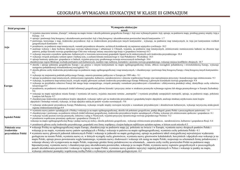 GEOGRAFIA-WYMAGANIA EDUKACYJNE W KLASIE III GIMNAZJUM Dział programu Azja Europa Sąsiedzi Polski Wymagania edukacyjne uczeń: wyjaśnia znaczenie terminu „Eurazja”, wskazuje na mapie świata i określa położenie geograficzne Europy i Azji oraz wybranych państw Azji, opisuje, na podstawie mapy, przebieg granicy między Azją a Europą - 1.6 opisuje i porównuje linię brzegową i ukształtowanie powierzchni Azji z linią brzegową i ukształtowaniem powierzchni innych kontynentów- 1.7 porównuje, korzystając z map, środowisko przyrodnicze Azji ze środowiskiem przyrodniczym innych kontynentów , wykazuje, na podstawie map tematycznych, że Azja jest kontynentem wielkich geograficznych kontrastów- 10.1 przedstawia, na podstawie map tematycznych, warunki przyrodnicze obszarów, na których kształtowały się najstarsze azjatyckie cywilizacje- 10.2 analizuje wykresy i dane liczbowe dotyczące rozwoju ludnościowego i urbanizacji w Chinach, wyjaśnia, na podstawie map tematycznych, zróżnicowanie rozmieszczenia ludności na obszarze tego państwa, podaje kierunki rozwoju gospodarczego Chin oraz wskazuje zmiany znaczenia tego kraju w gospodarce światowej-10.3 wykazuje znaczenie czynników społeczno- kulturowych w tworzeniu nowoczesnej gospodarki Japonii na tle niekorzystnych cech środowiska przyrodniczego- 10.4 wykazuje związek pomiędzy rytmem upraw i kulturą ryżu, a cechami klimatu monsunowego w Azji Południowo- Wschodniej- 10.5 opisuje kontrasty społeczno- gospodarcze w Indiach, wyjaśnia przyczyny gwałtownego rozwoju nowoczesnych technologii- 10.6 charakteryzuje region Bliskiego wschodu pod kątem cech kulturowych, zasobów ropy naftowej, kierunków i poziomu rozwoju gospodarczego, wskazuje miejsca konfliktów zbrojnych- 10.7 określa i opisuje położenie geograficzne Europy i jej granice z innymi kontynentami na mapie ogólnogeograficznej świata, oblicza rozciągłość południkową i równoleżnikową Europy, wykazuje następstwa południkoweji równoleżnikowej rozciągłości- 9.2 określa główne cechy środowiska przyrodniczego na podstawie mapy ogólnogeograficznej i map tematycznych, • charakteryzuje i porównuje linię brzegową Europy z linią brzegową innych kontynentów9.2 wykazuje się znajomością podziału politycznego Europy, omawia przemiany polityczne w Europie po 1989 roku - 9.1 opisuje na podstawie map tematycznych, zróżnicowanie regionalne, kulturowe, narodowościowe i etniczne współczesnej Europy oraz najważniejsze przyczyny i konsekwencje tego zróżnicowania- 9.3 wykazuje, na podstawie map tematycznych, związki między głównymi cechami środowiska przyrodniczego Europy Północnej a głównymi kierunkami rozwoju gospodarczego- 9.4 wykazuje na przykładzie rolnictwa Francji lub innego kraju europejskiego, związek pomiędzy warunkami przyrodniczymi a kierunkiem i efektywnością produkcji rolnej, identyfikuje cechy rolnictwa towarowego-9.5 przedstawia, na podstawie wskazanych źródeł informacji geograficznej główne kierunki i przyczyny zmian w strukturze przemysłu wybranego regionu lub okręgu przemysłowego w Europie Zachodniej9.6 wskazuje na mapie największe miasta Europy i wymienia ich nazwy, wyjaśnia znaczenie terminu „metropolia” i wymienia przykłady europejskich metropolii, opisuje, na podstawie mapy, położenie Londynu lub Paryża- 9.7 charakteryzuje środowisko przyrodnicze krajów alpejskich, wykazuje wpływ gór na środowisko przyrodnicze i gospodarkę krajów alpejskich, analizuje strukturę użytkowania ziemi krajów alpejskich i formułuje wnioski, wykazuje, że kraje alpejskie należą do państw wysoko rozwiniętych - 9.8 wykazuje atrakcyjność przyrodniczą Europy Południowej, wykazuje związki między rozwojem turystyki a warunkami przyrodniczymi i dziedzictwem kulturowym, wykazuje turystyczną atrakcyjność regionu śródziemnomorskiego-9.9 wymienia nazwy państw sąsiadujących z Polską i wskazuje je na mapie ogólnogeograficznej, określa ich położenie geograficzne, podaje długość granic Polski z poszczególnymi państwami,- 1.6 charakteryzuje i porównuje, na podstawie różnych źródeł informacj geograficznej, środowisko przyrodnicze krajów sąsiadujących z Polską, wykazuje ich zróżnicowanie społeczne i gospodarcze- 8.1 wykazuje wysoki poziom rozwoju przemysłu, rolnictwa i usług w Niemczech, wyjaśnia przyczyny dynamicznego rozwoju gospodarczego Niemiec- 8.2 przedstawia współczesne przemiany społeczne i gospodarcze Ukrainy-8.3 wskazuje na mapie ogólnogeograficznej Rosję i podaje nazwę jej stolicy, określa położenie geograficzne , wykazuje zróżnicowanie przyrodnicze, narodowościowe, kulturowe i gospodarcze Rosji- 8.4 przedstawia główne cechy środowiska przyrodniczego, gospodarki oraz formy współpracy z krajem będącym najbliższym sąsiadem regionu, w którym uczeń mieszka-8.5 Położenie oraz środowisko przyrodnicze Polski wskazuje Polskę na ogólnogeograficznej mapie Europy, charakteryzuje na podstawie mapy jej położenie na świecie i w Europie, wymienia nazwy skrajnych punktów Polski i wskazuje je na mapie, wymienia nazwy państw sąsiadujących z Polską i wskazuje te państwa na mapie ogólnogeograficznej, wymienia cechy położenia Polski- 4.1 wymienia nazwy głównych jednostek tektonicznych Polski i wskazuje te jednostki na mapie geologicznej, opisuje na podstawie tabeli stratygraficznej najważniejsze wydarzenia geologiczne na terenie Polski, wymienia nazwy er, w których wystąpiły ruchy górotwórcze, wymienia nazwy górotworów kaledońskich, hercyńskich i alpejskich oraz wskazuje je na mapie Polski, opisuje proces powstawania węgla kamiennego, wymienia nazwy zlodowaceń i wskazuje ich zasięg na mapie Polski, rozpoznaje na schematach formy polodowcowe i wskazuje obszary ich występowania na mapie Polski, rozpoznaje górskie formy polodowcowe na schematach, , omawia cechy rzeźby powierzchni Polski na podstawie mapy hipsometrycznej, wy