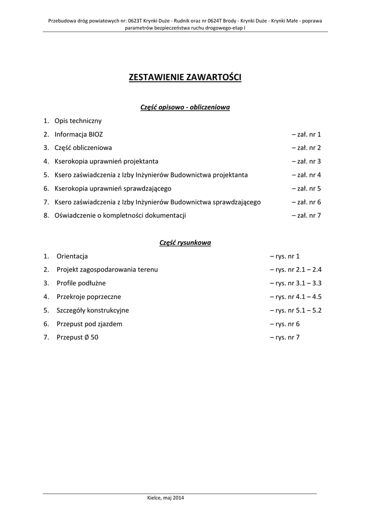 Przebudowa dróg powiatowych nr: 0623T Krynki Duże - Rudnik oraz nr 0624T Brody - Krynki Duże - Krynki Małe - poprawa parametrów bezpieczeństwa ruchu drogowego-etap I ZESTAWIENIE ZAWARTOŚCI Część opisowo - obliczeniowa 1. Opis techniczny 2. Informacja BIOZ – zał. nr 1 3. Część obliczeniowa – zał. nr 2 4. Kserokopia uprawnień projektanta – zał. nr 3 5. Ksero zaświadczenia z Izby Inżynierów Budownictwa projektanta – zał. nr 4 6. Kserokopia uprawnień sprawdzającego – zał. nr 5 7. Ksero zaświadczenia z Izby Inżynierów Budownictwa sprawdzającego – zał. nr 6 8. Oświadczenie o kompletności dokumentacji – zał. nr 7 Część rysunkowa 1. Orientacja – rys. nr 1 2. Projekt zagospodarowania terenu – rys. nr 2.1 – 2.4 3. Profile podłużne – rys. nr 3.1 – 3.3 4. Przekroje poprzeczne – rys. nr 4.1 – 4.5 5. Szczegóły konstrukcyjne – rys. nr 5.1 – 5.2 6. Przepust pod zjazdem – rys. nr 6 7. Przepust ∅ 50 – rys. nr 7 Kielce, maj 2014 Przebudowa dróg powiatowych nr: 0623T Krynki Duże - Rudnik oraz nr 0624T Brody - Krynki Duże - Krynki Małe - poprawa parametrów bezpieczeństwa ruchu drogowego-etap I Opis techniczny Przebudowa dróg powiatowych nr: 0623T Krynki Duże - Rudnik oraz nr 0624T Brody - Krynki Duże - Krynki Małe - poprawa parametrów bezpieczeństwa ruchu drogowego-etap I 1. Podstawa opracowania Aktualizację projektu budowlano - wykonawczego „Przebudowy dróg powiatowych nr: 0623T Krynki Duże - Rudnik oraz nr 0624T Brody - Krynki Duże - Krynki Małe - poprawa parametrów bezpieczeństwa ruchu drogowego-etap I” opracowano w oparciu o umowę zawartą pomiędzy Projektantem Krzysztofem Grosickim, a Zarządem Dróg Powiatowych w Starachowicach. 2. Projekt opracowano w oparciu o: • Projekt budowlano wykonawczy wykonany w roku 2013 • Rozporządzenie Ministra Transportu i Gospodarki Morskiej poz. 430 z dnia 02.03.1999r. w sprawie warunków technicznych, jakim powinny odpowiadać drogi publiczne i ich usytuowanie. /Dziennik Ustaw nr 43 z dnia 14 maja 1999r /. • "Katalog typowych konstrukcji nawierzchni podatnych i półsztywnych „ wydany przez Instytut Badawczy Dróg i Mostów, wprowadzony do stosowania zarządzeniem nr 6 Generalnego Dyrektora Dróg Publicznych z dnia 24.04.1997 r. Warszawa 1997r. • "Wytyczne projektowania ulic" wydane przez Generalną Dyrekcję Dróg Publicznych. Warszawa 1992r . • "Katalog szczegółów drogowych ulic, placów i parków miejskich" . KB 8-3.3.(7) symbol dokumentu U-17 ,wydany przez Centrum Technik Budownictwa Komunalnego. Warszawa 1987r. • „Szczegółowe warunki techniczne dla znaków drogowych pionowych i warunki ich umieszczania na drogach” – załącznik nr 1 do Rozporządzenia Ministra Infrastruktury z dnia 03.07.2003 • „Szczegółowe warunki techniczne dla znaków drogowych poziomych i warunki ich umieszczania na drogach” – załącznik nr 2 do Rozporządzenia Ministra Infrastruktury z dnia 03.07.2003 • Wizja lokalna w terenie Kielce, maj 2014 Przebudowa dróg powiatowych nr: 0623T Krynki Duże - Rudnik oraz nr 0624T Brody - Krynki Duże - Krynki Małe - poprawa parametrów bezpieczeństwa ruchu drogowego-etap I 3. Stan istniejący i warunki gruntowo wodne Przebudowywane drogi powiatowe nr 0623T i 0624T – ulice Kościelna i Długa położone są w północno – wschodniej części miejscowości Krynki. W chwili obecnej ulice posiadają nawierzchnię bitumiczna o szerokości jezdni zmiennej od 4,0m do 5,0m. Ulica Kościelna posiada jednostronny chodnik z betonowych elementów drobnowymiarowych. Od strony chodnika istnieje krawężnik betonowy 15x30x100cm. Po przeciwnej stronie chodnika istnieje ciek z elementów betonowych szerokości 50cm ze skarpami umocnionymi płytami betonowymi 50x50x7cm. Nawierzchnia jest w złym stanie technicznym. Ulica Długa posiada nawierzchnię bitumiczną w złym stanie technicznym, zróżnicowaną konstrukcyjnie ze względu na wykonany kanał sanitarny przebiegający w jej północnej krawędzi. W rejonie skrzyżowania z ulicą Kościelną istnieje chodnik z betonowych elementów drobnowymiarowych ograniczony krawężnikiem betonowym 15x30cm. Obydwie ulice wyposażone są w zjazdy na pola i posesje o zróżnicowanej konstrukcji od gruntowej do nawierzchni z kostki betonowej i trylinki. Ze względu na pofałdowany teren na ulicy Długiej istnieją dwa przepusty z wpustami ściekowymi odprowadzające wody opadowe do istniejących cieków wodnych umocnionych betonowymi elementami ażurowymi i płytami betonowymi 50x50x7cm. Przeprowadzone odkrywki geotechniczne wykazały że średnia grubość konstrukcji jezdni istniejącej wynosi 0,40m, grubość nawierzchni asfaltowej jest zmienna i wynosi od 2 do 4cm, podbudowa tłuczniowa grubości od 36 do 38cm. Poniżej do głębokości 2,0m zalegają piski gliniaste oraz iły piaszczyste. Wody gruntowej nie stwierdzono. Na poboczu występuje humus trawiasty średniej grubości 15cm. W pasie drogowym rejonie rozbudowy występuje następujące istniejące uzbrojenie: • wodociąg • kable energetyczne • linia napowietrzna NN • linia napowietrzna teletechniczna • gazociąg • kanalizacja sanitarna Kielce, maj 2014 Przebudowa dróg powiatowych nr: 0623T Krynki Duże - Rudnik oraz nr 0624T Brody - Krynki Duże - Krynki Małe - poprawa parametrów bezpieczeństwa ruchu drogowego-etap I 4. Cel i zakres opracowania Celem niniejszego opracowania jest aktualizacja opracowanej w 2013 r. dokumentacji dla w/w zadania. 5. Projekt zagospodarowania terenu Przebudowywane drogi powiatowe nr 0623T i 0624T – ulice Kościelna i Długa położone są w północno – wschodniej części miejscowości Krynki. Początek przebudowywanego odcinka ulicy Kościelnej rozpoczyna się w km roboczym 0+000 a kończy na skrzyżowaniu z ul. Długą w km roboczym 0+462,63. Projektowana ulica posiadać będzie szerokość jezdni 5,5m z chodnikiem zlokalizowanym przy lewej krawędzi jezdni. W km 0+062,02 projekt