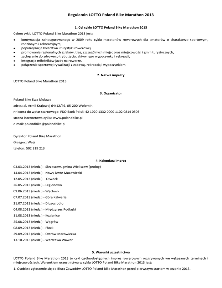 Regulamin LOTTO Poland Bike Marathon 2013 1. Cel cyklu LOTTO Poland Bike Marathon 2013 Celem cyklu LOTTO Poland Bike Marathon 2013 jest: kontynuacja zainaugurowanego w 2009 roku cyklu maratonów rowerowych dla amatorów o charakterze sportowym, rodzinnym i rekreacyjnym, popularyzacja kolarstwa i turystyki rowerowej, promowanie regionalnych szlaków, tras, szczególnych miejsc oraz miejscowości i gmin turystycznych, zachęcanie do zdrowego trybu życia, aktywnego wypoczynku i rekreacji, integracja miłośników jazdy na rowerze, połączenie sportowej rywalizacji z zabawą, rekreacją i wypoczynkiem. 2. Nazwa imprezy LOTTO Poland Bike Marathon 2013 3. Organizator Poland Bike Ewa Mulawa adres: al. Armii Krajowej 64/12/49, 05-200 Wołomin nr konta do wpłat startowego: PKO Bank Polski 42 1020 1332 0000 1102 0814 0503 strona internetowa cyklu: www.polandbike.pl e-mail: [email protected] Dyrektor Poland Bike Marathon Grzegorz Wajs telefon: 502 319 213 4. Kalendarz imprez 03.03.2013 (niedz.) - Skrzeszew, gmina Wieliszew (prolog) 14.04.2013 (niedz.) - Nowy Dwór Mazowiecki 12.05.2013 (niedz.) – Otwock 26.05.2013 (niedz.) - Legionowo 09.06.2013 (niedz.) - Wąchock 07.07.2013 (niedz.) - Góra Kalwaria 21.07.2013 (niedz.) - Długosiodło 04.08.2013 (niedz.) - Międzyrzec Podlaski 11.08.2013 (niedz.) - Kozienice 25.08.2013 (niedz.) - Węgrów 08.09.2013 (niedz.) - Płock 29.09.2013 (niedz.) - Ostrów Mazowiecka 13.10.2013 (niedz.) - Warszawa Wawer 5. Warunki uczestnictwa LOTTO Poland Bike Marathon 2013 to cykl ogólnodostępnych imprez rowerowych rozgrywanych we wskazanych terminach i miejscowościach. Warunkiem uczestnictwa w cyklu LOTTO Poland Bike Marathon 2013 jest: 1. Osobiste zgłoszenie się do Biura Zawodów LOTTO Poland Bike Marathon przed pierwszym startem w sezonie 2013. 2. Przed pierwszym startem własnoręcznie i czytelne podpisanie deklaracji udziału w LOTTO Poland Bike Marathon 2013 wraz z oświadczeniem o treści: „Organizator, wszystkie osoby z nim współpracujące, a także osoby związane z przeprowadzeniem i organizacją maratonu nie ponoszą odpowiedzialności względem uczestników za szkody osobowe, rzeczowe i majątkowe, które wystąpią przed, w trakcie lub po maratonie. Uczestnicy startują na własną odpowiedzialność. Uczestnicy ponoszą odpowiedzialność cywilną i prawną za wszystkie szkody. Przez akceptację niniejszej deklaracji uczestnicy zrzekają się prawa dochodzenia prawnego lub zwrotnego od organizatora lub jego zleceniobiorców w razie wypadku lub szkody związanej z zawodami. Przyjmuję do wiadomości, że w razie wypadku nie mogę wnosić żadnych roszczeń w stosunku do organizatora. Przyjmuję do wiadomości, że należy przestrzegać zarządzeń służb porządkowych oraz warunków regulaminu. Zapoznałam / zapoznałem się z trasą i zgadzam się z warunkami uczestnictwa i zgłaszam swoje uczestnictwo w ww. zawodach. W przypadku startu młodzieży poniżej 18 lat wymagana jest zgoda rodzica lub opiekuna prawnego, poprzez złożenie podpisu. Zdjęcia, nagrania filmowe oraz wywiady z moją osobą, a także wyniki z moimi danymi osobowymi mogą być wykorzystane przez prasę, radio i telewizję. Swoim podpisem zapewniam, że zapoznałem się z wszystkimi warunkami regulaminu zawodów i wypełniłem formularz zgłoszeniowy zgodnie z prawdą oraz kompletnie. Wyrażam zgodę na przetwarzanie moich danych osobowych przez Poland Bike z siedzibą w Wołominie zgodnie z ustawą z dnia 29 sierpnia 1997 r. o ochronie danych osobowych (Dz. U. Nr 133, poz.883). Niniejsza deklaracja obowiązuje na wszystkich edycjach tegorocznego cyklu.” Deklarację udziału w cyklu LOTTO Poland Bike Marathon 2013 wypełnia się tylko jeden raz w sezonie. Deklaracja obowiązuje przez wszystkie edycje. 3. Dokonanie opłaty startowej w wysokości zgodnej z niniejszym regulaminem. Oryginał dowodu opłaty startowej należy zachować do wglądu w Biurze Zawodów podczas rejestracji. Potwierdzeniem udziału w poszczególnych edycjach LOTTO Poland Bike Marathon 2013 jest rejestracja, dokonanie opłaty wpisowego oraz start w danej edycji. Impreza ma charakter otwarty. Prawo udziału w zawodach mają osoby nie posiadające licencji PZKol jak również zawodnicy z licencjami PZKol. Zabrania się udziału w LOTTO Poland Bike Marathon 2013 zawodnikom odbywającym karę zawieszenia przez Polski Związek Kolarski i inne związki sportowe. Każdy uczestnik startuje na własną odpowiedzialność. Zawodnicy niepełnoletni dopuszczeni są do startu po złożeniu w Biurze Zawodów LOTTO Poland Bike Marathon 2013 pisemnej zgody rodzica lub opiekuna prawnego na start w wyścigu. Zawodnicy w wieku poniżej 16 lat dopuszczeni są do startu wyłącznie w towarzystwie rodzica lub opiekuna prawnego, albo podczas jego pobytu w miasteczku sportowym w czasie wyścigu. Każdy uczestnik LOTTO Poland Bike Marathon 2013 jest zobowiązany do jazdy na sprawnym rowerze w kasku sztywnym. Rower powinien posiadać dzwonek, oświetlenie oraz odblaski. Start zawodnika w zawodach jest równoznaczny z wyrażeniem przez niego zgody na stosowanie się do zasad opisanych w niniejszym Regulaminie. Zawodnik powinien zanotować sobie i pamiętać nr alarmowy: 501 869 977. 6. Opłaty wpisowe Udział w zawodach z cyklu LOTTO Poland Bike Marathon 2013 jest płatny. Wysokość opłaty startowej uzależniona od dystansu na jakim startuje zawodnik i wynosi: 60 zł - opłata za start na dystansie Mini lub Max. W dniu startu opłaty w Biurze Zawodów przyjmowane są do godziny 12.00. 30 zł - opłata za start na dystansie Mini lub Max dla osób urodzonych w latach 1944 - 1948. W dniu startu opłaty w Biurze Zawodów przyjmowane są do godziny 12.00. 30 zł - opłata za start na dystansie Fan. W dniu startu opłaty w Biurze Zawodów przyjmowane są do godziny 11.00. 580 zł - pakiet startowy Full obejmujący uczestnictwo we wszystkich imprezach z cyklu LOTTO Poland Bike Marathon 2013 na dystansach Mini lub Max. 300 zł - paki