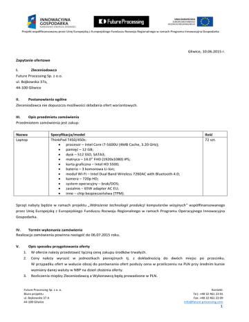 Projekt współfinansowany przez Unię Europejską z Europejskiego Funduszu Rozwoju Regionalnego w ramach Programu Innowacyjna Gospodarka Gliwice, 10.06.2015 r. Zapytanie ofertowe I. Zleceniodawca Future Processing Sp. z o.o. ul. Bojkowska 37a, 44-100 Gliwice II. Postanowienia ogólne Zleceniodawca nie dopuszcza możliwości składania ofert wariantowych. III. Opis przedmiotu zamówienia Przedmiotem zamówienia jest zakup: Nazwa Laptop Specyfikacja/model ThinkPad T450/450s: procesor – Intel Core i7-5600U (4MB Cache, 3.20 GHz); pamięć – 12 GB; dysk – 512 SSD, SATA3; matryca – 14.0” FHD (1920x1080) IPS; karta graficzna – Intel HD 5500; bateria – 3 komorowa Li-Ion; moduł Wi-Fi – Intel Dual Band Wireless 7260AC with Bluetooth 4.0; kamera – 720p HD; system operacyjny – brak/DOS; zasialnie – 65W adapter AC EU; inne – chip bezpieczeństwa (TPM). Ilość 72 szt. Sprzęt nabyty będzie w ramach projektu „Wdrożenie technologii produkcji komputerów wizyjnych” współfinansowanego przez Unię Europejską z Europejskiego Funduszu Rozwoju Regionalnego w ramach Programu Operacyjnego Innowacyjna Gospodarka. IV. Termin wykonania zamówienia Realizacja zamówienia powinna nastąpić do 06.07.2015 roku. V. Opis sposobu przygotowania oferty 1. W ofercie należy przedstawić łączną cenę zakupu środków trwałych. 2. Ceny należy wyrazić w jednostkach pieniężnych tj. z dokładnością do dwóch miejsc po przecinku. W przypadku ofert w walucie obcej do porównania ofert posłuży cena w przeliczeniu na PLN przy średnim kursie wymiany danej waluty w NBP na dzień złożenia oferty. 3. Rozliczenia między Zleceniodawcą a Wykonawcą będą prowadzone w PLN. Future Processing Sp. z o. o. Biuro projektu ul. Bojkowska 37 A 44-100 Gliwice Kontakt: Te|: +48 32 461 23 01 Fax: +48 32 461 23 09 [email protected] 1 Projekt współfinansowany przez Unię Europejską z Europejskiego Funduszu Rozwoju Regionalnego w ramach Programu Innowacyjna Gospodarka VI. Miejsce oraz terminy składania ofert 1. Ofertę należy złożyć w terminie do dnia 16.06.2015 r. do godz. 10:00 w Biurze projektu przy ul. Bojkowska 37 A, 44-100 Gliwice, pokój 106, osobiście, drogą pocztową na powyższy adres, faksem +48 32 461 23 09, bądź pocztą elektroniczną na adres [email protected]. 2. Oferty złożone po terminie będą zwracane składającym bez otwierania. 3. Przed upływem terminu do składania ofert Wykonawca może zmienić lub wycofać swoją ofertę. 4. W toku badania i oceny ofert Zleceniodawca może zwrócić się do Wykonawców celem uzyskania wyjaśnień dotyczących treści złożonych ofert. VII. Ocena ofert Komisyjna ocena ofert rozpocznie się w dniu 16.06.2015 r. o godz. 11:00 w siedzibie firmy Future Processing Sp. z o. o., ul. Bojkowska 37 A, 44-100 Gliwice. Złożone oferty zostaną poddane ocenie komisyjnej na podstawie kryteriów oceny przedstawionych poniżej: 1. Za najkorzystniejszą zostanie uznana ta oferta, która uzyska najwyższą ocenę końcową. 2. Jeżeli firma, której oferta została wybrana, uchyla się od zawarcia transakcji, Zleceniodawca może wybrać ofertę najkorzystniejszą spośród pozostałych ofert lub rozpocząć nową procedurę pozyskiwania i oceny ofert. Kryterium Cena 100% Future Processing Sp. z o. o. Biuro projektu ul. Bojkowska 37 A 44-100 Gliwice Waga Oferty zostaną uszeregowane zgodnie z oferowaną ceną (od najniższej do najwyższej). Następnie, każdej ofercie zostanie przyznana liczba punktów odpowiadająca zajmowanemu miejscu w rankingu, przy czym: • cena najniższa - 100 punktów • cena najwyższa - 0 punktów Kontakt: Te|: +48 32 461 23 01 Fax: +48 32 461 23 09 [email protected] 2