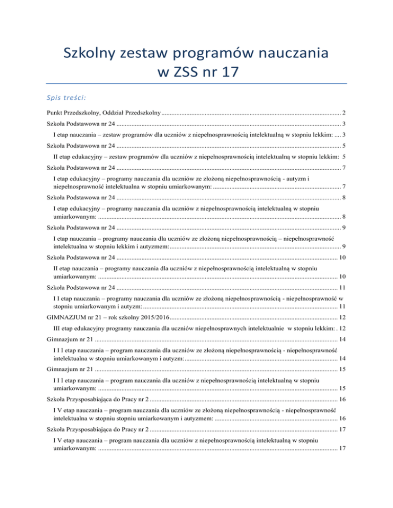 Szkolny zestaw programów nauczania w ZSS nr 17 Spis treści: Punkt Przedszkolny, Oddział Przedszkolny ............................................................................................................ 2 Szkoła Podstawowa nr 24 ....................................................................................................................................... 3 I etap nauczania – zestaw programów dla uczniów z niepełnosprawnością intelektualną w stopniu lekkim: .... 3 Szkoła Podstawowa nr 24 ....................................................................................................................................... 5 II etap edukacyjny – zestaw programów dla uczniów z niepełnosprawnością intelektualną w stopniu lekkim: 5 Szkoła Podstawowa nr 24 ....................................................................................................................................... 7 I etap edukacyjny – programy nauczania dla uczniów ze złożoną niepełnosprawnością - autyzm i niepełnosprawność intelektualna w stopniu umiarkowanym: ............................................................................. 7 Szkoła Podstawowa nr 24 ....................................................................................................................................... 8 I etap edukacyjny – programy nauczania dla uczniów z niepełnosprawnością intelektualną w stopniu umiarkowanym: .................................................................................................................................................. 8 Szkoła Podstawowa nr 24 ....................................................................................................................................... 9 I etap nauczania – programy nauczania dla uczniów ze złożoną niepełnosprawnością – niepełnosprawność intelektualna w stopniu lekkim i autyzmem: ....................................................................................................... 9 Szkoła Podstawowa nr 24 ..................................................................................................................................... 10 II etap nauczania – programy nauczania dla uczniów z niepełnosprawnością intelektualną w stopniu umiarkowanym: ................................................................................................................................................ 10 Szkoła Podstawowa nr 24 ..................................................................................................................................... 11 I I etap nauczania – programy nauczania dla uczniów ze złożoną niepełnosprawnością - niepełnosprawność w stopniu umiarkowanym i autyzm: ..................................................................................................................... 11 GIMNAZJUM nr 21 – rok szkolny 2015/2016 ..................................................................................................... 12 III etap edukacyjny programy nauczania dla uczniów niepełnosprawnych intelektualnie w stopniu lekkim: . 12 Gimnazjum nr 21 .................................................................................................................................................. 14 I I I etap nauczania – program nauczania dla uczniów ze złożoną niepełnosprawnością - niepełnosprawność intelektualna w stopniu umiarkowanym i autyzm: ............................................................................................ 14 Gimnazjum nr 21 .................................................................................................................................................. 15 I I I etap nauczania – program nauczania dla uczniów z niepełnosprawnością intelektualną w stopniu umiarkowanym: ................................................................................................................................................ 15 Szkoła Przysposabiająca do Pracy nr 2 ................................................................................................................. 16 I V etap nauczania – program nauczania dla uczniów ze złożoną niepełnosprawnością - niepełnosprawność intelektualna w stopniu stopniu umiarkowanym i autyzmem: .......................................................................... 16 Szkoła Przysposabiająca do Pracy nr 2 ................................................................................................................. 17 I V etap nauczania – program nauczania dla uczniów z niepełnosprawnością intelektualną w stopniu umiarkowanym: ................................................................................................................................................ 17 Punkt Przedszkolny, Oddział Przedszkolny Lp Klasa Przedmiot Program, tytuł, nr, autor 1. Punkt Przedszkolny Wychowanie przedszkolne „Nasze przedszkole”- program edukacji przedszkolnej wspomagający rozwój aktywności dzieci., M. Kwaśniewska, W. Żaba- Żabińska, Grupa Edukacyjna S.A., Kielce 2014, D.4240.1.2015.PP i OP 2. Oddział Przedszkolny Wychowanie przedszkolne „Nasze przedszkole”- program edukacji przedszkolnej wspomagający rozwój aktywności dzieci., M. Kwaśniewska, W. Żaba- Żabińska, Grupa Edukacyjna S.A., Kielce 2014, D.4240.2.2015.PP i OP Szkoła Podstawowa nr 24 I etap nauczania – zestaw programów dla uczniów z niepełnosprawnością intelektualną w stopniu lekkim: Lp 1. Klasa III Autor Program własny B. Pałkowska 2. III Program własny B. Pałkowska 3. III Program własny A. Buss D. Szulc 4. I, II D.4240.2.201 4.SP-I Tytuł programu Numer programu Kształcenie zintegrowane. Program nauczania dla I etapu edukacyjnego sześcioletniej szkoły podstawowej specjalnej dla uczniów z upośledzeniem umysłowym w stopniu lekkim opracowany w oparciu o podstawę programową z dnia 23 grudnia 2008 r. oraz program autors