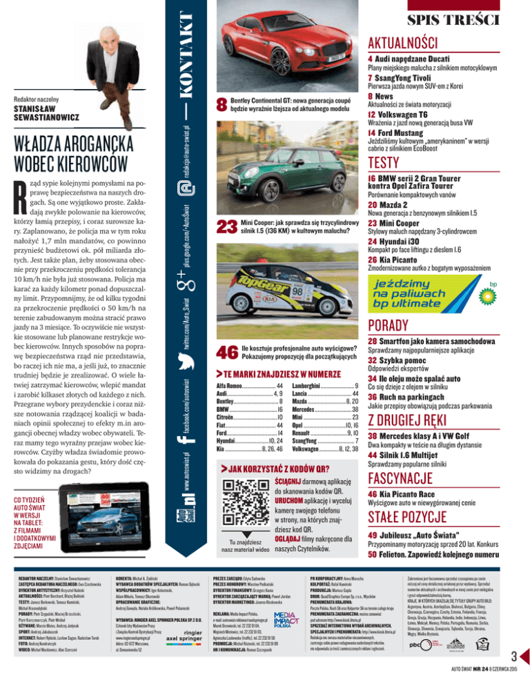 KONTAKT Redaktor naczelny plus.google.com/+AutoŚwiat twitter.com/Auto_Swiat CO TYDZIEŃ AUTO ŚWIAT W WERSJI NA TABLET: Z FILMAMI I DODATKOWYMI ZDJĘCIAMI REDAKTOR NACZELNY: Stanis∏aw Sewastianowicz ZASTĘPCA REDAKTORA NACZELNEGO: Ewa Czechowska DYREKTOR ARTYSTYCZNY: Krzysztof Kubicki AKTUALNOŚCI: Piotr Burchard, Błażej Buliński TESTY: Janusz Borkowski, Tomasz Kamiński, Micha∏ Krasnodębski PORADY: Piotr Szypulski, Maciej Brzeziński, Piotr Karczmarczyk, Piotr Wróbel UŹYWANE: Marcin Matus, Andrzej Jedynak SPORT: Andrzej Jakubaszek INTERNET: Robert Rybicki, Lesław Sagan, Radosław Turek FOTO: Andrzej Kondratczyk WIDEO: Michał Mackiewicz, Alan Szerszeń 4 Audi napędzane Ducati Plany miejskiego malucha z silnikiem motocyklowym 7 SsangYong Tivoli Pierwsza jazda nowym SUV-em z Korei 8 Bentley Continental GT: nowa generacja coupé będzie wyraźnie lżejsza od aktualnego modelu 8 News Aktualności ze świata motoryzacji 12 Volkswagen T6 Wrażenia z jazd nową generacją busa VW 14 Ford Mustang Jeździliśmy kultowym „amerykaninem” w wersji cabrio z silnikiem EcoBoost TESTY 16 BMW serii 2 Gran Tourer kontra Opel Zafira Tourer Porównanie kompaktowych vanów facebook.com/autoswiat R ząd sypie kolejnymi pomysłami na poprawę bezpieczeństwa na naszych drogach. Są one wyjątkowo proste. Zakładają zwykłe polowanie na kierowców, którzy łamią przepisy, i coraz surowsze kary. Zaplanowano, że policja ma w tym roku nałożyć 1,7 mln mandatów, co powinno przynieść budżetowi ok. pół miliarda złotych. Jest także plan, żeby stosowana obecnie przy przekroczeniu prędkości tolerancja 10 km/h nie była już stosowana. Policja ma karać za każdy kilometr ponad dopuszczalny limit. Przypomnijmy, że od kilku tygodni za przekroczenie prędkości o 50 km/h na terenie zabudowanym można stracić prawo jazdy na 3 miesiące. To oczywiście nie wszystkie stosowane lub planowane restrykcje wobec kierowców. Innych sposobów na poprawę bezpieczeństwa rząd nie przedstawia, bo raczej ich nie ma, a jeśli już, to znacznie trudniej będzie je zrealizować. O wiele łatwiej zatrzymać kierowców, wlepić mandat i zarobić kilkaset złotych od każdego z nich. Przegrane wybory prezydenckie i coraz niższe notowania rządzącej koalicji w badaniach opinii społecznej to efekty m.in arogancji obecnej władzy wobec obywateli. Teraz mamy tego wyraźny przejaw wobec kierowców. Czyżby władza świadomie prowokowała do pokazania gestu, który dość często widzimy na drogach? www.autoswiat.pl WŁADZA AROGANCKA WOBEC KIEROWCÓW AKTUALNOŚCI [email protected] STANISŁAW CZ SEWASTIANOWICZ SPIS TREŚCI 20 Mazda 2 23 Nowa generacja z benzynowym silnikiem 1.5 Mini Cooper: jak sprawdza się trzycylindrowy silnik 1.5 (136 KM) w kultowym maluchu? 23 Mini Cooper Stylowy maluch napędzany 3-cylindrowcem 24 Hyundai i30 Kompakt po face liftingu z dieslem 1.6 26 Kia Picanto Zmodernizowane autko z bogatym wyposażeniem PORADY Auto Swiat 55_5x16.indd 1 46 Ile kosztuje profesjonalne auto wyścigowe? Pokazujemy propozycję dla początkujących TE MARKI ZNAJDZIESZ W NUMERZE Alfa Romeo........................ 44 Audi................................. 4, 9 Bentley................................ 8 BMW ..................................16 Citroën ...............................10 Fiat.................................... 44 Ford.................................... 14 Hyundai ........................10, 24 Kia ..........................8, 26, 46 Lamborghini ........................ 9 Lancia ............................... 44 Mazda ...........................8, 20 Mercedes .......................... 38 Mini .................................. 23 Opel ..............................10, 16 Renault ..........................9, 10 SsangYong .......................... 7 Volkswagen ..............8, 12, 38 JAK KORZYSTAĆ Z KODÓW QR? Tu znajdziesz nasz materiał wideo ŚCIĄGNIJ darmową aplikację do skanowania kodów QR. URUCHOM aplikację i wyceluj kamerę swojego telefonu w strony, na których znajdziesz kod QR. OGLĄDAJ filmy nakręcone dla naszych Czytelników. KOREKTA: Michał A. Zieliński WYDAWCA DODATKÓW SPECJALNYCH: Roman Dębecki WSPÓ¸PRACOWNICY: Igor Kohutnicki, Adam Mikuła, Tomasz Okurowski OPRACOWANIE GRAFICZNE: Andrzej Gawęda, Natalia Królikowska, Paweł Polaniecki PREZES ZARZĄDU: Edyta Sadowska PREZES HONOROWY: Wies∏aw Podkański DYREKTOR FINANSOWY: Grzegorz Kania DYREKTOR ZARZĄDZAJĄCY MARKĄ: Paweł Jordan DYREKTOR MARKETINGU: Joanna Kloskowska WYDAWCA: RINGIER AXEL SPRINGER POLSKA SP. Z O.O. Cz∏onek Izby Wydawców Prasy i Związku Kontroli Dystrybucji Prasy www.ringieraxelspringer.pl Adres: 02-672 Warszawa, ul. Domaniewska 52 REKLAMA: Media Impact Polska, e-mail: [email protected] Marek Drzewiecki, tel. 22 232 01 04, Wojciech Mistewicz, tel. 22 232 01 03, Agnieszka Laskowska (traffic), tel. 22 232 01 50 PROMOCJA: Michał Róziecki, tel. 22 232 01 89 HR I KOMUNIKACJA: Roman Szczepanik 1/15/15 12:37 PM 28 Smartfon jako kamera samochodowa Sprawdzamy najpopularniejsze aplikacje 32 Szybka pomoc Odpowiedzi ekspertów 34 Ile oleju może spalać auto Co się dzieje z olejem w silniku 36 Ruch na parkingach Jakie przepisy obowiązują podczas parkowania Z DRUGIEJ RĘKI 38 Mercedes klasy A i VW Golf Dwa kompakty w teście na długim dystansie 44 Silnik 1.6 Multijet Sprawdzamy popularne silniki FASCYNACJE 46 Kia Picanto Race Wyścigowe auto w niewygórowanej cenie STAŁE POZYCJE 49 Jubileusz „Auto Świata” Przypominamy motoryzację sprzed 20 lat. Konkurs 50 Felieton. Zapowiedź kolejnego numeru PR KORPORACYJNY: Anna Marucha KOLPORTAŹ: Rafał Kamiński PRODUKCJA: Mariusz Gajda DRUK: Quad/Graphics Europe Sp. z o.o., Wyszków PRENUMERATA KRAJOWA: Poczta Polska, Ruch SA oraz Kolporter SA na terenie ca∏ego kraju PRENUMERATA ZAGRANICZNA: można zamawiać pod adresem http://www.kiosk.literia.pl SPRZEDAŹ INTERNETOWA WYDAŃ ARCHIWALNYCH, SPECJALNYCH I PRENUMERATA: http://www.kiosk.literia.pl Redakcj