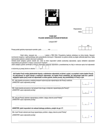Województwo Adres PGSW 2007 POLSKIE GENERALNE STUDIUM WYBORCZE Listopad 2007 h min Proszę podać godzinę rozpoczęcia wywiadu: godz. ............... min. .................. Dzień dobry, nazywam się .................. i jestem z PBS DGA. Prowadzimy badania ankietowe na różne tematy. Naszych rozmówców losujemy z ogólnopolskiego spisu gospodarstw domowych. Odpowiedzi na pytania ankiety są objęte całkowitą tajemnicą i będą wykorzystane jedynie w postaci zbiorczych zestawień. Ankieter:Jeżeli zadajesz pytanie otwarte (tzn. takie na które respondent udziela swobodnej odpowiedzi), zapisz dokładnie odpowiedź respondenta pod pytaniem w miejscu oznaczonym kropkami: ......................... Jeżeli zadajesz pytanie zamknięte (w którym respondent wskazuje odpowiedź z przedstawionej mu listy) w wówczas wpisz kod odpowiedzi w kolumnie po prawej stronie w okienko: lub . Jeśli będzie Pan(i) miał(a) jakiekolwiek kłopoty z udzieleniem odpowiedzi na któreś z pytań, na przykład: trudno będzie Panu(i) się zdecydować na wybór którejś z możliwych odpowiedzi, nie będzie Pan(i) wiedział(a), jak odpowiadać bądź też z jakichś względów będzie pan(i) wolał nie odpowiadać na dane pytanie, bardzo proszę, aby powiedział(a) mi Pan(i) o tym. C1. Jaka kwestia poruszana w ostatniej kampanii wyborczej była najważniejsza dla Pana(i) osobiście. (ANKIETER: wpisz odpowiedź poniżej) 1 ………………………………………………………………………………………. C2. A jaka kwestia poruszana w tej kampanii była drugą w kolejności najważniejszą dla Pana(i)? (ANKIETER: wpisz odpowiedź poniżej) 2 …....................................................................................................................... C3. Jaki jest Pana(i) zdaniem najważniejszy problem, stojący obecnie przed Polską? (ANKIETER: wpisz odpowiedź poniżej) 3 …................................................................................................................................................... ANKIETER: jeżeli respondent nie wskazał żadnego problemu, przejść do pyt. C7. C4. A jaki Pana(i) zdaniem jest drugi najważniejszy problem, stojący obecnie przed Polską? (ANKIETER: wpisz odpowiedź poniżej) 4 …......................................................................................................................................................... 2 C5. Która partia, Pana(i) zdaniem, najlepiej poradziłaby sobie z najważniejszym problemem stojącym przed Polską? (ANKIETER: wpisz odpowiedź poniżej) …......................................................................................................................................................... 5 ANKIETER: jeżeli respondent nie wskazał drugiego problemu w C4., przejść do pyt. C7. C6. Która partia, Pana(i) zdaniem, najlepiej poradziłaby sobie z drugim problemem? ……................................................................................................................................................ 6 ANKIETER: wręczyć respondentowi KARTĘ 1 C7. Niektórzy mówią, że to kto rządzi ma znaczenie. Inni mówią, że to kto rządzi nie ma znaczenia. Używając skali na karcie, gdzie JEDEN oznacza, że to, kto rządzi ma duże znaczenie, a PIĘĆ, że to, kto rządzi nie ma żadnego znaczenia, proszę zaznaczyć, jak określił(a)by Pan(i) swoje stanowisko. To, kto rządzi ma To, kto rządzi nie ma duże znaczenie żadnego znaczenia x-------------------------x-------------------------x-------------------------x-------------------------x 1 2 3 4 5 7. (nie czytać) trudno powiedzieć 7 ANKIETER: odebrać od respondenta KARTĘ 1 ANKIETER: wręczyć respondentowi KARTĘ 2. C8. Niektórzy mówią, że to na kogo się głosuje w wyborach i tak niczego nie zmieni. Inni mówią, że to na kogo się głosuje może wiele zmienić. Używając skali na KARCIE prosimy zaznaczyć, jak określił(a)by Pan(i) swoje stanowisko. To na kogo się głosuje To na kogo się głosuje i tak niczego nie zmieni może wiele zmienić x-------------------------x-------------------------x-------------------------x-------------------------x 1 2 3 4 5 7. (nie czytać) trudno powiedzieć 8 ANKIETER: odebrać respondentowi KARTĘ 2. C9. Jak ogólnie ocenia Pan(i) działalność rządów pod kierownictwem PiS w ciągu ostatnich dwóch lat? 1) bardzo dobrze 2) dobrze 3) źle 4) bardzo źle 7) (nie czytać) trudno powiedzieć 9 C10. Czy może Pan(i) powiedzieć, że którakolwiek partia w Polsce stosunkowo dobrze reprezentuje Pana(i) poglądy? 1) tak 2) nie … [przejść do pyt. C12.] 7) (nie czytać) trudno powiedzieć … [przejść do pyt. C12.] 10 C11. A która partia reprezentuje Pana(i) poglądy najlepiej? ANKIETER: wpisać nazwę wymienionej partii. 11 …................................................................................................................................................ C12. Niezależnie od tego, co sądzi Pan(i) o partiach, czy może Pan(i) powiedzieć, że którykolwiek z ważnych polityków stosunkowo dobrze reprezentuje Pana(i) poglądy? 1) tak 2) nie … [przejść do pyt. C14.] 7) (nie czytać) trudno powiedzieć … [przejść do pyt. C14.] 12 3 C13. A który z ważnych polityków najlepiej reprezentuje Pana(i) poglądy? (ANKIETER: wpisz odpowiedź poniżej) …................................................................................................................................................ 13 ANKIETER: wręczyć respondentowi KARTĘ 3 C14. Chcielibyśmy dowiedzieć się, co sądzi Pan(i) o każdej z wymienionych tu partii i ugrupowań politycznych. Gdy przeczytam Panu(i) nazwę partii politycznej, proszę umieścić ją na skali od 0 do 10, gdzie 0 oznacza, że partia ta zdecydowanie się Panu(i) nie podoba, a 10, że się ona Panu(i) zdecydowanie podoba. Jeśli nie słyszał(a) Pan(i) o którejś partii lub nie wie o niej dość, by ją ocen