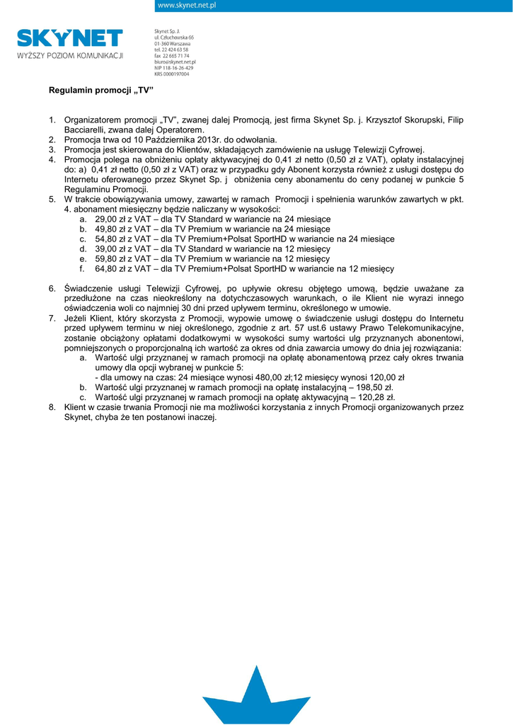 Regulamin promocji „TV” 1. Organizatorem promocji „TV”, zwanej dalej Promocją, jest firma Skynet Sp. j. Krzysztof Skorupski, Filip Bacciarelli, zwana dalej Operatorem. 2. Promocja trwa od 10 Października 2013r. do odwołania. 3. Promocja jest skierowana do Klientów, składających zamówienie na usługę Telewizji Cyfrowej. 4. Promocja polega na obniżeniu opłaty aktywacyjnej do 0,41 zł netto (0,50 zł z VAT), opłaty instalacyjnej do: a) 0,41 zł netto (0,50 zł z VAT) oraz w przypadku gdy Abonent korzysta również z usługi dostępu do Internetu oferowanego przez Skynet Sp. j obniżenia ceny abonamentu do ceny podanej w punkcie 5 Regulaminu Promocji. 5. W trakcie obowiązywania umowy, zawartej w ramach Promocji i spełnienia warunków zawartych w pkt. 4. abonament miesięczny będzie naliczany w wysokości: a. 29,00 zł z VAT – dla TV Standard w wariancie na 24 miesiące b. 49,80 zł z VAT – dla TV Premium w wariancie na 24 miesiące c. 54,80 zł z VAT – dla TV Premium+Polsat SportHD w wariancie na 24 miesiące d. 39,00 zł z VAT – dla TV Standard w wariancie na 12 miesięcy e. 59,80 zł z VAT – dla TV Premium w wariancie na 12 miesięcy f. 64,80 zł z VAT – dla TV Premium+Polsat SportHD w wariancie na 12 miesięcy 6. Świadczenie usługi Telewizji Cyfrowej, po upływie okresu objętego umową, będzie uważane za przedłużone na czas nieokreślony na dotychczasowych warunkach, o ile Klient nie wyrazi innego oświadczenia woli co najmniej 30 dni przed upływem terminu, określonego w umowie. 7. Jeżeli Klient, który skorzysta z Promocji, wypowie umowę o świadczenie usługi dostępu do Internetu przed upływem terminu w niej określonego, zgodnie z art. 57 ust.6 ustawy Prawo Telekomunikacyjne, zostanie obciążony opłatami dodatkowymi w wysokości sumy wartości ulg przyznanych abonentowi, pomniejszonych o proporcjonalną ich wartość za okres od dnia zawarcia umowy do dnia jej rozwiązania: a. Wartość ulgi przyznanej w ramach promocji na opłatę abonamentową przez cały okres trwania umowy dla opcji wybranej w punkcie 5: - dla umowy na czas: 24 miesiące wynosi 480,00 zł;12 miesięcy wynosi 120,00 zł b. Wartość ulgi przyznanej w ramach promocji na opłatę instalacyjną – 198,50 zł. c. Wartość ulgi przyznanej w ramach promocji na opłatę aktywacyjną – 120,28 zł. 8. Klient w czasie trwania Promocji nie ma możliwości korzystania z innych Promocji organizowanych przez Skynet, chyba że ten postanowi inaczej.