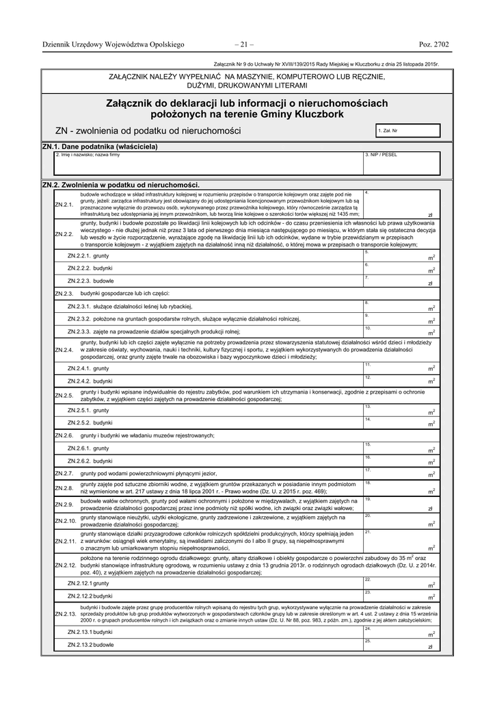 Dziennik Urzędowy Województwa Opolskiego ZN 11 2 – 21 – Poz. 2702 Załącznik Nr 9 do Uchwały Nr XVIII/139/2015 Rady Miejskiej w Kluczborku z dnia 25 listopada 2015r. ZAŁĄCZNIK NALEŻY WYPEŁNIAĆ NA MASZYNIE, KOMPUTEROWO LUB RĘCZNIE, DUŻYMI, DRUKOWANYMI LITERAMI Załącznik do deklaracji lub informacji o nieruchomościach położonych na terenie Gminy Kluczbork ZN - zwolnienia od podatku od nieruchomości ZN.1. Dane podatnika (właściciela) 1. Zał. Nr 0 0 0 2. Imię i nazwisko; nazwa firmy 3. NIP / PESEL 0 ZN.2. Zwolnienia w podatku od nieruchomości. 1 2 1 2 3 3 1 2 3 4 1 2 5 1 2 6 1 2 7 8 9 10 11 12 1 2 ZN.2.1. ZN.2.2. budowle wchodzące w skład infrastruktury kolejowej w rozumieniu przepisów o transporcie kolejowym oraz zajęte pod nie grunty, jeżeli: zarządca infrastruktury jest obowiązany do jej udostępniania licencjonowanym przewoźnikom kolejowym lub są przeznaczone wyłącznie do przewozu osób, wykonywanego przez przewoźnika kolejowego, który równocześnie zarządza tą infrastrukturą bez udostępniania jej innym przewoźnikom, lub tworzą linie kolejowe o szerokości torów większej niż 1435 mm; ZN.2.2.2. budynki ZN.2.2.3. budowle ZN.2.3.2. położone na gruntach gospodarstw rolnych, służące wyłącznie działalności rolniczej, ZN.2.3.3. zajęte na prowadzenie działów specjalnych produkcji rolnej; ZN.2.4.2. budynki ZN.2.5.2. budynki ZN.2.6.2. budynki ZN.2.8. ZN.2.9. ZN.2.10. m2 B zł C m2 B m2 B 2 B m2 A 2 B m2 A 2 B m2 A m 2 B m 2 A 7. 8. 9. 10. m 11. 12. m 13. 14. m grunty i budynki we władaniu muzeów rejestrowanych; ZN.2.6.1. grunty ZN.2.7. A grunty i budynki wpisane indywidualnie do rejestru zabytków, pod warunkiem ich utrzymania i konserwacji, zgodnie z przepisami o ochronie zabytków, z wyjątkiem części zajętych na prowadzenie działalności gospodarczej; ZN.2.5.1. grunty ZN.2.6. m2 6. grunty, budynki lub ich części zajęte wyłącznie na potrzeby prowadzenia przez stowarzyszenia statutowej działalności wśród dzieci i młodzieży w zakresie oświaty, wychowania, nauki i techniki, kultury fizycznej i sportu, z wyjątkiem wykorzystywanych do prowadzenia działalności gospodarczej, oraz grunty zajęte trwale na obozowiska i bazy wypoczynkowe dzieci i młodzieży; ZN.2.4.1. grunty ZN.2.5. 5. budynki gospodarcze lub ich części: ZN.2.3.1. służące działalności leśnej lub rybackiej, ZN.2.4. C zł grunty, budynki i budowle pozostałe po likwidacji linii kolejowych lub ich odcinków - do czasu przeniesienia ich własności lub prawa użytkowania wieczystego - nie dłużej jednak niż przez 3 lata od pierwszego dnia miesiąca następującego po miesiącu, w którym stała się ostateczna decyzja lub weszło w życie rozporządzenie, wyrażające zgodę na likwidację linii lub ich odcinków, wydane w trybie przewidzianym w przepisach o transporcie kolejowym - z wyjątkiem zajętych na działalność inną niż działalność, o której mowa w przepisach o transporcie kolejowym; ZN.2.2.1. grunty ZN.2.3. 4. grunty pod wodami powierzchniowymi płynącymi jezior, 15. 16. 17. grunty zajęte pod sztuczne zbiorniki wodne, z wyjątkiem gruntów przekazanych w posiadanie innym podmiotom niż wymienione w art. 217 ustawy z dnia 18 lipca 2001 r. - Prawo wodne (Dz. U. z 2015 r. poz. 469); 18. budowle wałów ochronnych, grunty pod wałami ochronnymi i położone w międzywalach, z wyjątkiem zajętych na prowadzenie działalności gospodarczej przez inne podmioty niż spółki wodne, ich związki oraz związki wałowe; 19. grunty stanowiące nieużytki, użytki ekologiczne, grunty zadrzewione i zakrzewione, z wyjątkiem zajętych na prowadzenie działalności gospodarczej; 20. grunty stanowiące działki przyzagrodowe członków rolniczych spółdzielni produkcyjnych, którzy spełniają jeden ZN.2.11. z warunków: osiągnęli wiek emerytalny, są inwalidami zaliczonymi do I albo II grupy, są niepełnosprawnymi o znacznym lub umiarkowanym stopniu niepełnosprawności, m2 zł m2 A C A 21. A m2 2 położone na terenie rodzinnego ogrodu działkowego: grunty, altany działkowe i obiekty gospodarcze o powierzchni zabudowy do 35 m oraz ZN.2.12. budynki stanowiące infrastrukturę ogrodową, w rozumieniu ustawy z dnia 13 grudnia 2013r. o rodzinnych ogrodach działkowych (Dz. U. z 2014r. poz. 40), z wyjątkiem zajętych na prowadzenie działalności gospodarczej; ZN.2.12.1.grunty ZN.2.12.2.budynki 22. 23. m2 A m2 B budynki i budowle zajęte przez grupę producentów rolnych wpisaną do rejestru tych grup, wykorzystywane wyłącznie na prowadzenie działalności w zakresie 13 ZN.2.13. sprzedaży produktów lub grup produktów wytworzonych w gospodarstwach członków grupy lub w zakresie określonym w art. 4 ust. 2 ustawy z dnia 15 września 2000 r. o grupach producentów rolnych i ich związkach oraz o zmianie innych ustaw (Dz. U. Nr 88, poz. 983, z późn. zm.), zgodnie z jej aktem założycielskim; 1 2 ZN.2.13.1.budynki ZN.2.13.2.budowle 24. m2 B zł C 25. Dziennik Urzędowy Województwa Opolskiego 14 1 2 3 15 1 2 3 16 1 ZN.2.14. ZN.2.14.1.grunty ZN.2.14.2.budynki ZN.2.14.3.budowle ZN.2.15.1.grunty ZN.2.15.2.budynki ZN.2.15.3.budowle ZN.2.16.1.grunty ZN.2.16.3.budowle 3 2 A m2 B zł C m2 A 2 B m 27. 28. 29. 30. m 31. C zł publiczne i niepubliczne jednostki organizacyjne objęte systemem oświaty oraz prowadzące je organy, w zakresie nieruchomości zajętych na ZN.2.16. działalność oświatową; ZN.2.16.2.budynki 2 26. ZN.2.15. uczelnie, zwolnienie nie dotyczy przedmiotów opodatkowania zajętych na działalność gospodarczą; 3 1 Poz. 2702 nieruchomości lub ich części zajęte na prowadzenie nieodpłatnej statutowej działalności pożytku publicznego przez organizacje pożytku publicznego. 2 17 – 22 – 32. m 2 A m 2 B 33. 34. C zł instytuty naukowe i pomocnicze jednostki naukowe Polskiej Akademii Nauk, w odniesieniu do nieruchomości lub ich części, które są niezbędne ZN.2.17. do realizacji zadań, o których mowa w art. 2 ustawy