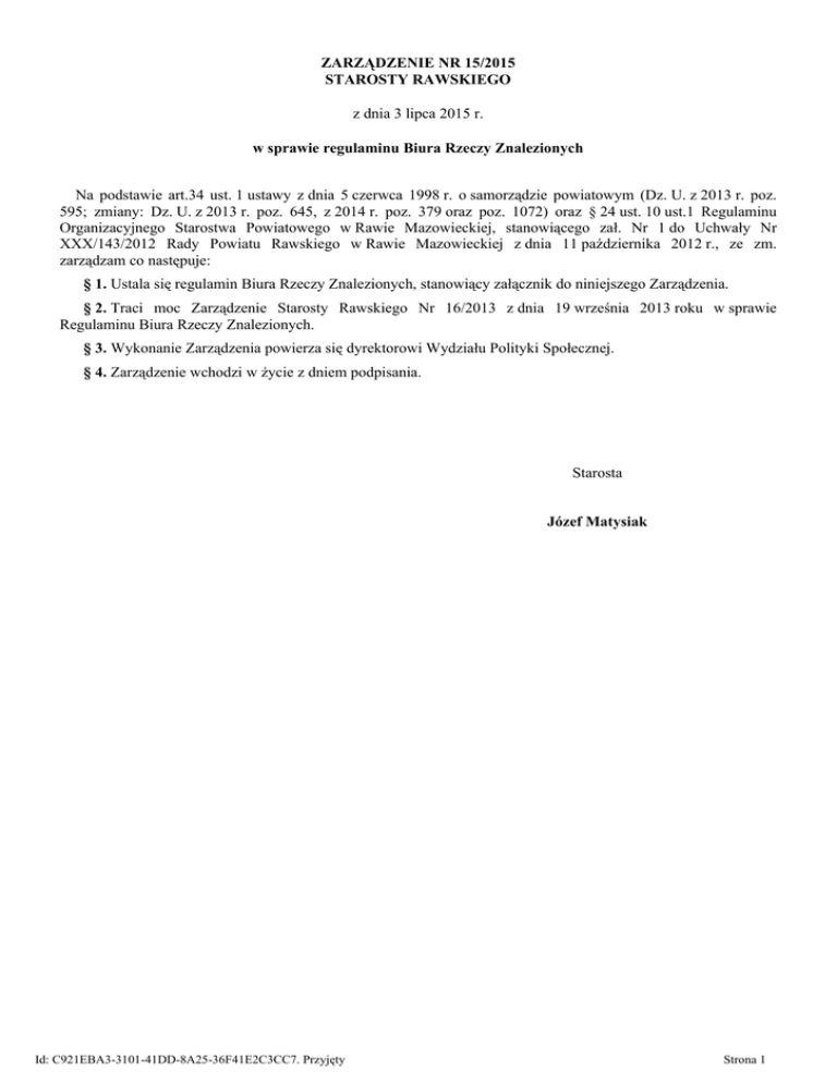 ZARZĄDZENIE NR 15/2015 STAROSTY RAWSKIEGO z dnia 3 lipca 2015 r. w sprawie regulaminu Biura Rzeczy Znalezionych Na podstawie art.34 ust. 1 ustawy z dnia 5 czerwca 1998 r. o samorządzie powiatowym (Dz. U. z 2013 r. poz. 595; zmiany: Dz. U. z 2013 r. poz. 645, z 2014 r. poz. 379 oraz poz. 1072) oraz § 24 ust. 10 ust.1 Regulaminu Organizacyjnego Starostwa Powiatowego w Rawie Mazowieckiej, stanowiącego zał. Nr 1 do Uchwały Nr XXX/143/2012 Rady Powiatu Rawskiego w Rawie Mazowieckiej z dnia 11 października 2012 r., ze zm. zarządzam co następuje: § 1. Ustala się regulamin Biura Rzeczy Znalezionych, stanowiący załącznik do niniejszego Zarządzenia. § 2. Traci moc Zarządzenie Starosty Rawskiego Nr 16/2013 z dnia 19 września 2013 roku w sprawie Regulaminu Biura Rzeczy Znalezionych. § 3. Wykonanie Zarządzenia powierza się dyrektorowi Wydziału Polityki Społecznej. § 4. Zarządzenie wchodzi w życie z dniem podpisania. Starosta Józef Matysiak Id: C921EBA3-3101-41DD-8A25-36F41E2C3CC7. Przyjęty Strona 1 Załącznik Nr 1 do Zarządzenia Nr 15/2015 Starosty Rawskiego z dnia 3 lipca 2015 r. Regulamin Biura Rzeczy Znalezionych Regulamin Biura Rzeczy Znalezionych § 1. Biuro Rzeczy Znalezionych, zwane dalej „Biurem” prowadzi Wydział Polityki Społecznej Starostwa Powiatowego w Rawie Mazowieckiej. § 2. Przedmiotem działalności Biura jest: 1. Przyjmowanie do depozytu i przechowywanie rzeczy znalezionych na terenie powiatu rawskiego. 2. Udzielanie informacji o posiadanych depozytach oraz prowadzenie poszukiwań osób uprawnionych. 3. Wydawanie depozytów lub ich sprzedaż. 4. Likwidacja niepodjętych depozytów. § 3. 1. Rzeczy znalezione i dostarczone do Biura przechowuje się w magazynie depozytów lub w banku obsługującym Starostwo Powiatowe w Rawie Mazowieckiej do czasu: 1) odbioru przez właściciela; 2) odbioru po spełnieniu przewidzianych prawem warunków przez znalazcę; 3) likwidacji niepodjętego depozytu lub jego sprzedaży; 2. Do depozytu Biura przyjmuje się przedmioty znalezione na terenie powiatu rawskiego w tym również : 1) pieniądze; 2) papiery wartościowe; 3) kosztowności 4) przedmioty o wartości naukowej i artystycznej; 5) dowody tożsamości i inne dokumenty. 3. Starostwo Powiatowe w Rawie Mazowieckiej nie ponosi odpowiedzialności za stan dostarczanych do Biura przedmiotów. § 4. 1. Biuro odmawia przyjęcia w depozyt rzeczy: 1) nie posiadających żadnej wartości oraz rzeczy, co do których zachodzi podejrzenie że zostały porzucone z zamiarem pozbycia się własności; 2) zaliczanych do produktów niebezpiecznych, łatwopalnych, żrących, wybuchowych; 3) stanowiących sprzęt i ekwipunek wojskowy, jak również dokumentów wystawianych przez administrację wojskową; 4) o właściwościach powodujących że ich przechowywanie staje się niemożliwe. 2. Biuro może odmówić przyjęcia w depozyt rzeczy o wartości szacunkowej poniżej 100 zł. 3. Biuro nie przyjmuje do depozytu zwierząt. § 5. 1. Przyjęcie rzeczy znalezionych do depozytu następuje na podstawie wypełnionego zawiadomienia o znalezieniu rzeczy. Wzór zawiadomienia stanowi załącznik nr 1 do niniejszego regulaminu. 2. Przyjęcie rzeczy znalezionej do depozytu potwierdza poświadczenie przyjęcia rzeczy znalezionej. Wzór poświadczenia stanowi załącznik nr 2 do niniejszego regulaminu. Id: C921EBA3-3101-41DD-8A25-36F41E2C3CC7. Przyjęty Strona 1 § 6. 1. Biuro prowadzi ewidencję rzeczy przyjętych do depozytu. 2. Ewidencja powinna zawierać następujące dane; 1) liczbę porządkową sprawy; 2) datę przyjęcia rzeczy w depozyt; 3) imię, nazwisko i adres znalazcy; 4) krótki opis rzeczy przyjętej w depozyt( rodzaj, ilość) 5) miejsce przechowywania rzeczy 6) datę wydania rzeczy osobie uprawnionej oraz jej imię, nazwisko i adres; 7) datę przejścia rzeczy znalezionej na rzecz znalazcy , Skarbu Państwa lub Powiatu 8) uwagi § 7. 1. Przekazane do depozytu polskie środki płatnicze Biuro przechowuje na rachunku bankowym sum depozytowych zgodnie z przepisami o rachunkowości budżetowej. 2. Wyroby z metali szlachetnych, biżuterię, zagraniczne środki płatnicze oraz papiery wartościowe Biuro przechowuje w banku obsługującym Starostwo Powiatowe w Rawie Mazowieckiej. 3. W przypadku rzeczy ulegających szybkiemu zepsuciu, a także rzeczy których przechowywanie byłoby związane ze znacznymi kosztami lub nadmiernymi trudnościami albo powodowałoby znaczne obniżenie ich wartości, organ przechowujący zarządzi sprzedaż rzeczy w trybie określonym w przepisach o postępowaniu egzekucyjnym w administracji. Uzyskane ze sprzedaży pieniądze wchodzą w miejsce rzeczy znalezionej. § 8. 1. W przypadku gdy nazwisko i miejsce zamieszkania osoby uprawnionej do odbioru rzeczy zostaną ustalone, Biuro wezwie niezwłocznie tę osobę listem poleconym za zwrotnym potwierdzeniem odbioru do odebrania depozytu pod rygorem jego utraty w trybie określonym w art 187. Kodeksu Cywilnego. 2. W przypadku braku możliwości doręczenia wezwania do odbioru depozytu lub nieustalenia uprawnionego do odbioru Biuro: 1) zamieszcza informacje o przyjętych do depozytu przedmiotach w Biuletynie Informacji Publicznej Starostwa Powiatowego w Rawie Mazowieckiej oraz na tablicy informacyjnej Starostwa. 2) w przypadku gdy szacunkowa wartość depozytu przekracza kwotę 5000 zł , Biuro zamieści ogłoszenie o depozycie w dzienniku o zakresie lokalnym. § 9. Warunkiem wydania depozytu osobie uprawnionej jest złożenie jego szczegółowego opisu lub przedstawienie dokumentów potwierdzających prawo własności. Osoba zgłaszająca się po odbiór rzeczy składa pisemne oświadczenie o zagubieniu rzeczy z podaniem daty i miejsca utraty oraz opisem rzeczy lub przedkłada dokumenty potwierdzające prawo własności. Wzór oświadczenia stanowi załącznik nr 3 do niniejszego regulaminu. § 10. Pracownik prowadzący Biuro wydając depozyt osobie uprawnionej zobowiązany jest do: 1. Sprawdzenia tożsamośc