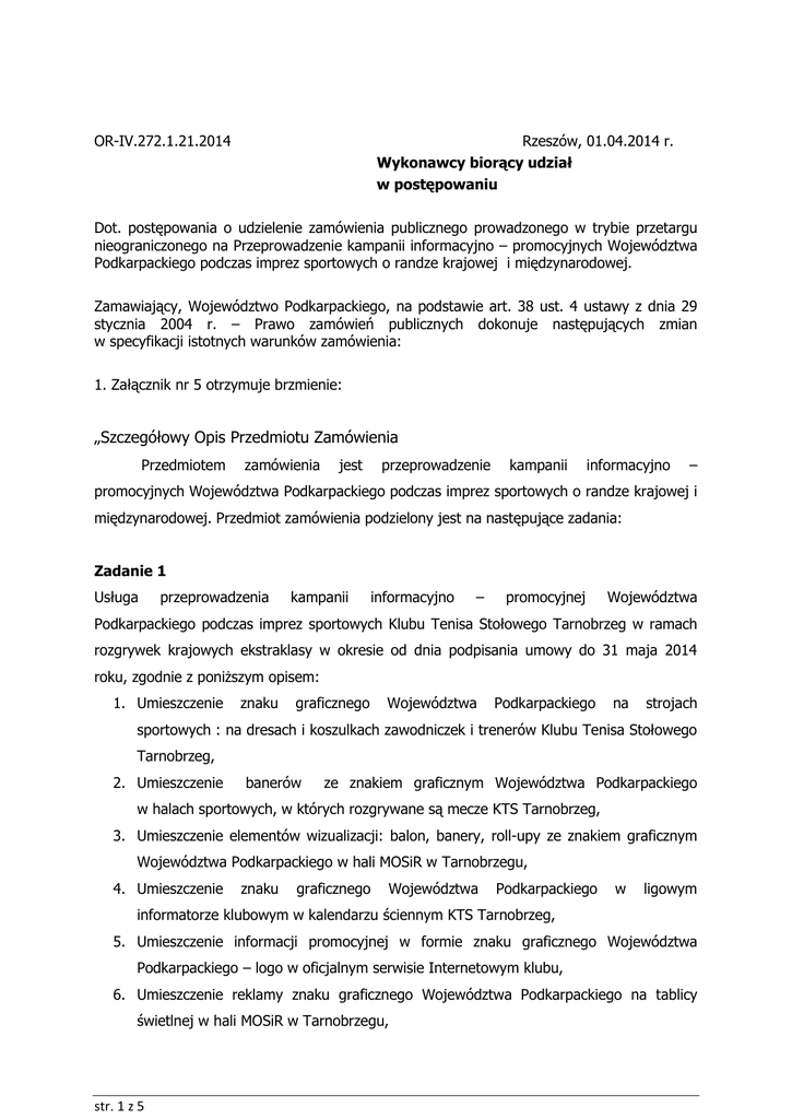OR-IV.272.1.21.2014 Rzeszów, 01.04.2014 r. Wykonawcy biorący udział w postępowaniu Dot. postępowania o udzielenie zamówienia publicznego prowadzonego w trybie przetargu nieograniczonego na Przeprowadzenie kampanii informacyjno – promocyjnych Województwa Podkarpackiego podczas imprez sportowych o randze krajowej i międzynarodowej. Zamawiający, Województwo Podkarpackiego, na podstawie art. 38 ust. 4 ustawy z dnia 29 stycznia 2004 r. – Prawo zamówień publicznych dokonuje następujących zmian w specyfikacji istotnych warunków zamówienia: 1. Załącznik nr 5 otrzymuje brzmienie: „Szczegółowy Opis Przedmiotu Zamówienia Przedmiotem zamówienia jest przeprowadzenie kampanii informacyjno – promocyjnych Województwa Podkarpackiego podczas imprez sportowych o randze krajowej i międzynarodowej. Przedmiot zamówienia podzielony jest na następujące zadania: Zadanie 1 Usługa przeprowadzenia kampanii informacyjno – promocyjnej Województwa Podkarpackiego podczas imprez sportowych Klubu Tenisa Stołowego Tarnobrzeg w ramach rozgrywek krajowych ekstraklasy w okresie od dnia podpisania umowy do 31 maja 2014 roku, zgodnie z poniższym opisem: 1. Umieszczenie znaku graficznego Województwa Podkarpackiego na strojach sportowych : na dresach i koszulkach zawodniczek i trenerów Klubu Tenisa Stołowego Tarnobrzeg, 2. Umieszczenie banerów ze znakiem graficznym Województwa Podkarpackiego w halach sportowych, w których rozgrywane są mecze KTS Tarnobrzeg, 3. Umieszczenie elementów wizualizacji: balon, banery, roll-upy ze znakiem graficznym Województwa Podkarpackiego w hali MOSiR w Tarnobrzegu, 4. Umieszczenie znaku graficznego Województwa Podkarpackiego w ligowym informatorze klubowym w kalendarzu ściennym KTS Tarnobrzeg, 5. Umieszczenie informacji promocyjnej w formie znaku graficznego Województwa Podkarpackiego – logo w oficjalnym serwisie Internetowym klubu, 6. Umieszczenie reklamy znaku graficznego Województwa Podkarpackiego na tablicy świetlnej w hali MOSiR w Tarnobrzegu, str. 1 z 5 Zamawiający zobowiązuje się do: 1. Dostarczenia Wykonawcy w formie zapisu elektronicznego znaku graficznego Województwa Podkarpackiego – logo wraz z Księgą marki do wykonania roll-upów, banerów zamieszczenia na strojach sportowych zawodniczek i trenerów KTS Tarnobrzeg, w ligowym informatorze klubowym, na kalendarzach ściennych KTS Tarnobrzeg, na tablicy świetlnej w hali MOSiR w Tarnobrzegu i na klubowej stronie Internetowej Wykonawcy oraz herbu Województwa Podkarpackiego do umieszczenia na flagach. 2. Dostarczenia Wykonawcy w uzgodnionym terminie balonu ze znakiem graficznym Województwa Podkarpackiego do umieszczania podczas meczów rozgrywanych przez Klub Tenisa Stołowego Tarnobrzeg. Wykonawca zobowiązuje się do: 1. Umieszczenia przekazanego przez Zamawiającego znaku graficznego Województwa Podkarpackiego – logo na: strojach sportowych zawodniczek i trenerów, w ligowym informatorze klubowym, na kalendarzach ściennych KTS Tarnobrzeg, na tablicy świetlnej w hali MOSiR w Tarnobrzegu i na klubowej stronie Internetowej Wykonawcy oraz umieszczenia herbu Województwa Podkarpackiego na flagach, 2. Wykonania banerów w ilości 2 sztuk - format: 120 cm x 200 cm oraz 4 sztuk roll-upów reklamowych ze znakiem graficznym Województwa Podkarpackiego i ich ekspozycji podczas meczów rozgrywanych przez Klub Tenisa Stołowego Tarnobrzeg, 3. Wykonania flagi z herbem Województwa Podkarpackiego w ilości 3 sztuk i ekspozycji podczas meczów rozgrywanych przez Klub Tenisa Stołowego Tarnobrzeg. 4. Dostarczenia sprawozdania i dokumentacji zdjęciowej po zakończeniu umowy. Zadanie 2 Usługa przeprowadzenia kampanii informacyjno – promocyjnej Województwa Podkarpackiego podczas imprez sportowych Drużyny Polskiej Superligi Tenisa Stołowego Klubu Uczelnianego AZS Politechniki Rzeszowskiej w okresie od dnia podpisania umowy do 31 lipca 2014 roku – I Etap , od 1 września do 15 grudnia 2014 r. – II Etap, zgodnie z poniższym opisem: 1. Umieszczenie znaku graficznego Województwa Podkarpackiego na strojach sportowych : na dresach i koszulkach zawodników Klubu Uczelnianego AZS Politechniki Rzeszowskiej, 2. Umieszczenie banerów ze znakiem graficznym Województwa Podkarpackiego w halach sportowych, w których rozgrywane są mecze Klubu Uczelnianego AZS Politechniki Rzeszowskiej oraz na meczach wyjazdowych z udziałem drużyny, str. 2 z 5 3. Ekspozycja znaku graficznego Województwa Podkarpackiego na płotkach wyznaczających pole gry w halach w których rozgrywane będą mecze, 4. Umieszczenie znaku graficznego Województwa Podkarpackiego w materiałach informacyjnych Polskiej Superligi Tenisa Stołowego zamieszczanych w Przeglądzie Sportowym oraz w biuletynach superligi, 5. Umieszczenie informacji promocyjnej w formie znaku graficznego Województwa Podkarpackiego – logo w oficjalnym serwisie Internetowym klubu, na kalendarzach sekcji, afiszach meczowych, 6. Reklama werbalna (spot reklamowy) oraz informacje spikera zawodów na imprezach tenisa stołowego organizowanych przez Klub Uczelniany AZS Politechnika Rzeszowska. Zamawiający zobowiązuje się do: Dostarczenia Wykonawcy w formie zapisu elektronicznego znaku graficznego Województwa Podkarpackiego – logo do zamieszczenia na strojach sportowych, banerach, na płotkach, na stronie internetowej Wykonawcy. Wykonawca zobowiązuje się do: 1. Umieszczenia przekazanego znaku graficznego Województwa Podkarpackiego – logo na: koszulkach i dresach zawodników, płotkach wyznaczających pole gry, banerach, , w serwisie internetowym klubu, na kalendarzach sekcji, afiszach meczowych i innych materiałach promocyjnych. 2. Wykonania banerów ze znakiem promocyjnym Zamawiającego w ilości 4 sztuk, o wymiarach 2.33 x 0,7m i ich umieszczenia na płotkach wyznaczających pole gry na halach, w których rozgrywane będą mecze. 3. Dostarczenia sprawozdania i dokumentacji zdjęciowej po zakończeniu umowy. Uwagi: zadanie podzielone na dwa 