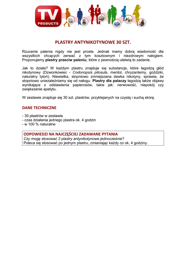 PLASTRY ANTYNIKOTYNOWE 30 SZT. Rzucenie palenia nigdy nie jest proste. Jednak mamy dobrą wiadomość dla wszystkich chcących zerwać z tym kosztownym i niezdrowym nałogiem. Proponujemy plastry przeciw paleniu, które z pewnością ułatwią to zadanie. Jak to działa? W każdym plastru znajduje się substancje, które łagodzą głód nikotynowy (Dzwonkowiec - Codonopsis pilosula, mentol, chryzantemy, goździki, naturalny tytoń). Niewielka, stopniowo zmniejszana dawka nikotyny, sprawia, że stopniowo uniezależniamy się od nałogu. Plastry dla palaczy łagodzą także objawy wynikające z odstawienia papierosów, takie jak: nerwowość, niepokój czy zwiększenie apetytu. W zestawie znajduje się 30 szt. plastrów, przyklejanych na czystą i suchą skórę. DANE TECHNICZNE - 30 plastrów w zestawie - czas działania jednego plastra ok. 4 godzin - w 100 % naturalne ODPOWIEDZI NA NAJCZĘŚCIEJ ZADAWANE PYTANIA Czy mogę stosować 2 plastry antynikotynowe jednocześnie? Poleca się stosować po jednym plastru, zmianiając każdy co ok. 4 godziny.