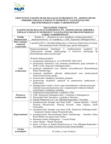 UROCZYSTE ZAKOŃCZENIE REALIZACJI PROJEKTU PN. „DOPOSAŻENIE OŚRODKA EDUKACYJNEGO W OSTROWCU NALEŻĄCEGO DO DRAWIEŃSKIEGO PARKU NARODOWEGO” Sprawozdanie z imprezy ZAKOŃCZENIE REALIZACJI PROJEKTU PN. „DOPOSAŻENIE OŚRODKA EDUKACYJNEGO W OSTROWCU NALEŻĄCEGO DO DRAWIEŃSKIEGO PARKU NARODOWEGO” Środek 4.2 – „Wsparcie na rzecz współpracy międzyregionalnej i Źródło międzynarodowej” we współpracy z LGR „Pojezierze Dobiegniewskie” finansowania Data i miejsce 4 grudzień 2013 r. Ośrodek Edukacyjny w Ostrowcu (Ostrowite) na terenie realizacji Drawieńskiego Parku Narodowego, gmina Dobiegniew wydarzenia Rozpowszechnienie informacji o zrealizowanym projekcie pt. „Doposażenie ośrodka edukacyjnego w Ostrowcu należącego do drawieńskiego parku narodowego”. Cele wydarzenia Partnerzy wydarzenia Reprezentanci Liczba uczestników Wartość dodana projektu: przekazanie informacji nt. osi 4 PO RYBY 2007-2013, przekazanie informacji oraz promocja działalności grup rybackich tj. NGR i LGR „Pojezierze Dobiegniewskie”, promocja działalności oraz walorów przyrodniczych Drawieńskiego Parku Narodowego, promocja projektów, głównie edukacyjnych oraz promocyjnych realizowanych przez grupy, promowanie współpracy pomiędzy grupami, promowanie projektów opartych na partnerstwie publicznym i społecznym, propagowanie wiedzy o lesie i jego mieszkańcach, ochronie przyrody, ochronie lasu przed pożarem oraz o organizmach wodnych (rybach) wśród dzieci i młodzieży szkolnej. 1. Nadnotecka Grupa Rybacka z siedzibą w Pile, 2. LGR „Pojezierze Dobiegniewskie” z siedzibą w Dobiegniewie, 3. Drawieński Park Narodowy z siedzibą w Drawnie, 4. Szkoła Podstawowa nr 3 im. Mikołaja Kopernika z Trzcianki. przedstawiciele Zarządu oraz biura NGR – Joanna Sanocka – Pertek, Grażyna Myszkowska, Patrycja Krystek, Anna Ligenza, Jacek Gawroński, przedstawiciele Zarządu oraz biura LGR „Pojezierze Dobiegniewskie” – Kazimierz Szmid, Joanna Wojciechowska, przedstawiciele Drawieńskiego Parku Narodowego – Dyrektor Parku Paweł Bilski oraz pracownicy Parku, Burmistrz Gminy Dobiegniew – Leszek Walch, sołtys Głuska – Marek Wardziak, dzieci z II klasy ze Szkoły Podstawowej nr 3 im. Mikołaja Kopernika z Trzcianki wraz z panią wychowawczynią Anną Gondek. 43 osoby, w tym 24 dzieci 1 Program wydarzenia Uroczyste przywitanie zaproszonych gości. Oficjalne zakończenie realizacji projektu poprzez podpisanie Protokołu wykonania Porozumienia o współpracy przez wszystkich partnerów projektu. Wystąpienia Partnerów Projektu: NGR, Lokalnej Grupy Rybackiej Pojezierze Dobiegniewskie oraz Drawieńskiego Parku Narodowego. Prezentacja Ośrodka Edukacyjnego w Ostrowcu wraz z elementami sfinansowanymi przez Lokalne Grupy Rybackie. Zajęcia edukacyjne prowadzone przez pracownika DPN z wykorzystaniem elementów sfinansowanych przez Lokalne Grupy Rybackie. Prelekcja nt. środowiska wodnego prowadzona przez przedstawiciela Drawieńskiego Parku Narodowego. Inscenizacja przygotowana przez dzieci z II klasy Szkoły Podstawowej nr 3 w Trzciance. Wręczenie symbolicznych upominków (gadżetów edukacyjnych) dla dzieci. Zakończenie uroczystości oraz poczęstunek. Opis wydarzenia Impreza odbyła się w dniu 4 grudnia 2013 r. w nowoutworzonym Ośrodku Edukacyjnym w Ostrowcu – stacji terenowej w Drawieńskim Parku Narodowym. Spotkanie sfinansowane zostało przez NGR, a przy jego organizacji uczestniczyły także: LGR „Pojezierze Dobiegniewskie”, a także Dyrekcja oraz pracownicy Drawieńskiego Parku Narodowego. Jego głównym celem było rozpowszechnienie informacji o projekcie współpracy, który zrealizowany został przez obie grupy rybackie ze środków pochodzących z Europejskiego Funduszu Rybackiego. W trakcie tego roku obu grupom, na mocy Umowy Współpracy zawartej w dniu 22 lutego 2013 r., udało się zrealizować wspólny projekt polegający na doposażeniu ośrodka edukacyjnego w Ostrowcu w pomoce edukacyjne i dydaktyczne oraz sprzęt komputerowy i RTV, niezbędne do prowadzenia zajęć z grupami dzieci oraz turystów na terenie obiektu. Projekt wart ok. 80 tys. zł objął następujące elementy: NGR sfinansowała zakup następujących elementów wyposażenia ośrodka edukacyjnego w DPN: meble (szafki, ławki, stół edukacyjny), materiały edukacyjne dla dzieci (tablice edukacyjne, leśne koło fortuny, zegary ścienne, puzzle, układanki, pieczęcie edukacyjne, tropy zwierząt), sprzęt komputerowy i RTV (projektor, pilot do projektora, uchwyt do projektora sufitowy, stolik pod projektor i komputer, laptop wraz z oprogramowaniem Windows oraz MS Office, wzmacniacz miksujący, głośniki, zestaw mikrofonów bezprzewodowych). „Pojezierze Dobiegniewskie” sfinansowała zakup następujących elementów wyposażenia ośrodka edukacyjnego w DPN: mikroskopy (mikroskop stereoskopowy, mikroskopy dla uczniów), pomoce dydaktyczne (zestaw do poławiania i oznaczania bezkręgowców, preparaty mikroskopowe, tacka do preparowania okazów, wodoszczelny tester ph + miernik temperatury, walizka Eko-badacza, pudełka z 2 lupami, szafka do preparatów mikroskopowych). 2 Impreza miała stanowić pewnego rodzaju uroczyste zakończenie projektu oraz oficjalne przekazanie Drawieńskiemu Parku Narodowemu wszystkich elementów sfinansowanych przez grupy. W wydarzeniu tym uczestniczyły również dzieci ze Szkoły Podstawowej z Trzcianki, należącej do obszaru NGR. Transport klasy sfinansowała grupa z Piły. NGR zadbała również o poczęstunek dla wszystkich uczestników spotkania. Dzieci otrzymały także szereg gadżetów edukacyjnych w postaci linijek, planów lekcji, kolorowanek o rybach. Element Podpisanie protokołu wykonania Porozumienia o współpracy przez programu wszystkich partnerów projektu. wydarzenia Oficjalnym wyrazem zakończenia projektu związanego z doposażeniem Ośrodka Edukacyjnego w Ostrowcu było podpisanie przez przedstawicieli partnerów projektu protok