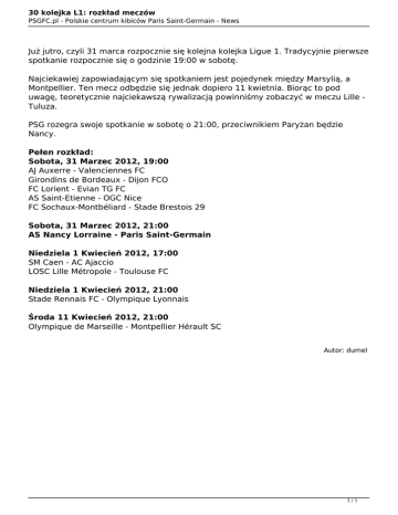 30 kolejka L1: rozkład meczów PSGFC.pl - Polskie centrum kibiców Paris Saint-Germain - News Już jutro, czyli 31 marca rozpocznie się kolejna kolejka Ligue 1. Tradycyjnie pierwsze spotkanie rozpocznie się o godzinie 19:00 w sobotę. Najciekawiej zapowiadającym się spotkaniem jest pojedynek między Marsylią, a Montpellier. Ten mecz odbędzie się jednak dopiero 11 kwietnia. Biorąc to pod uwagę, teoretycznie najciekawszą rywalizacją powinniśmy zobaczyć w meczu Lille Tuluza. PSG rozegra swoje spotkanie w sobotę o 21:00, przeciwnikiem Paryżan będzie Nancy. Pełen rozkład: Sobota, 31 Marzec 2012, 19:00 AJ Auxerre - Valenciennes FC Girondins de Bordeaux - Dijon FCO FC Lorient - Evian TG FC AS Saint-Etienne - OGC Nice FC Sochaux-Montbéliard - Stade Brestois 29 Sobota, 31 Marzec 2012, 21:00 AS Nancy Lorraine - Paris Saint-Germain Niedziela 1 Kwiecień 2012, 17:00 SM Caen - AC Ajaccio LOSC Lille Métropole - Toulouse FC Niedziela 1 Kwiecień 2012, 21:00 Stade Rennais FC - Olympique Lyonnais Środa 11 Kwiecień 2012, 21:00 Olympique de Marseille - Montpellier Hérault SC Autor: dumel 1/1 Powered by TCPDF (www.tcpdf.org)