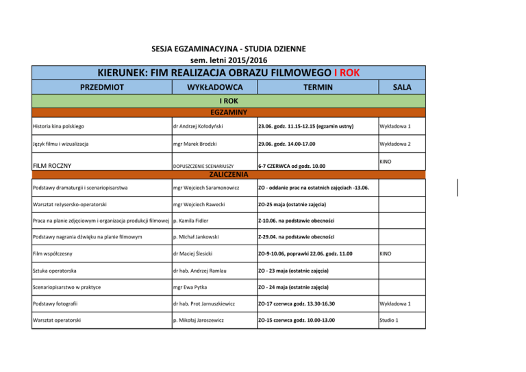 SESJA EGZAMINACYJNA - STUDIA DZIENNE sem. letni 2015/2016 KIERUNEK: FIM REALIZACJA OBRAZU FILMOWEGO I ROK PRZEDMIOT WYKŁADOWCA TERMIN SALA I ROK EGZAMINY Historia kina polskiego dr Andrzej Kołodyński 23.06. godz. 11.15-12.15 (egzamin ustny) Wykładowa 1 Język filmu i wizualizacja mgr Marek Brodzki 29.06. godz. 14.00-17.00 Wykładowa 2 FILM ROCZNY DOPUSZCZENIE SCENARIUSZY 6-7 CZERWCA od godz. 10.00 KINO ZALICZENIA Podstawy dramaturgii i scenariopisarstwa mgr Wojciech Saramonowicz ZO - oddanie prac na ostatnich zajęciach -13.06. Warsztat reżysersko-operatorski mgr Wojciech Rawecki ZO-25 maja (ostatnie zajęcia) Praca na planie zdjęciowym i organizacja produkcji filmowej p. Kamila Fidler Z-10.06. na podstawie obecności Podstawy nagrania dźwięku na planie filmowym p. Michał Jankowski Z-29.04. na podstawie obecności Film współczesny dr Maciej Ślesicki ZO-9-10.06, poprawki 22.06. godz. 11.00 Sztuka operatorska dr hab. Andrzej Ramlau ZO - 23 maja (ostatnie zajęcia) Scenariopisarstwo w praktyce mgr Ewa Pytka ZO - 24 maja (ostatnie zajęcia) Podstawy fotografii dr hab. Prot Jarnuszkiewicz ZO-17 czerwca godz. 13.30-16.30 Wykładowa 1 Warsztat operatorski p. Mikołaj Jaroszewicz ZO-15 czerwca godz. 10.00-13.00 Studio 1 KINO SESJA EGZAMINACYJNA sem. letnia 2015/2016 KIERUNEK: FIM REŻYSERIA FILMOWA I ROK PRZEDMIOT WYKŁADOWCA TERMIN SALA I ROK EGZAMINY Historia kina polskiego dr Andrzej Kołodyński 23.06. godz. 10.00-11.00 (egzamin ustny) Wykładowa 1 Język filmu i wizualizacja mgr Marek Brodzki 29.06. godz. 10.00-13.00 Wykładowa 2 FILM ROCZNY DOPUSZCZENIE SCENARIUSZY 6-7 CZERWCA od godz. 10.00 KINO ZALICZENIA Podstawy dramaturgii i scenariopisarstwa mgr Wojciech Saramonowicz ZO - oddanie prac na ostatnich zajęciach -13.06. Warsztat reżysersko-operatorski mgr Wojciech Rawecki ZO-24 maja (ostatnie zajęcia) Praca na planie zdjęciowym i organizacja produkcji filmowej p. Kamila Fidler Z-10.06. na podstawie obecności Podstawy nagrania dźwięku na planie filmowym p. Michał Jankowski Z-22.04. na podstawie obecności Film współczesny dr Maciej Ślesicki ZO-9-10.06, poprawki 22.06. godz. 11.00 Sztuka operatorska dr hab. Andrzej Ramlau ZO - 23 maja (ostatnie zajęcia) Scenariopisarstwo w praktyce mgr Ewa Pytka ZO - 24 maja (ostatnie zajęcia) Podstawy fotografii dr hab. Prot Jarnuszkiewicz ZO-17 czerwca godz. 13.30-16.30 KINO Wykładowa 1
