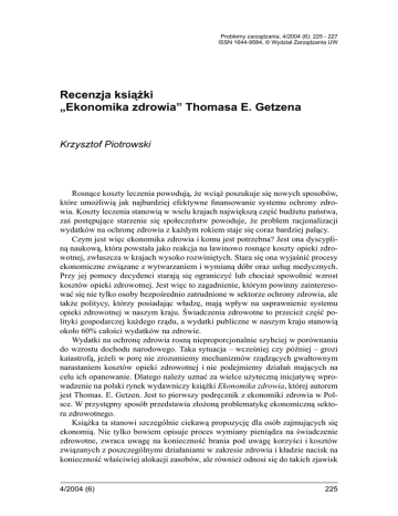 Problemy zarządzania, 4/2004 (6): 225 - 227 ISSN 1644-9584, © Wydział Zarządzania UW Recenzja książki „Ekonomika zdrowia” Thomasa E. Getzena Krzysztof Piotrowski Rosnące koszty leczenia powodują, że wciąż poszukuje się nowych sposobów, które umożliwią jak najbardziej efektywne finansowanie systemu ochrony zdrowia. Koszty leczenia stanowią w wielu krajach największą część budżetu państwa, zaś postępujące starzenie się społeczeństw powoduje, że problem racjonalizacji wydatków na ochronę zdrowia z każdym rokiem staje się coraz bardziej palący. Czym jest więc ekonomika zdrowia i komu jest potrzebna? Jest ona dyscypliną naukową, która powstała jako reakcja na lawinowo rosnące koszty opieki zdrowotnej, zwłaszcza w krajach wysoko rozwiniętych. Stara się ona wyjaśnić procesy ekonomiczne związane z wytwarzaniem i wymianą dóbr oraz usług medycznych. Przy jej pomocy decydenci starają się ograniczyć lub chociaż spowolnić wzrost kosztów opieki zdrowotnej. Jest więc to zagadnienie, którym powinny zainteresować się nie tylko osoby bezpośrednio zatrudnione w sektorze ochrony zdrowia, ale także politycy, którzy posiadając władzę, mają wpływ na usprawnienie systemu opieki zdrowotnej w naszym kraju. Świadczenia zdrowotne to przecież część polityki gospodarczej każdego rządu, a wydatki publiczne w naszym kraju stanowią około 60% całości wydatków na zdrowie. Wydatki na ochronę zdrowia rosną nieproporcjonalnie szybciej w porównaniu do wzrostu dochodu narodowego. Taka sytuacja – wcześniej czy później – grozi katastrofą, jeżeli w porę nie zrozumiemy mechanizmów rządzących gwałtownym narastaniem kosztów opieki zdrowotnej i nie podejmiemy działań mających na celu ich opanowanie. Dlatego należy uznać za wielce użyteczną inicjatywę wprowadzenie na polski rynek wydawniczy książki Ekonomika zdrowia, której autorem jest Thomas. E. Getzen. Jest to pierwszy podręcznik z ekonomiki zdrowia w Polsce. W przystępny sposób przedstawia złożoną problematykę ekonomiczną sektora zdrowotnego. Książka ta stanowi szczególnie ciekawą propozycję dla osób zajmujących się ekonomią. Nie tylko bowiem opisuje proces wymiany pieniądza na świadczenie zdrowotne, zwraca uwagę na konieczność brania pod uwagę korzyści i kosztów związanych z poszczególnymi działaniami w zakresie zdrowia i kładzie nacisk na konieczność właściwiej alokacji zasobów, ale również odnosi się do takich zjawisk 4/2004 (6) 225 Krzysztof Piotrowski jak asymetria informacji, niepewność, sądy wartościujące czy przenikanie wymiaru moralnego z wymiarem ekonomicznym. Podręcznik można podzielić na dwie części. Pierwsza przedstawia problematykę ekonomiki zdrowia z perspektywy mikroekonomicznej. Opisuje organizację systemu opieki zdrowotnej w ujęciu przepływu środków. Nie bez znaczenia jest podtytuł podręcznika w języku angielskim: Fundamentals and Flow of Fund. Autor pragnie podkreślić w swoim opracowaniu, iż dla zrozumienia reguł kierujących ekonomiką zdrowia niezbędne jest zrozumienie przepływu pieniędzy w całym systemie opieki zdrowotnej. Wyjaśnia zasady działania, mechanizmy finansowania i motywy, które kierują zachowaniem poszczególnych podmiotów działających w sektorze zdrowia: pacjentów, dostawców usług, rządu, płatników i ubezpieczycieli. Oferuje możliwość zbadania okrężnego przepływu środków pieniężnych w obrębie systemu opieki zdrowotnej. Kieruje także naszą uwagę na rosnące – wraz z powiększaniem się liczby osób starszych – znaczenie opieki długoterminowej. W obrębie części mikroekonomicznej książki na szczególną uwagę zasługuje fragment, który porusza zagadnienia z zakresu farmakoekonomiki – dyscypliny będącej częścią ekonomiki zdrowia. Autor wskazuje, jak przeprowadzać analizę kosztów i korzyści przy ocenie poszczególnych programów zdrowotnych. Odnosi się do relacji między leczeniem a kosztem leczenia. Znajomość tych zagadnień pozwala nie tylko ocenić efektywność określonych terapii i procedur medycznych w wymiarze finansowym, ale także umożliwia ich bezpośrednie porównanie ze sobą. Wiedza ta daje do ręki decydentów zajmujących się ochroną zdrowia niezbędne narzędzia do prowadzenia odpowiedzialnej i efektywnej polityki zdrowotnej. W drugiej części podręcznika autor stara się spojrzeć z szerszej perspektywy na wzajemne relacje zachodzące między poszczególnymi podmiotami systemu – prezentuje zagadnienia ekonomiki zdrowa w ujęciu makroekonomicznym. Określa czynniki wpływające na całkowite wydatki na ochronę zdrowia. Zajmuje się z jednej strony aspektem ekonomicznym zdrowia – wydatkami, zatrudnieniem, cenami w systemie opieki zdrowotnej – z drugiej strony opisuje związek, jaki występuje między stanem zdrowia danej populacji a zjawiskami ekonomicznymi. Porównuje również wydatki na opiekę zdrowotną w różnych państwach i prezentuje przykłady systemów opieki zdrowotnej z kilku krajów. Stara się odpowiedzieć na pytanie, w jaki sposób połączyć regulacje państwa z konkurencją rynkową, aby zapewnić możliwie najefektywniejszą alokację zasobów. Szczególną rolę przypisuje państwu, które reguluje rynek świadczeń zdrowotnych i zajmuje się redystrybucją środków. Stąd też omawianą książkę można szczególnie polecić urzędnikom działającym w szeroko rozumianej opiece zdrowotnej, jak i politykom, którzy wpływają na zasady funkcjonowania państwa. Dużą zaletą podręcznika jest jego przejrzysta struktura, znacznie ułatwiająca przyswojenie zawartych w nim treści. Rozdziały zaczynają się od pytań stawianych przez autora, na które czytelnik może poszukiwać odpowiedzi wewnątrz rozdziału podzielonego na kilka podrozdziałów. Na końcu poszczególnych rozdziałów znajdują się: spis lektur sugerowanych osobom chcącym pogłębić swoją wiedzę z oma