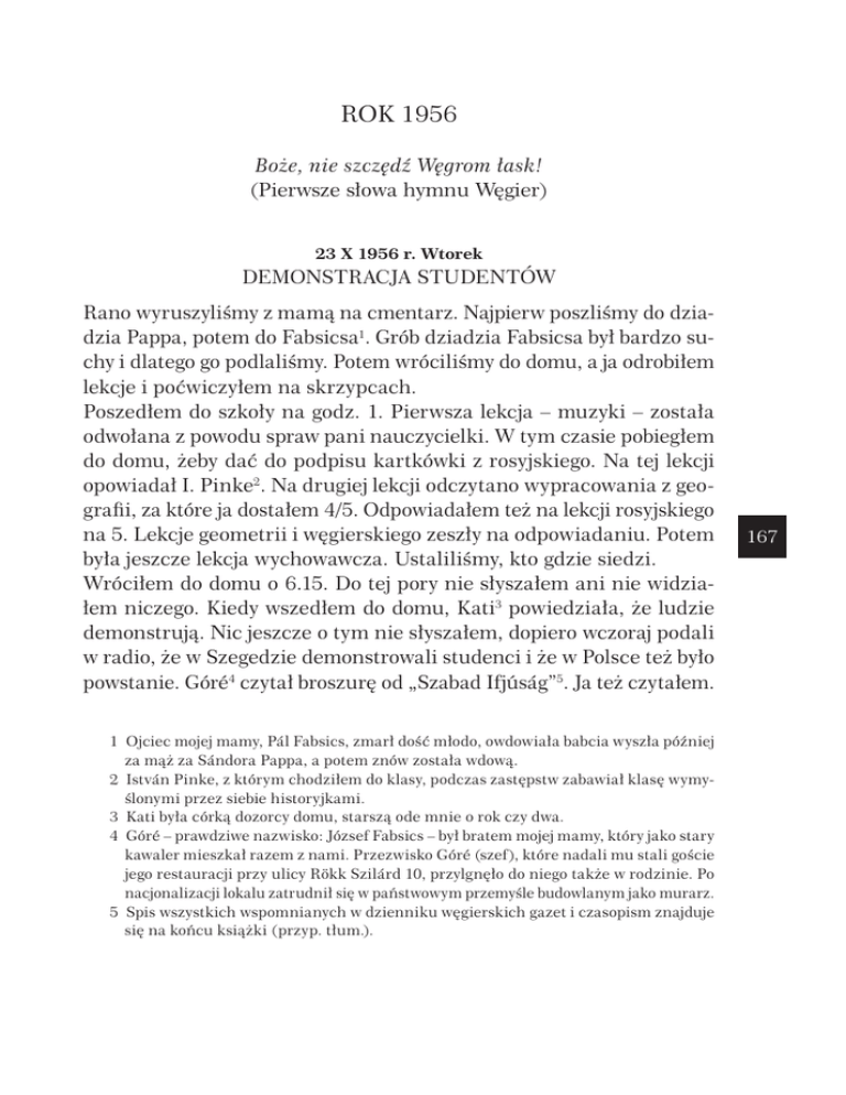 ROK 1956 Boże, nie szczędź Węgrom łask! (Pierwsze słowa hymnu Węgier) 23 X 1956 r. Wtorek DEMONSTRACJA STUDENTÓW Rano wyruszyliśmy z mamą na cmentarz. Najpierw poszliśmy do dziadzia Pappa, potem do Fabsicsa1. Grób dziadzia Fabsicsa był bardzo suchy i dlatego go podlaliśmy. Potem wróciliśmy do domu, a ja odrobiłem lekcje i poćwiczyłem na skrzypcach. Poszedłem do szkoły na godz. 1. Pierwsza lekcja – muzyki – została odwołana z powodu spraw pani nauczycielki. W tym czasie pobiegłem do domu, żeby dać do podpisu kartkówki z rosyjskiego. Na tej lekcji opowiadał I. Pinke2. Na drugiej lekcji odczytano wypracowania z geografii, za które ja dostałem 4/5. Odpowiadałem też na lekcji rosyjskiego na 5. Lekcje geometrii i węgierskiego zeszły na odpowiadaniu. Potem była jeszcze lekcja wychowawcza. Ustaliliśmy, kto gdzie siedzi. Wróciłem do domu o 6.15. Do tej pory nie słyszałem ani nie widziałem niczego. Kiedy wszedłem do domu, Kati3 powiedziała, że ludzie demonstrują. Nic jeszcze o tym nie słyszałem, dopiero wczoraj podali w radio, że w Szegedzie demonstrowali studenci i że w Polsce też było powstanie. Góré4 czytał broszurę od „Szabad Ifjúság”5. Ja też czytałem. 1 Ojciec mojej mamy, Pál Fabsics, zmarł dość młodo, owdowiała babcia wyszła później za mąż za Sándora Pappa, a potem znów została wdową. 2 István Pinke, z którym chodziłem do klasy, podczas zastępstw zabawiał klasę wymyślonymi przez siebie historyjkami. 3 Kati była córką dozorcy domu, starszą ode mnie o rok czy dwa. 4 Góré – prawdziwe nazwisko: József Fabsics – był bratem mojej mamy, który jako stary kawaler mieszkał razem z nami. Przezwisko Góré (szef), które nadali mu stali goście jego restauracji przy ulicy Rökk Szilárd 10, przylgnęło do niego także w rodzinie. Po nacjonalizacji lokalu zatrudnił się w państwowym przemyśle budowlanym jako murarz. 5 Spis wszystkich wspomnianych w dzienniku węgierskich gazet i czasopism znajduje się na końcu książki (przyp. tłum.). 167 Mówiła o demonstracji studentów. Kiedy wyszedłem na ulicę, widziałem, jak przy Corvinie trzy wielkie ciężarówki wiozły studentów. Na dachu samochodu stał jakiś chłopak i krzyczał wraz z innymi: „Ruscy do domu! Dość mamy kliki Rákosiego! Już ociągać się nie godzi, niech nam Imre Nagy przewodzi!”. Potem odprowadziłem Maję6 na religię, bo bała się iść sama. W drodze powrotnej spotkaliśmy się z demonstrującym tłumem, który zatrzymał się przy ulicy Népszínház i odśpiewał Hymn. Wieczorem wysłuchaliśmy przemowy Ernő Gerő. W tym czasie Góré był przed studio7. Położyłem się o godz. 9. W łóżku jeszcze słyszałem, jak krzyczą: „Obalimy pomnik Stalina! Precz z Gerő!”. ILUSTRACJA S. 30 24 X 1956 r. Środa WYBUCHŁA REWOLUCJA 168 Rano byłem na nogach już o godz. 6. Zbudziło mnie huczenie i dudnienie. Szybko wstałem, ubrałem się i wybiegłem na ulicę. Na ulicy była wielka mgła, nie widać było nawet placu Gutenberga. Wielu mówiło, że to sztuczna mgła. Nie widziałem, ale od strony placu Gutenberga słyszałem trzask broni. W bramie Mari8 powiedziała, że nocą na piętrze nikt nie spał, bo w siedzibie „Szabad Nép” wybito wszystkie okna, podpalono dwa samochody, słowem, zrobiono wielki rejwach. Pracownicy murarscy, którzy remontowali budynek, też tu zaszli i „techniczny Ilmaros” powiedział, że całą noc nie spał i był tu, na ulicy Békés. Opowiadał, że na całej ulicy było ciemno i studenci walczyli przeciwko awoszom, czołgając się przy ścianach. Potem poszedłem do Jancsiego9. Pokazał ulotkę i dał mi jedną. 6 Siostra autora (przyp. red.). 7 Siedziba Węgierskiego Radia przy ulicy Bródy Sándor (przyp. tłum.). 8 Na drugim piętrze w jednopokojowym mieszkaniu mieszkali państwo Radics. Ich córka, Mari, rówieśniczka mojej dziesięcioletniej młodszej siostry, była stałym towarzyszem naszych zabaw. 9 Jancsi – János Kovács – był moim przyjacielem z dzieciństwa. Mieszkał również przy ulicy Rökk Szilárd 10, na parterze. Jego rodzice, po upaństwowieniu należącego do Powiedział, że nauczyciel, pan Moór10, podyktował im 14 punktów. Ja też je spisałem, jednak on sam miał niepełną listę (patrz str. 6). 1. ................ 2. Rząd ma się przekształcić pod przewodnictwem Imre Nagya. 3. Stosunki rosyjsko-jugosłowiańskie. X. Mają przestać zakłócać radio. X. Wolność prasy. X. Nowe mundury dla naszych żołnierzy. X. W pełni jawne postępowanie sądowe w sprawie M. Farkasa. X. Przywrócenie dawnego herbu Kossutha. X. Całkowita wolność opinii i prasy. X. Obalenie pomnika Stalina. X. Pełna wzajemna solidarność. ILUSTRACJA S. 32 W domu u Jancsiego było sześciu milicjantów, którzy uciekli tam nocą przed powstańcami. Rząd sam w nich nie wierzył, bo co prawda z bronią, ale bez naboi wysłał ich do obrony „Szabad Nép”. O godz. 10 mgła częściowo się rozwiała i widziałem, że na ulicy powstańcy noszą już broń. Pani Kovács powiedziała mamie, że Jancsi pisze dziennik. Wtedy ja też zacząłem pisać dziennik. Potem pan Bicskei11 opowiedział, co się wydarzyło wczoraj. Powiedział, że tłum domagał się, żeby 14 punktów wydrukowano w gazecie. Dziennikarze to obiecali, ale ludzie chcieli podać je też przez radio, na co sekretarz partii powiedział, żeby spokojnie szli do radia. Jednak awosze nie wpuścili ich do studia. Wtedy poprosił o to awoszów pewien węgierski pułkownik oddziałów pancernych, ale oni go zastrzelili. Na to pancerni wygonili awoszów na strych. Lud wniósł pułkownika do „Szabad Nép” i położono go na biurku sekretarza partii. Potem przyszedł pan Radics i powiedział, że nich mieszczącego się w naszym budynku sklepu kolonialnego, zatrudnili się w handlu państwowym (sklepy samoobsługowe KÖZÉRT). 10 Lajos Moór był moim nauczycielem historii i ojcem Marianny Moór, pó