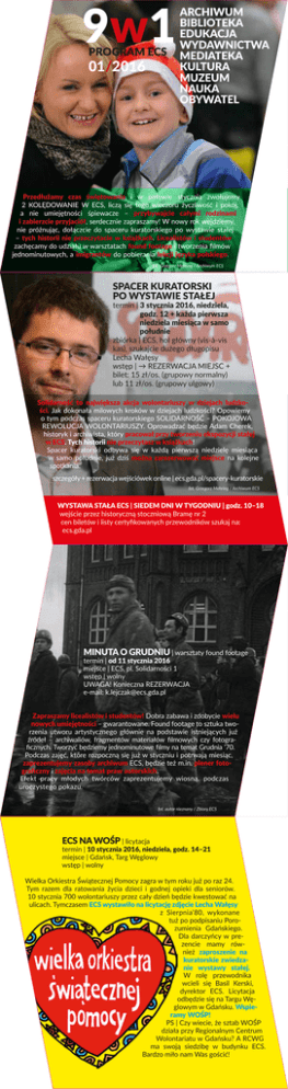 9w1 PROGRAM ECS 01/2016 ARCHIWUM BIBLIOTEKA EDUKACJA WYDAWNICTWA MEDIATEKA KULTURA MUZEUM NAUKA OBYWATEL Przedłużamy czas świętowania i w połowie stycznia zwołujemy 2 KOLĘDOWANIE W ECS, liczą się tego wieczoru życzliwość i pokój, a nie umiejętności śpiewacze – przybywajcie całymi rodzinami i zabierzcie przyjaciół, serdecznie zapraszamy! W nowy rok wejdziemy, nie próżnując, dołączcie do spaceru kuratorskiego po wystawie stałej – tych historii nie przeczytacie w książkach. Licealistów i studentów zachęcamy do udziału w warsztatach found footage i tworzenia filmów jednominutowych, a imigrantów do pobierania lekcji języka polskiego. fot. Grzegorz Mehring / Archiwum ECS SPACER KURATORSKI PO WYSTAWIE STAŁEJ termin | 3 stycznia 2016, niedziela, godz. 12 + każda pierwsza niedziela miesiąca w samo południe zbiórka | ECS, hol główny (vis-à-vis kas), szukajcie dużego długopisu Lecha Wałęsy wstęp | → REZERWACJA MIEJSC + bilet: 15 zł/os. (grupowy normalny) lub 11 zł/os. (grupowy ulgowy) Solidarność to największa akcja wolontariuszy w dziejach ludzkości. Jak dokonała milowych kroków w dziejach ludzkości? Opowiemy o tym podczas spaceru kuratorskiego SOLIDARNOŚĆ – POKOJOWA REWOLUCJA WOLONTARIUSZY. Oprowadzać będzie Adam Cherek, historyk i archiwista, który pracował przy tworzeniu ekspozycji stałej w ECS. Tych historii nie przeczytasz w książkach! Spacer kuratorski odbywa się w każdą pierwszą niedzielę miesiąca w samo południe, już dziś można zarezerwować miejsce na kolejne spotkania. szczegóły + rezerwacja wejściówek online | ecs.gda.pl/spacery-kuratorskie fot. Grzegorz Mehring / Archiwum ECS WYSTAWA STAŁA ECS | SIEDEM DNI W TYGODNIU | godz. 10–18 wejście przez historyczną stoczniową Bramę nr 2 cen biletów i listy certyfikowanych przewodników szukaj na: ecs.gda.pl MINUTA O GRUDNIU | warsztaty found footage termin | od 11 stycznia 2016 miejsce | ECS, pl. Solidarności 1 wstęp | wolny UWAGA! Konieczna REZERWACJA e-mail: [email protected] Zapraszamy licealistów i studentów! Dobra zabawa i zdobycie wielu nowych umiejętności – gwarantowane. Found footage to sztuka tworzenia utworu artystycznego głównie na podstawie istniejących już źródeł – archiwaliów, fragmentów materiałów filmowych czy fotograficznych. Tworzyć będziemy jednominutowe filmy na temat Grudnia ’70. Podczas zajęć, które rozpoczną się już w styczniu i potrwają miesiąc, zaprezentujemy zasoby archiwum ECS, będzie też m.in. plener fotograficzny i zajęcia na temat praw autorskich. Efekt pracy młodych twórców zaprezentujemy wiosną, podczas uroczystego pokazu. fot. autor nieznany / Zbiory ECS ECS NA WOŚP | licytacja termin | 10 stycznia 2016, niedziela, godz. 14–21 miejsce | Gdańsk, Targ Węglowy wstęp | wolny Wielka Orkiestra Świątecznej Pomocy zagra w tym roku już po raz 24. Tym razem dla ratowania życia dzieci i godnej opieki dla seniorów. 10 stycznia 700 wolontariuszy przez cały dzień będzie kwestować na ulicach. Tymczasem ECS wystawiło na licytację zdjęcie Lecha Wałęsy z Sierpnia’80, wykonane tuż po podpisaniu Porozumienia Gdańskiego. Dla darczyńcy w prezencie mamy również zaproszenie na kuratorskie zwiedzanie wystawy stałej. W rolę przewodnika wcieli się Basil Kerski, dyrektor ECS. Licytacja odbędzie się na Targu Węglowym w Gdańsku. Wspieramy WOŚP! PS | Czy wiecie, że sztab WOŚP działa przy Regionalnym Centrum Wolontariatu w Gdańsku? A RCWG ma swoją siedzibę w budynku ECS. Bardzo miło nam Was gościć! 2 KOLĘDOWANIE W ECS termin | 16 stycznia 2016, sobota, godz. 18 miejsce | ECS, pl. Solidarności 1, ogród zimowy wstęp | REZERWACJA MIEJSC od 4 stycznia 2016 do wyczerpania wejściówek ▪ online: ecs.gda.pl/koledowanie ▪ telefonicznie: tel.: 58 772 40 00 | poniedziałek – piątek, godz. 9–15 Przedłużamy czas świętowania. Niech trwa zwyczaj wspólnego kolędowania w ogrodzie zimowym ECS. Przybywajcie całymi rodzinami, ze znajomymi i przyjaciółmi. Ubiegłoroczne doświadczenie dowiodło, że umiejętności śpiewacze to całkowicie nieistotny szczegół. Wspólnota niesie pieśń. Tego wieczoru najważniejsze jest, żeby być ze sobą w pokoju i życzliwości. fot. Grzegorz Mehring / Archiwum ECS GDAŃSKI DZIEŃ PROGRAMU ERASMUS+ | konferencja termin | 28 stycznia 2016, czwartek, godz. 9 miejsce | ECS, pl. Solidarności 1 wstęp | REJESTRACJA → erasmusplus.ankietka.pl Erasmus+ to program Unii Europejskiej na rzecz edukacji, szkoleń, młodzieży i sportu. W ECS spotkają się uczestnicy programu, jego koordynatorzy oraz wszyscy zainteresowani tematem. Będzie czas na podsumowania i snucie planów. Dowiedzieć się będzie można, jak z programu można skorzystać oraz jakie naukowe i zawodowe szanse daje Erasmus+. Gdański Dzień Programu Erasmus+ organizowany jest po raz pierwszy. organizator | Stowarzyszenie Morena WOKÓŁ GRUDNIA ’70 | wystawy czasowe termin | do 30 kwietnia 2016 , godz. 10–18 miejsce | ECS, pl. Solidarności 1 wstęp | wolny / UKRYTE / WYPOWIEDZIANE / PRZYPOMNIANE | Galeria Trap (ogród zimowy) GALERIA JEDNEGO OBIEKTU | Galeria Mesa w Museum Store (parter) TRZY KRZYŻE | Galeria Świetlik (ogród zimowy) Trzy wystawy zadedykowano masakrze w Grudniu ’70, jakiej na robotnikach dopuściła się władza. Przywołujemy tamte wydarzenia, ich obraz w tryptyku filmowym Andrzeja Wajdy i ikoniczne ujęcie na plakacie Andrzeja Pągowskiego, a także budowę pomnika Poległych Stoczniowców 1970 w Gdańsku. W tym roku obchodziliśmy dwie rocznice: 45 – masakry na Wybrzeżu i 35 – odsłonięcia pomnika Poległych Stoczniowców 1970 w Gdańsku. fot. Grzegorz Mehring / Archiwum ECS KLUB OBCOKRAJOWCA | o polskim języku i polskiej kulturze w ECS termin | każdy poniedziałek, wtorek, środa, godz. 17 miejsce | ECS, pl. Solidarności 1, biblioteka wstęp | wolny Imigranci z Trójmiasta pobierają bezpłatne lekcje języka polskiego (wtorki i 