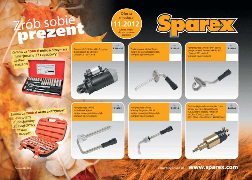 e i b o s b Zró ent prez tto a otrzymasz Zamów za 1500 zł ne ciowy funkcjonalny 23 częś zestaw narzędzi HIT Rozrusznik 12 V, bendiks 9 zębów, 3 KW pasuje do silników Deutz FL.912 i FL.913 Oferta miesiàca 11.2012 Oferta wa˝na do wyczerpania zapasów Nr S.35980-1 Podgrzewacz silnika Deutz pasuję do większości modeli, komplet z przewodami Nr S.36930 Podgrzewacz silnika Fendt 550 W pasuje do serii Farmer 304 do 312 i Faworit 611 do 615, komplet z przewodami Nr S.36905 CENOWY masz zł netto a otrzy 0 0 0 2 za w ó Zam estetyczny Podgrzewacz silnika John Deere 750 W pasuje do większości modeli, komplet z przewodami Nr S.36902 Podgrzewacz silnika Massey Ferguson 750 W pasuje do większości modeli, komplet z przewodami Nr S.36910 Elektromagnes do rozusznika Lucas pasuje do: Case, New Holland, JCB, Landini, Massey Ferguson Nr OEM 77010, 3206518R2, 83912208, 1094197M91, 1889779M1 Nr S.41146 i funkcjonalny 25 częściowy zestaw narzędzi Ceny netto PLN Zamawiaj online na www.sparex.com Oferta miesiàca 11.2012 Oferta wa˝na do wyczerpania zapasów Elektromagnes do rozrusznika Lucas pasuje do: New Holland, Massey Ferguson Nr OEM TPB111, 83960406, 1897313M91, 3474587M1 Szczotki do rozrusznika Lucas pasują: do Case, JCB, Massey Ferguson Nr OEM TAB118, 3118371R91, 1094189M91, 1810576M91 Ceny netto PLN Nr S.65684 Nr S.41154 Elektromagnes do rozrusznika Lucas pasuje do: Case, Massey Ferguson Nr OEM 60933114, 2779049R1, 3473296M91 Szczotki do rozrusznika Lucas pasują: Case, JCB, New Hollad, Massey Ferguson Nr S.41759 Odwiedź nasz nowy sklep internetowy www.sparex.com Promocje Elektromagnes do rozrusznika Bosch pasuje do: John Deere, JCB Nr OEM 0331402001, 0331402004, AL113664, AL117012 Nr S.41153 Nowości Nr S.36121 Nr S.23988 Lampa Robocza LED 12/24 V, 9 ledowa Dla wszystkich zamówień online powyżej 1500 zł netto transport gratis Części ciągnikowe Części maszyn Elektromagnes do rozrusznika Bosch pasuje do: Deutz, John Dere, JCB Nr OEM 0331402002, 0331402003, 01307762 Zestaw lamp tylnych z regulacją szerokości z 7 metrowym przewodem łączącym Nr S.36123 Nr S.5974 Oferta miesiàca 11.2012 Oferta wa˝na do wyczerpania zapasów Prostownik/ładowarka nowej generacji o wysokiej częstotliwości ładowania, posiada funkcję odsiarczania Nr S.31325 Prostownik/ładowarka nowej generacji o wysokiej częstotliwości ładowania, posiada funkcję odsiarczania Dla wszystkich zamówień online powyżej 1500 zł netto transport gratis www.sparex.com Promocje Nowości Części ciągnikowe Nr S.24145 Prostownik automatyczny 6/12 V z rozruchem Części maszyn Nr S.24146 Prostownik automatyczny 12/24 V z rozruchem DANE TECHNICZNE: Zasilanie: 220–240 V, 50/60 Hz Napięcie nominalne: 12 V/24 V DC Napięcie ładowania: 14,4–14,7 V; 28,8–29,4 V; BOOST 16 V 1,5A Natężenie ładowania: 0,8–7 A System zabezpieczenia: IP65 Ładuje akumulatory: kwasowe, AGM, żelowe, MF, VRLA Zakresy ładowania: akumulatory 12 V 14 Ah do 230 Ah, akumulatory 24 V 14 Ah do 120 Ah DANE TECHNICZNE: Zasilanie: 220–240 V 50/60 Hz Napięcie nominalne: 12 V DC Napięcie ładowania: 14,4–14,7 V Natężenie ładowania: 08–3,6 A System zabezpieczenia: IP65 Ładuje: kwasowe, AGM, żelowe, MF, VRLA Zakres ładowania: akumulatory 1,2 Ah do 120 Ah Nr S.24148 Tester akumulatorów 6/12 V – 100 Amp Nr S.31326 Odwiedź nasz nowy sklep internetowy Nr S.3147 Wyłącznik masy 100 Amp Nr S.12764 Wyłącznik masy 700 Amp Zamawiaj online na Zawór odcinający do pompy wtryskowej pasuje do: Case, Fendt Nr OEM 0330001041, A77753, F816201710020 Nr S.57373 www.sparex.com Oferta miesiàca Doradztwo techniczne i pomoc w doborze części zamiennych pod specjalnym numerem telefonu 11.2012 Zacisk elektryczny (krokodyl) 180 Amp do przewodów rozruchowych lub urządzeń prostowniczych Ceny netto PLN Nr S.57427 Nr S.4400 A ul. Ogrodnicza 13, Janikowo k/ Poznania, 62-006 Kobylnica F +48 61 816 29 22 T +48 61 816 17 27, 816 19 37 Oferta wa˝na do wyczerpania zapasów 663 760 390 Zawór odcinający do pompy wtryskowej pasuje do: New Holland, John Deere Nr OEM 7185900W, 83981012, RE22744, RE54064 Sparex Polska Sp. z o.o. Zawór odcinający do pompy wtryskowej pasuje do: Fiat, New Holland Nr OEM 7167620A, 9986316, 83981012 Zacisk elektryczny (krokodyl) 180 Amp do przewodów rozruchowych lub urządzeń prostowniczych Nr S.62711 Nr S.4399 Pompka ręczna do beczki zastosowanie do większości płynów oprócz rozpuszczalników i kwasów Zacisk elektryczny (krokodyl) 40 Amp do urządzeń prostowniczych Nr S.18916 Nr S.50038 Zamawiaj online na Pompka ręczna zastosowanie do większości płynów oprócz rozpuszczalników i kwasów Zacisk elektryczny (krokodyl) 40 Amp do urządzeń prostowniczych Nr S.18919 Nr S.50039 www.sparex.com
