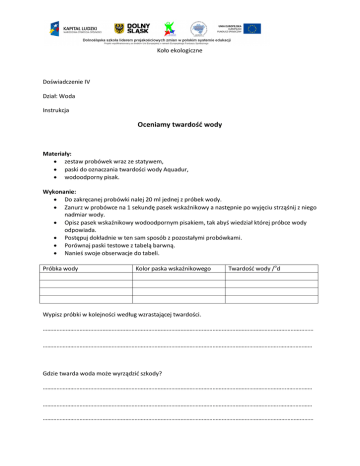 Koło ekologiczne Doświadczenie IV Dział: Woda Instrukcja Oceniamy twardość wody Materiały: · zestaw probówek wraz ze statywem, · paski do oznaczania twardości wody Aquadur, · wodoodporny pisak. Wykonanie: · Do zakręcanej probówki nalej 20 ml jednej z próbek wody. · Zanurz w probówce na 1 sekundę pasek wskaźnikowy a następnie po wyjęciu strząśnij z niego nadmiar wody. · Opisz pasek wskaźnikowy wodoodpornym pisakiem, tak abyś wiedział której próbce wody odpowiada. · Postępuj dokładnie w ten sam sposób z pozostałymi probówkami. · Porównaj paski testowe z tabelą barwną. · Nanieś swoje obserwacje do tabeli. Próbka wody Kolor paska wskaźnikowego Twardość wody /od Wypisz próbki w kolejności według wzrastającej twardości. …………………………………………………………………………………………………………………………………………………………… ………………………………………………………………………………………………………………………………………..………………… Gdzie twarda woda może wyrządzić szkody? …………………………………………………………………………………………………………………………………………..……………… ………………………………………………………………………………………………………………………………………..………………… ……………………………………………………………………………………………………………………………………………………………