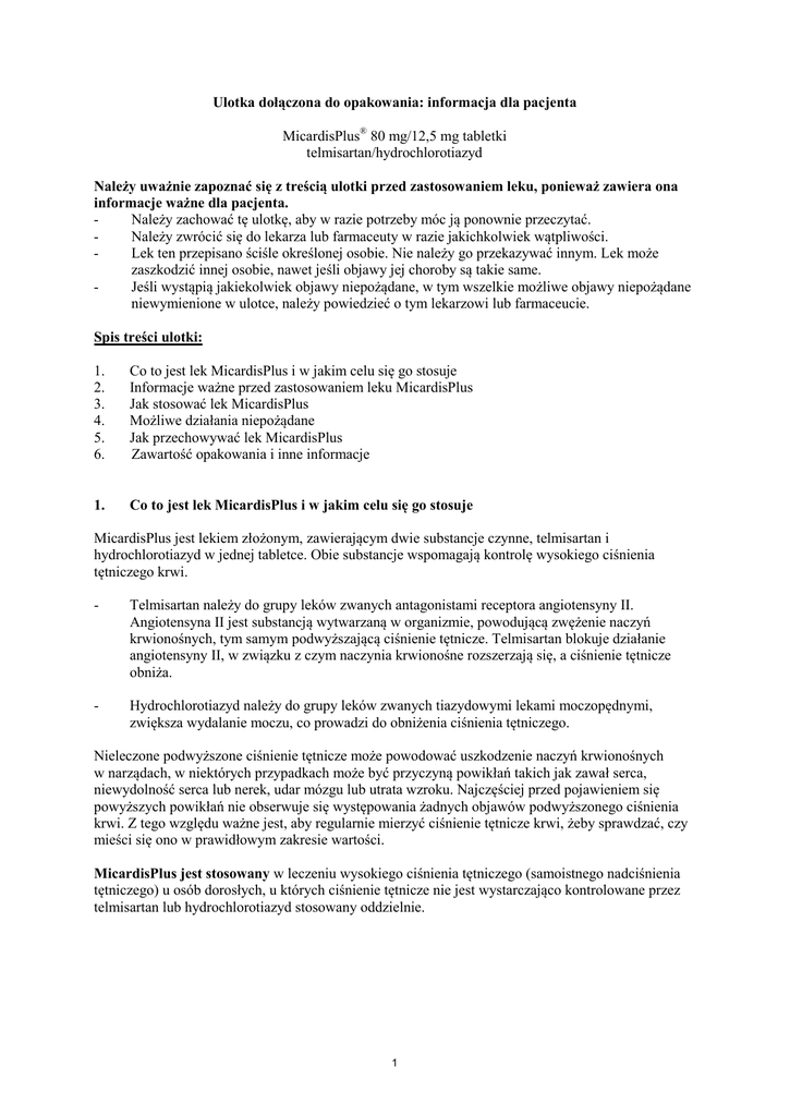 Ulotka dołączona do opakowania: informacja dla pacjenta MicardisPlus® 80 mg/12,5 mg tabletki telmisartan/hydrochlorotiazyd Należy uważnie zapoznać się z treścią ulotki przed zastosowaniem leku, ponieważ zawiera ona informacje ważne dla pacjenta. Należy zachować tę ulotkę, aby w razie potrzeby móc ją ponownie przeczytać. Należy zwrócić się do lekarza lub farmaceuty w razie jakichkolwiek wątpliwości. Lek ten przepisano ściśle określonej osobie. Nie należy go przekazywać innym. Lek może zaszkodzić innej osobie, nawet jeśli objawy jej choroby są takie same. Jeśli wystąpią jakiekolwiek objawy niepożądane, w tym wszelkie możliwe objawy niepożądane niewymienione w ulotce, należy powiedzieć o tym lekarzowi lub farmaceucie. Spis treści ulotki: 1. 2. 3. 4. 5. 6. Co to jest lek MicardisPlus i w jakim celu się go stosuje Informacje ważne przed zastosowaniem leku MicardisPlus Jak stosować lek MicardisPlus Możliwe działania niepożądane Jak przechowywać lek MicardisPlus Zawartość opakowania i inne informacje 1. Co to jest lek MicardisPlus i w jakim celu się go stosuje MicardisPlus jest lekiem złożonym, zawierającym dwie substancje czynne, telmisartan i hydrochlorotiazyd w jednej tabletce. Obie substancje wspomagają kontrolę wysokiego ciśnienia tętniczego krwi. - Telmisartan należy do grupy leków zwanych antagonistami receptora angiotensyny II. Angiotensyna II jest substancją wytwarzaną w organizmie, powodującą zwężenie naczyń krwionośnych, tym samym podwyższającą ciśnienie tętnicze. Telmisartan blokuje działanie angiotensyny II, w związku z czym naczynia krwionośne rozszerzają się, a ciśnienie tętnicze obniża. - Hydrochlorotiazyd należy do grupy leków zwanych tiazydowymi lekami moczopędnymi, zwiększa wydalanie moczu, co prowadzi do obniżenia ciśnienia tętniczego. Nieleczone podwyższone ciśnienie tętnicze może powodować uszkodzenie naczyń krwionośnych w narządach, w niektórych przypadkach może być przyczyną powikłań takich jak zawał serca, niewydolność serca lub nerek, udar mózgu lub utrata wzroku. Najczęściej przed pojawieniem się powyższych powikłań nie obserwuje się występowania żadnych objawów podwyższonego ciśnienia krwi. Z tego względu ważne jest, aby regularnie mierzyć ciśnienie tętnicze krwi, żeby sprawdzać, czy mieści się ono w prawidłowym zakresie wartości. MicardisPlus jest stosowany w leczeniu wysokiego ciśnienia tętniczego (samoistnego nadciśnienia tętniczego) u osób dorosłych, u których ciśnienie tętnicze nie jest wystarczająco kontrolowane przez telmisartan lub hydrochlorotiazyd stosowany oddzielnie. 1 2. Informacje ważne przed zastosowaniem leku MicardisPlus Kiedy nie stosować leku MicardisPlus • • • • • • • jeśli pacjent ma uczulenie (nadwrażliwość) na telmisartan lub którykolwiek z pozostałych składników tego leku (wymienione w punkcie 6); jeśli pacjent ma uczulenie na hydrochlorotiazyd lub pochodne sulfonamidów; po trzecim miesiącu ciąży. (Również należy unikać stosowania leku MicardisPlus we wczesnym okresie ciąży – patrz punkt „Ciąża”); jeśli u pacjenta występuje ciężka choroba wątroby, taka jak zastój żółci lub zwężenie dróg żółciowych (zaburzenia odpływu żółci z wątroby i pęcherzyka żółciowego) lub jakakolwiek inna ciężka choroba wątroby; jeśli pacjent ma ciężką chorobę nerek; jeśli lekarz stwierdzi występowanie małego stężenia potasu lub dużego stężenia wapnia we krwi, które nie ulegają poprawie na skutek leczenia; jeśli pacjent ma cukrzycę lub zaburzenia czynności nerek i jest leczony lekiem obniżającym ciśnienie krwi zawierającym aliskiren. Jeżeli którakolwiek powyższa sytuacja dotyczy pacjenta, należy poinformować lekarza lub farmaceutę, przed zażyciem leku MicardisPlus. Ostrzeżenia i środki ostrożności Należy poinformować lekarza, jeśli u pacjenta występują lub występowały którekolwiek z poniższych stanów lub chorób: - - niskie ciśnienie tętnicze krwi (niedociśnienie), którego prawdopodobieństwo wystąpienia jest większe, jeśli pacjent jest odwodniony (nadmierna utrata wody z organizmu) lub ma niedobór soli, z powodu stosowania leków moczopędnych (tabletek odwadniających), diety ubogosolnej, biegunki, wymiotów lub hemodializy; choroba nerek lub przeszczep nerki; zwężenie tętnicy nerkowej (zwężenie naczyń krwionośnych jednej nerki lub obu nerek). choroba wątroby; choroba serca; cukrzyca; dna moczanowa; zwiększone stężenie aldosteronu (zatrzymanie wody i soli w organizmie łącznie z zaburzeniem równowagi elektrolitowej); toczeń rumieniowaty układowy (zwany również „toczniem” lub „SLE”), choroba, w przebiegu której układ odpornościowy atakuje własny organizm; substancja czynna hydrochlorotiazyd może powodować rzadkie reakcje powodujące ograniczenie widzenia i ból oczu. Mogą to być objawy zwiększonego ciśnienia w gałce ocznej, które mogą się pojawić w ciągu kilku godzin do kilku tygodni od przyjęcia leku MicardisPlus. Nieleczone mogą prowadzić do trwałego zaburzenia wzroku. Przed rozpoczęciem stosowania leku MicardisPlus należy omówić to z lekarzem: • jeśli pacjent przyjmuje którykolwiek z poniższych leków stosowanych w leczeniu wysokiego ciśnienia krwi: - inhibitor konwertazy angiotensyny (ACE) (ang. Angiotensin Converting Enzyme Inhibitors, ACEI) (na przykład enalapryl, lizynopryl, ramipryl), w szczególności jeśli pacjent ma zaburzenia czynności nerek związane z cukrzycą. - aliskiren. 2 • Lekarz prowadzący może monitorować czynność nerek, ciśnienie krwi oraz stężenie elektrolitów (np. potasu) we krwi w regularnych odstępach czasu. Patrz także informacje pod nagłówkiem „Kiedy nie stosować leku MicardisPlus”. jeśli pacjent przyjmuje digoksynę. Należy poinformować lekarza o podejrzeniu (lub planowaniu) ciąży. Nie zaleca się st