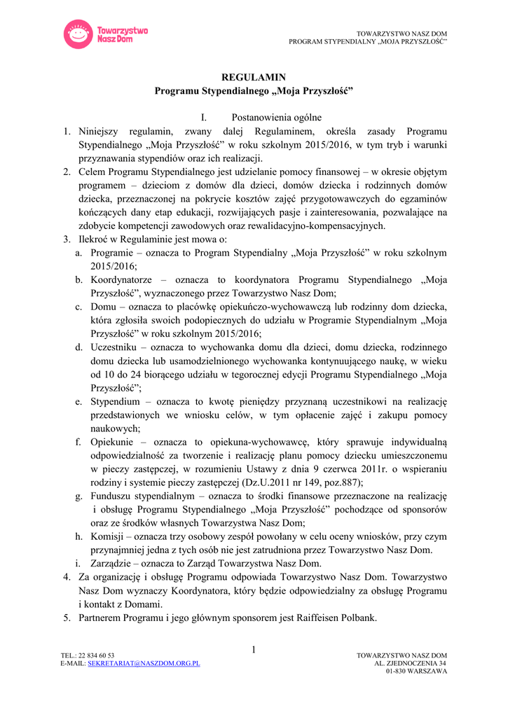 TOWARZYSTWO NASZ DOM PROGRAM STYPENDIALNY „MOJA PRZYSZŁOŚĆ” REGULAMIN Programu Stypendialnego „Moja Przyszłość” 1. 2. 3. 4. 5. I. Postanowienia ogólne Niniejszy regulamin, zwany dalej Regulaminem, określa zasady Programu Stypendialnego „Moja Przyszłość” w roku szkolnym 2015/2016, w tym tryb i warunki przyznawania stypendiów oraz ich realizacji. Celem Programu Stypendialnego jest udzielanie pomocy finansowej – w okresie objętym programem – dzieciom z domów dla dzieci, domów dziecka i rodzinnych domów dziecka, przeznaczonej na pokrycie kosztów zajęć przygotowawczych do egzaminów kończących dany etap edukacji, rozwijających pasje i zainteresowania, pozwalające na zdobycie kompetencji zawodowych oraz rewalidacyjno-kompensacyjnych. Ilekroć w Regulaminie jest mowa o: a. Programie – oznacza to Program Stypendialny „Moja Przyszłość” w roku szkolnym 2015/2016; b. Koordynatorze – oznacza to koordynatora Programu Stypendialnego „Moja Przyszłość”, wyznaczonego przez Towarzystwo Nasz Dom; c. Domu – oznacza to placówkę opiekuńczo-wychowawczą lub rodzinny dom dziecka, która zgłosiła swoich podopiecznych do udziału w Programie Stypendialnym „Moja Przyszłość” w roku szkolnym 2015/2016; d. Uczestniku – oznacza to wychowanka domu dla dzieci, domu dziecka, rodzinnego domu dziecka lub usamodzielnionego wychowanka kontynuującego naukę, w wieku od 10 do 24 biorącego udziału w tegorocznej edycji Programu Stypendialnego „Moja Przyszłość”; e. Stypendium – oznacza to kwotę pieniędzy przyznaną uczestnikowi na realizację przedstawionych we wniosku celów, w tym opłacenie zajęć i zakupu pomocy naukowych; f. Opiekunie – oznacza to opiekuna-wychowawcę, który sprawuje indywidualną odpowiedzialność za tworzenie i realizację planu pomocy dziecku umieszczonemu w pieczy zastępczej, w rozumieniu Ustawy z dnia 9 czerwca 2011r. o wspieraniu rodziny i systemie pieczy zastępczej (Dz.U.2011 nr 149, poz.887); g. Funduszu stypendialnym – oznacza to środki finansowe przeznaczone na realizację i obsługę Programu Stypendialnego „Moja Przyszłość” pochodzące od sponsorów oraz ze środków własnych Towarzystwa Nasz Dom; h. Komisji – oznacza trzy osobowy zespół powołany w celu oceny wniosków, przy czym przynajmniej jedna z tych osób nie jest zatrudniona przez Towarzystwo Nasz Dom. i. Zarządzie – oznacza to Zarząd Towarzystwa Nasz Dom. Za organizację i obsługę Programu odpowiada Towarzystwo Nasz Dom. Towarzystwo Nasz Dom wyznaczy Koordynatora, który będzie odpowiedzialny za obsługę Programu i kontakt z Domami. Partnerem Programu i jego głównym sponsorem jest Raiffeisen Polbank. TEL.: 22 834 60 53 E-MAIL: [email protected] 1 TOWARZYSTWO NASZ DOM AL. ZJEDNOCZENIA 34 01-830 WARSZAWA TOWARZYSTWO NASZ DOM PROGRAM STYPENDIALNY „MOJA PRZYSZŁOŚĆ” 1. 1. 2. 3. 4. 5. 6. 7. II. Zasady przystąpienia do Programu Dom, który chce zgłosić swoich wychowanków do Programu, w wyznaczonym terminie przesyła do Towarzystwa Nasz Dom wypełniony i podpisany przez dyrektora Formularz Zgłoszeniowy drogą mailową (na adres: [email protected]) oraz pocztą na adres Towarzystwo Nasz Dom, Aleja Zjednoczenia 34, 01-830 Warszawa z dopiskiem „Moja Przyszłość” na kopercie i w tytule maila a. Na etapie zgłaszania nie ma konieczności podawania danych osobowych Uczestników, jedynie ich liczbę i formę oraz liczbę zajęć, w których będą brać udział. III. Tryb przyznawania i realizacji Stypendium Po upłynięciu terminu zgłoszeń Koordynator przygotowuje bazę i dokonuje oceny wniosków pod względem formalnym. Zgłoszenia wysłane po upłynięciu terminu i/lub niekompletne nie będą brane pod uwagę. Wnioski poprawne pod względem formalnym podlegają ocenie merytorycznej, którą przeprowadza Komisja. Ocena merytoryczna wniosków obejmuje: a. zasadność przyznania Stypendium – przedstawiona w Formularzu Zgłoszeniowym argumentacja oraz ocena realizacji Stypendium w latach poprzednich (jeśli dotyczy); b. zasadność zaproponowanej kwoty. Podczas oceny wniosków pod względem merytorycznym Koordynator może kontaktować się z Domami w celu uzyskania dodatkowych informacji (mogą to być kontakty mailowe, telefoniczne lub osobiste – spotkania z potencjalnymi Uczestnikami Programu i/lub ich Opiekunami). Komisja przygotowuje sprawozdanie ze swoich obrad wraz z proponowaną listą przyznanych Stypendiów i przedkłada do zatwierdzenia Zarządowi. Koordynator informuje Domy o decyzji Zarządu pisemnie i przygotowuje umowy. Przyznane kwoty zostają przelane na konto Domu po podpisaniu umowy, w jednej transzy. Za rozdysponowanie pieniędzy, zgodnie z umową, odpowiedzialny jest Dyrektor Domu. Towarzystwo Nasz Dom zastrzega sobie możliwość wglądu w dokumenty Programu w dowolnym momencie jego trwania, przeprowadzenie monitoringu realizacji Programu telefonicznie lub osobiście. IV. Prawa i obowiązki Domu 1. Dyrektor Domu zgłaszającego swoich wychowanków do Programu w roku szkolnym 2015/2016 może wyznaczyć osobę odpowiedzialną za kontakty z Koordynatorem i koordynowanie realizacji Programu na terenie Domu lub robić to samemu. 2. Do obowiązków osoby, o której mowa w pkt.1 należy: a. wypełnienie i przesłanie wypełnionego Formularza Zgłoszeniowego; b. przesłanie podpisanej z umową z Dyrektorem Domu; c. dobór Uczestników w konsultacji z Opiekunami, podpisanie indywidualnych kontraktów z Uczestnikami; d. koordynowanie przebiegu Programu w Domu, prowadzenia bieżącej dokumentacji; TEL.: 22 834 60 53 E-MAIL: [email protected] 2 TOWARZYSTWO NASZ DOM AL. ZJEDNOCZENIA 34 01-830 WARSZAWA TOWARZYSTWO NASZ DOM PROGRAM STYPENDIALNY „MOJA PRZYSZŁOŚĆ” e. udostępnienie Koordynatorowi dokumentów Programu (umowy z prowadzącymi zajęcia, harmonogramu zajęć, poświadczenia odbycia zajęć, kontraktów z Uczestnikami) w dowolnym momencie trwania Programu; f. przygotowanie i przesłanie, wed